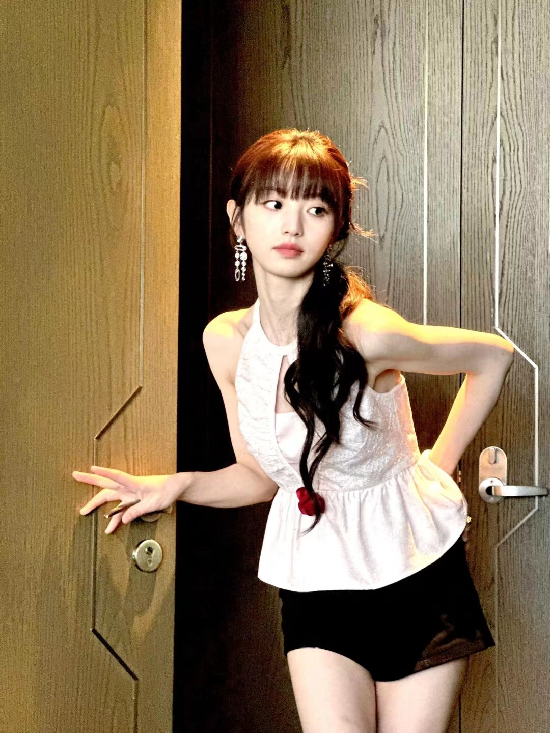 田曦薇明星2023同款甜美粉色掛頸式褶皺修身露腰顯瘦吊帶背心上衣