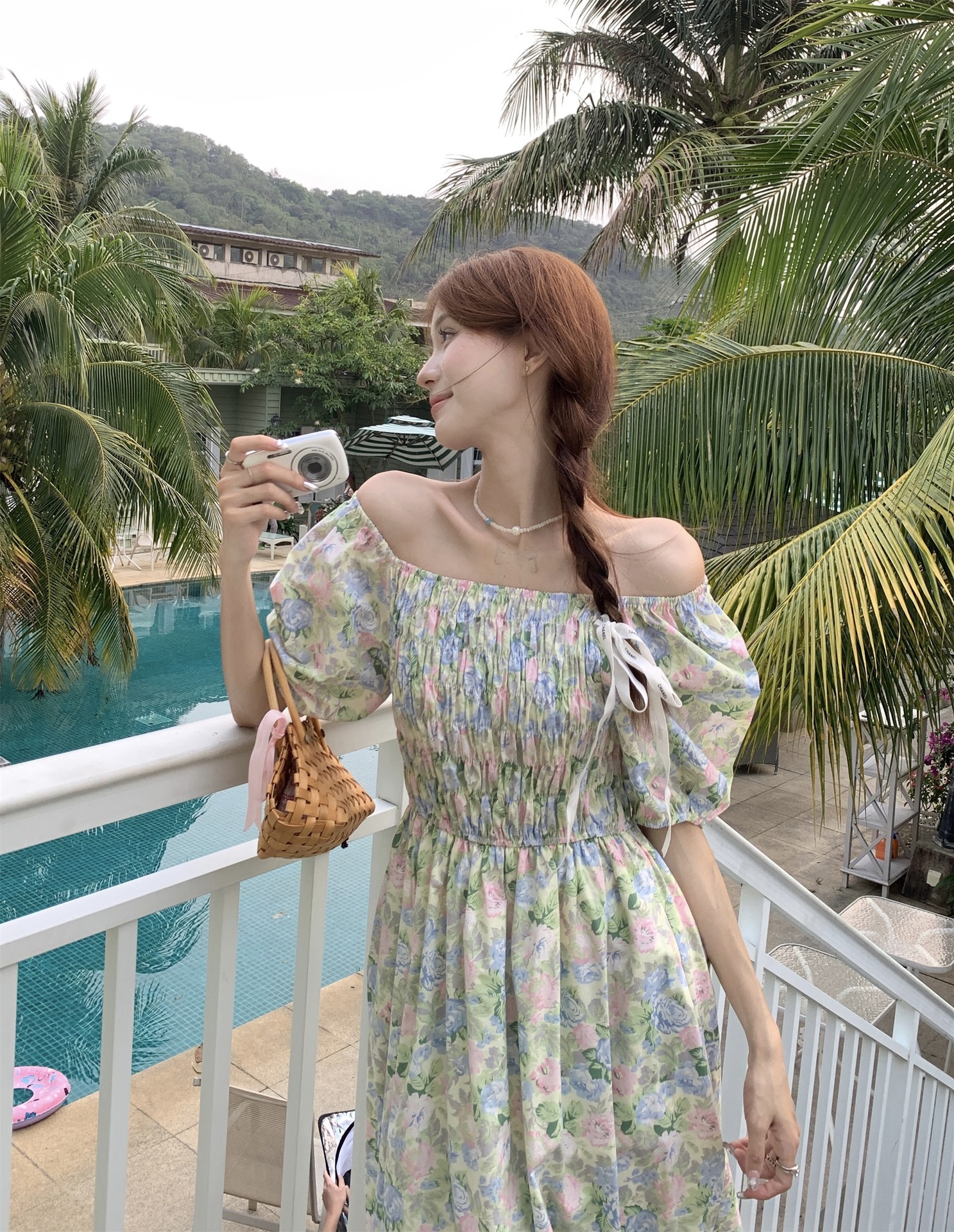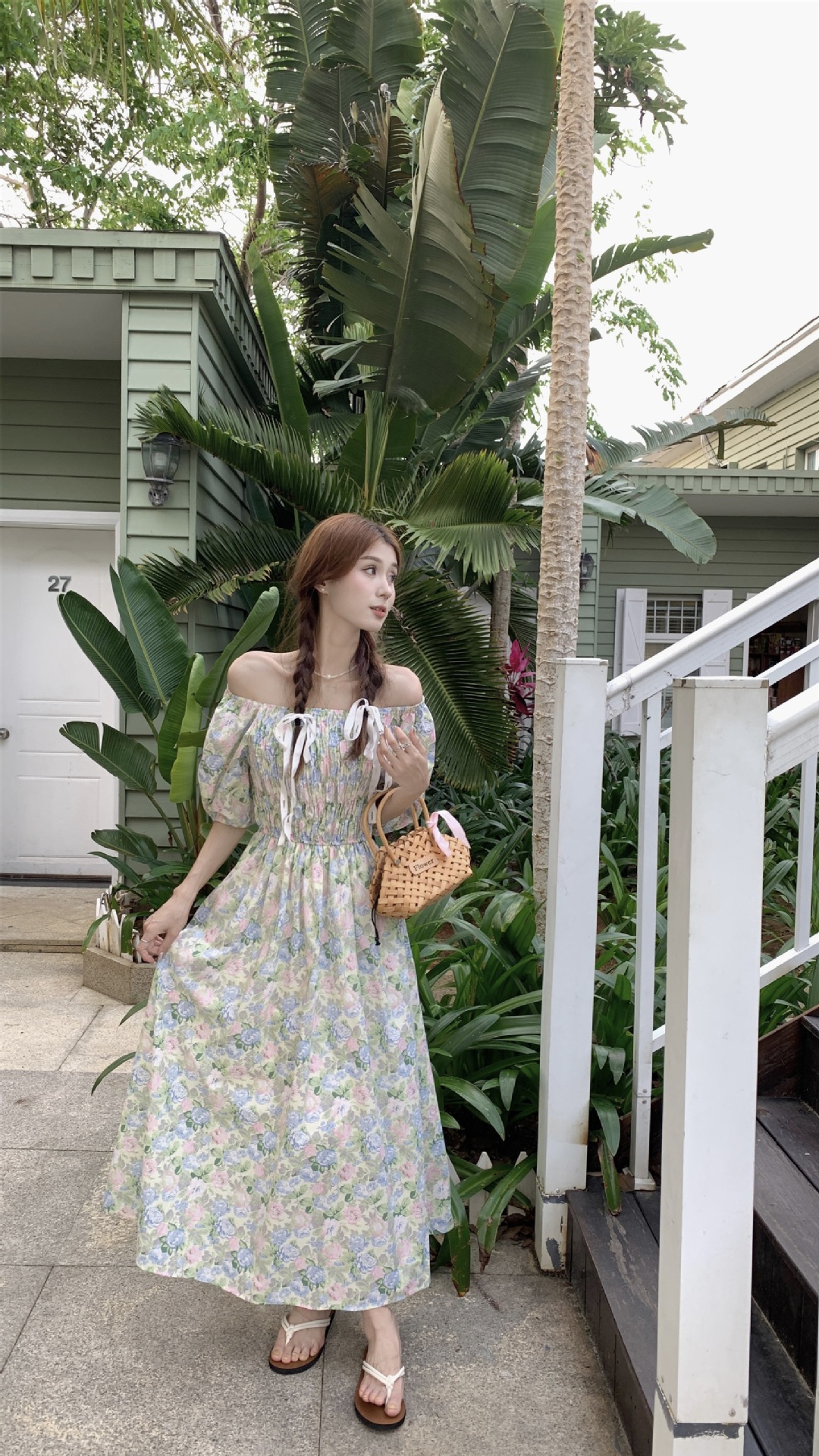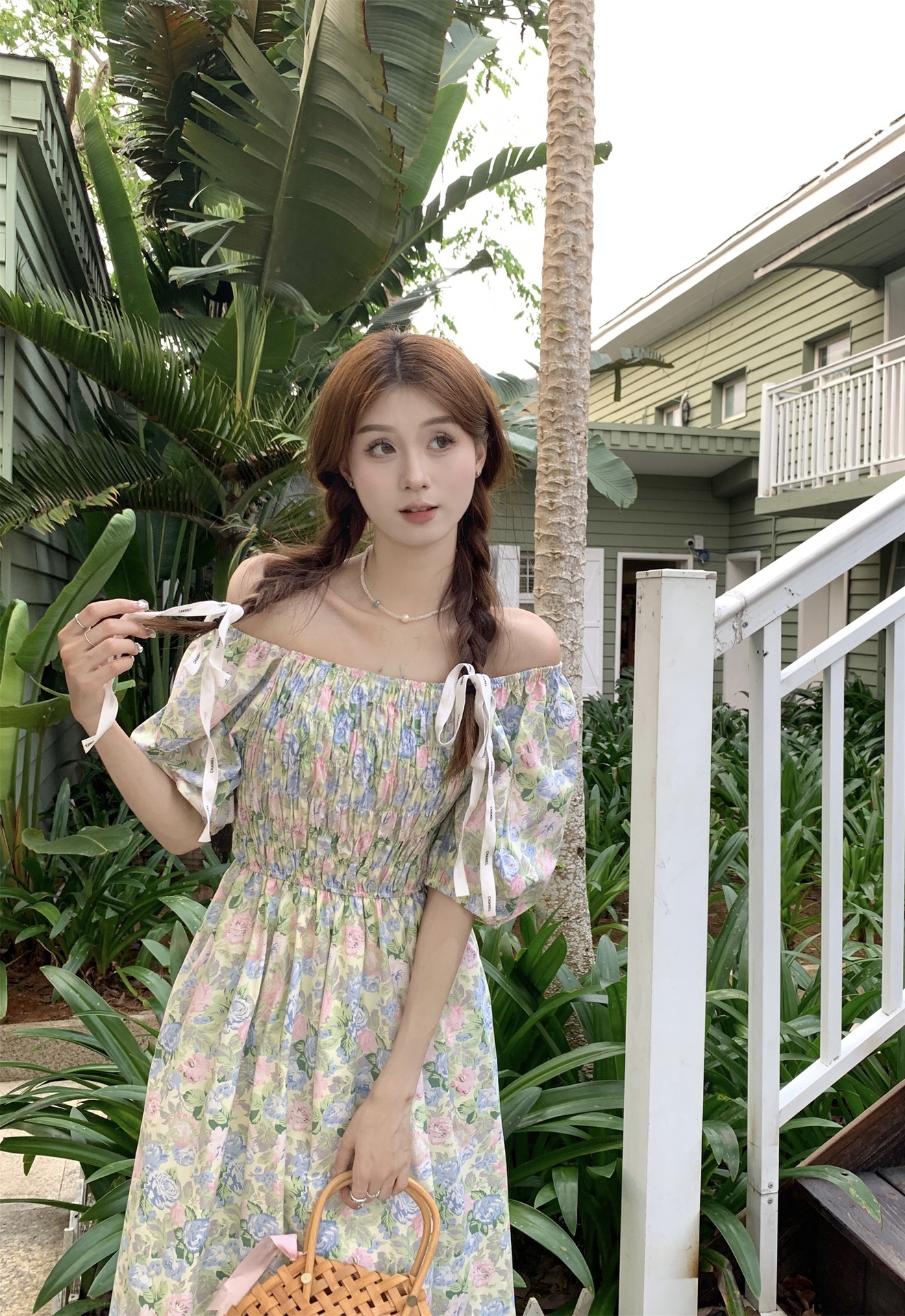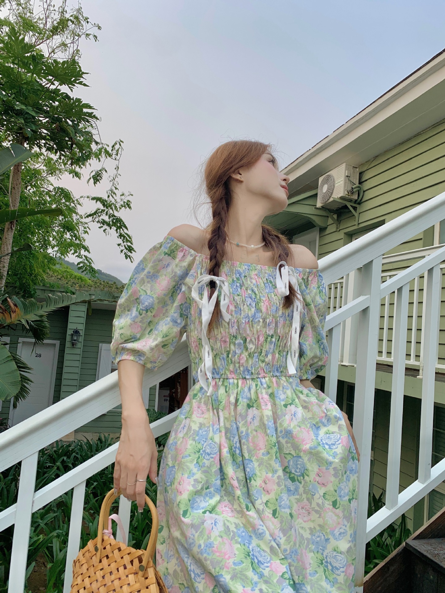 实拍~韩风chic 小众茶歇褶皱方领一字肩高腰碎花中长款连衣裙