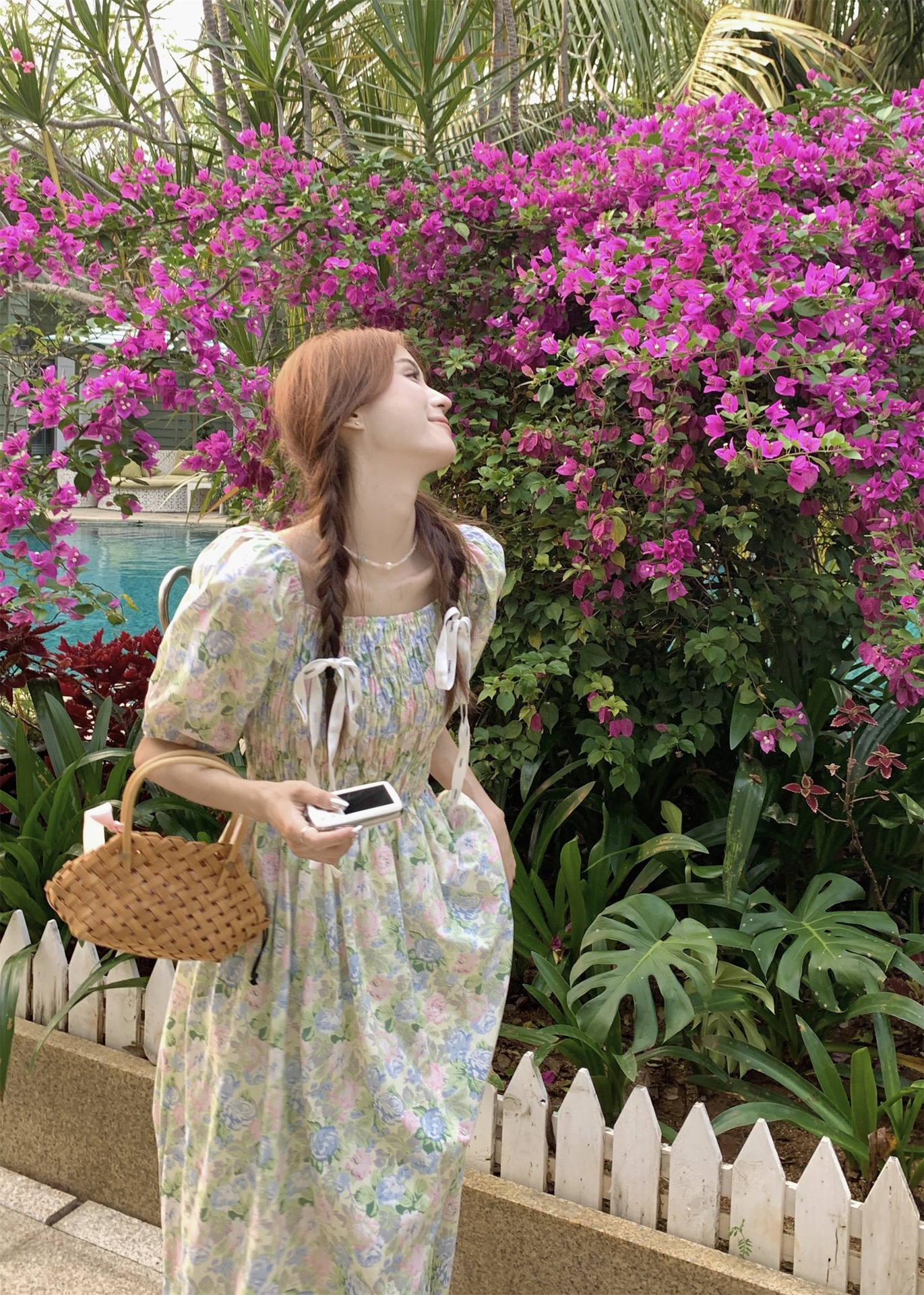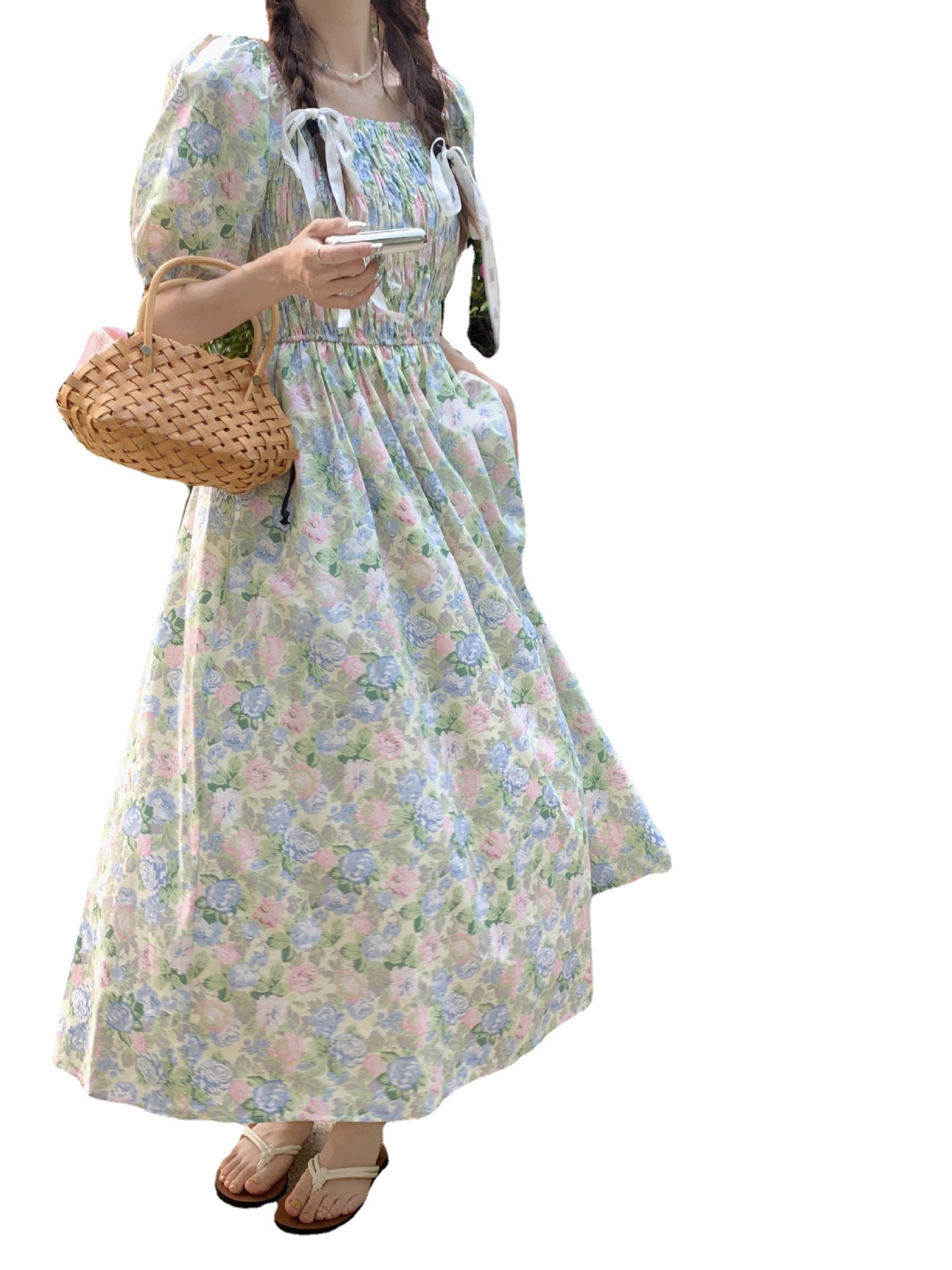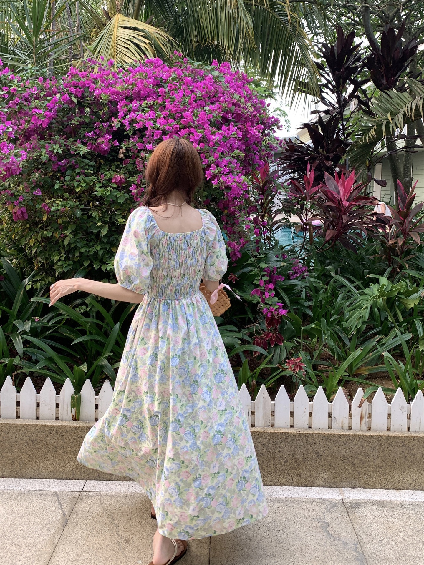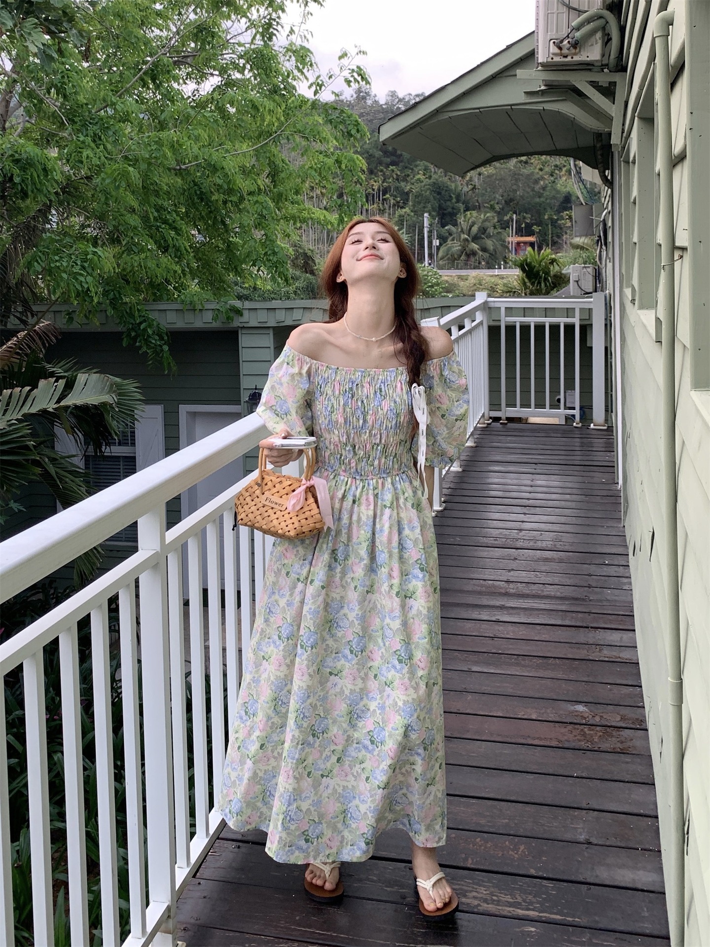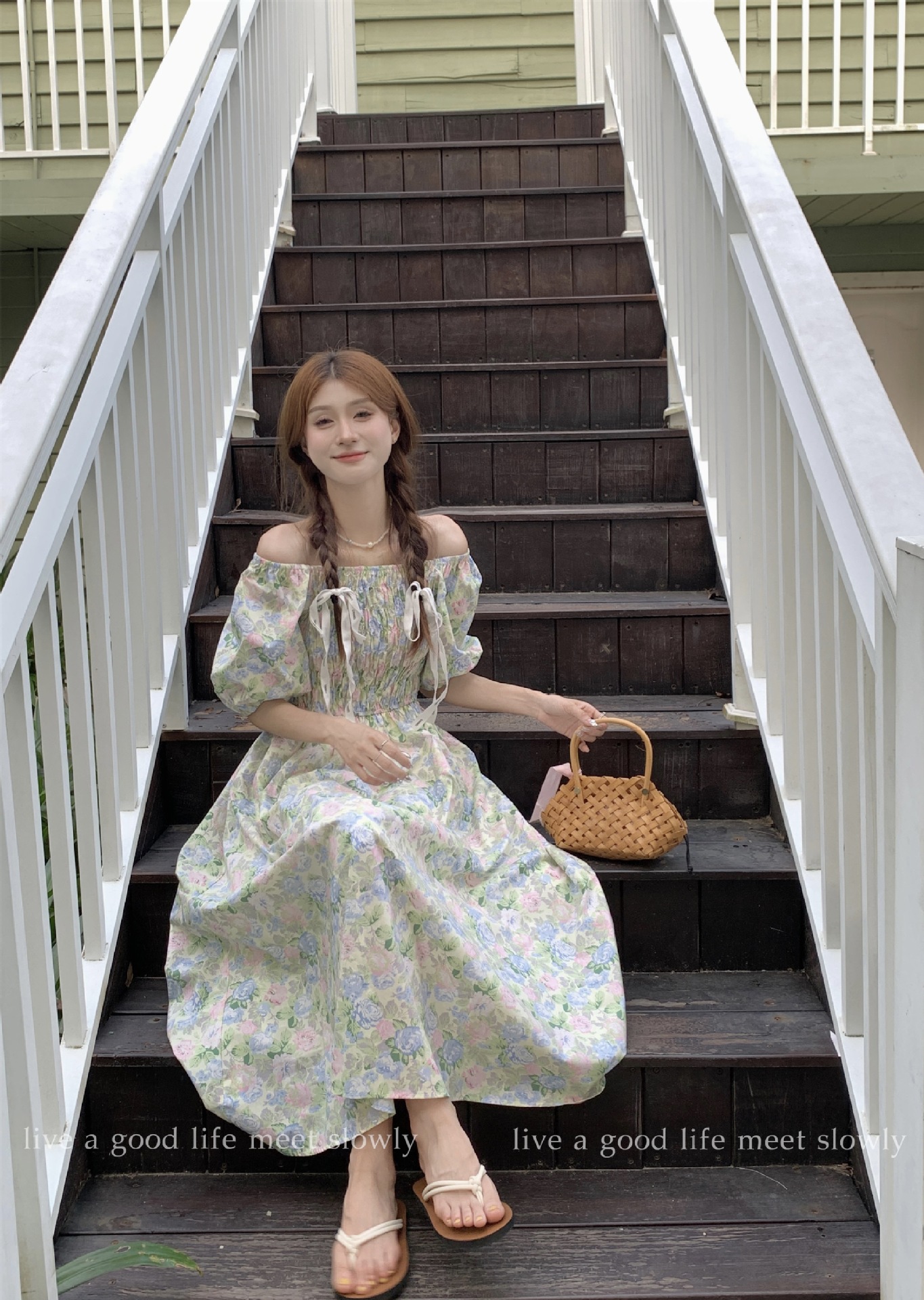 实拍~韩风chic 小众茶歇褶皱方领一字肩高腰碎花中长款连衣裙