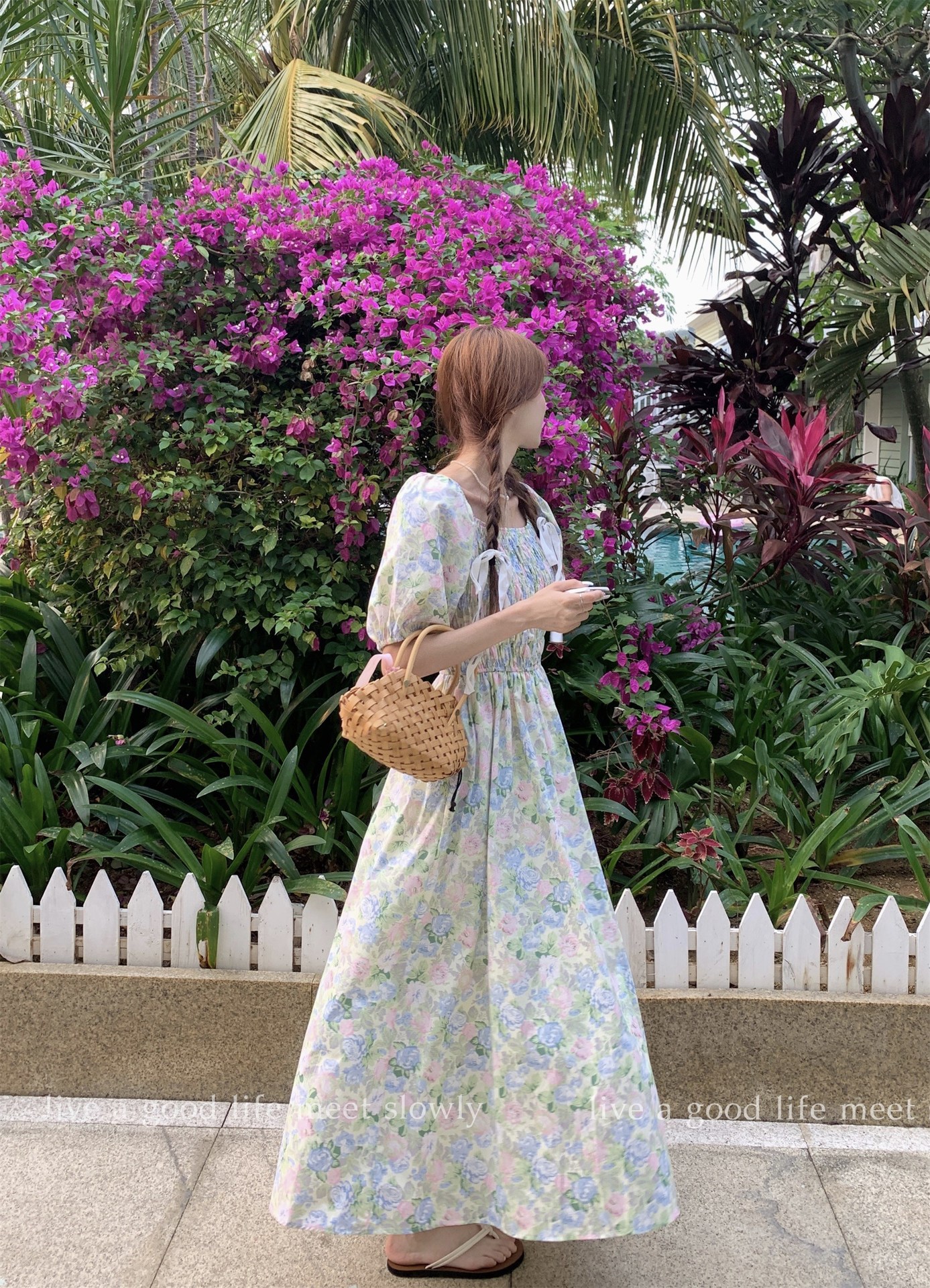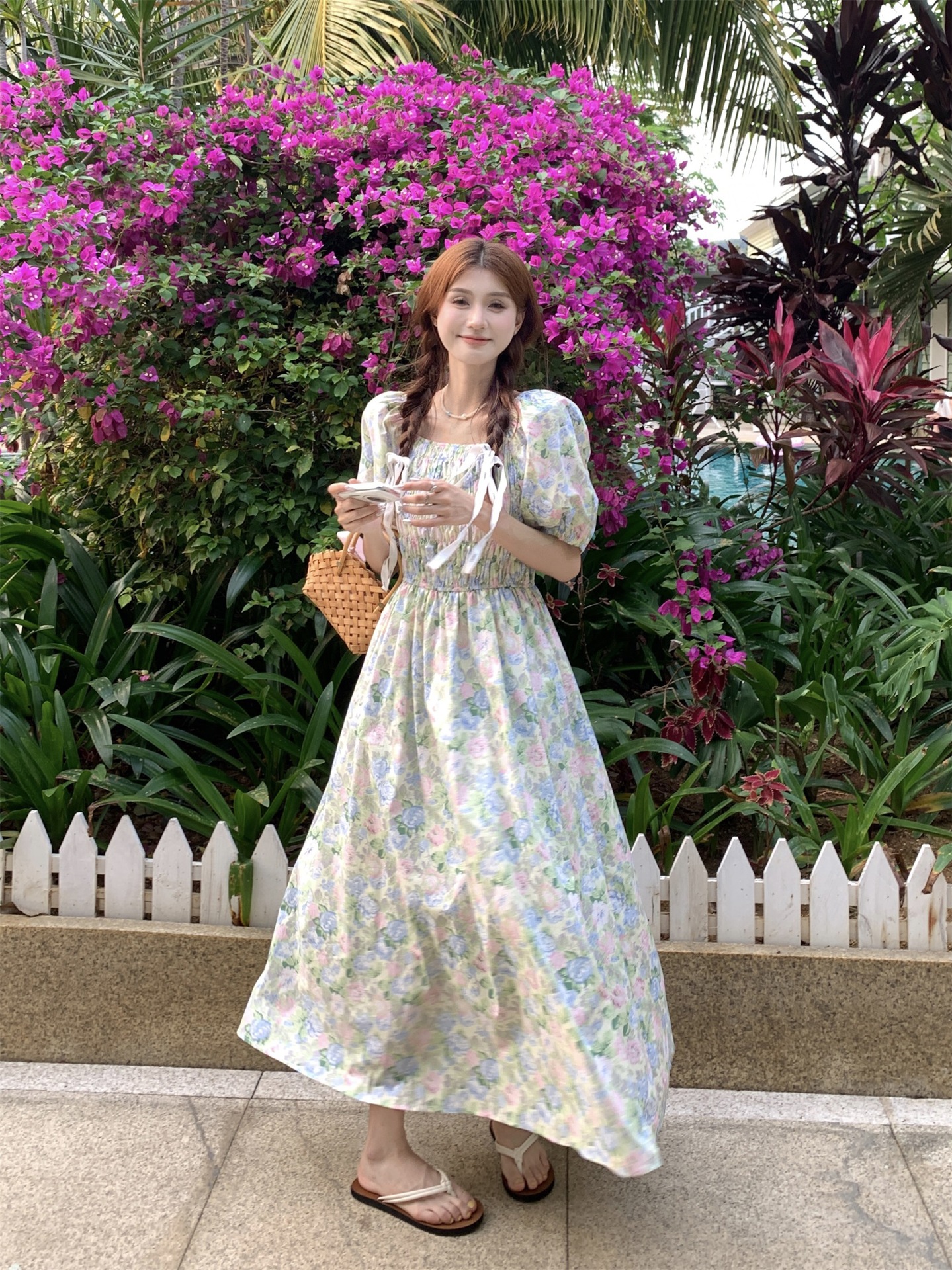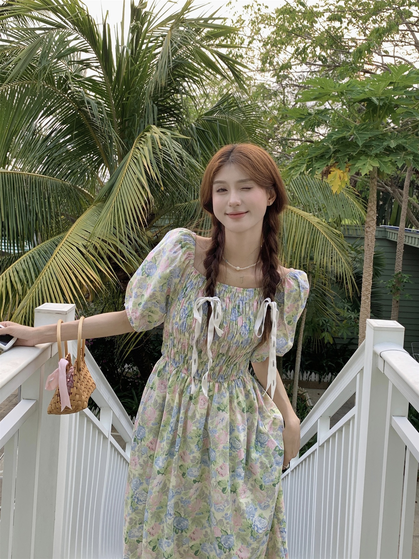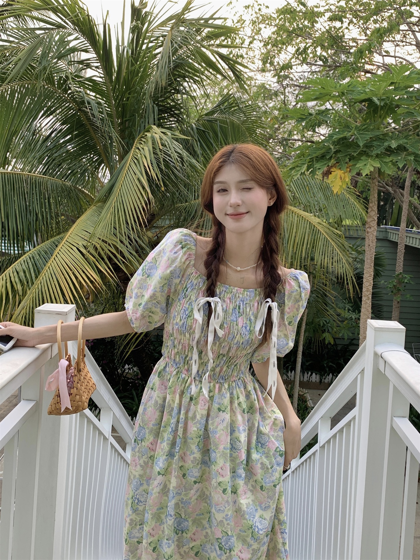 实拍~韩风chic 小众茶歇褶皱方领一字肩高腰碎花中长款连衣裙