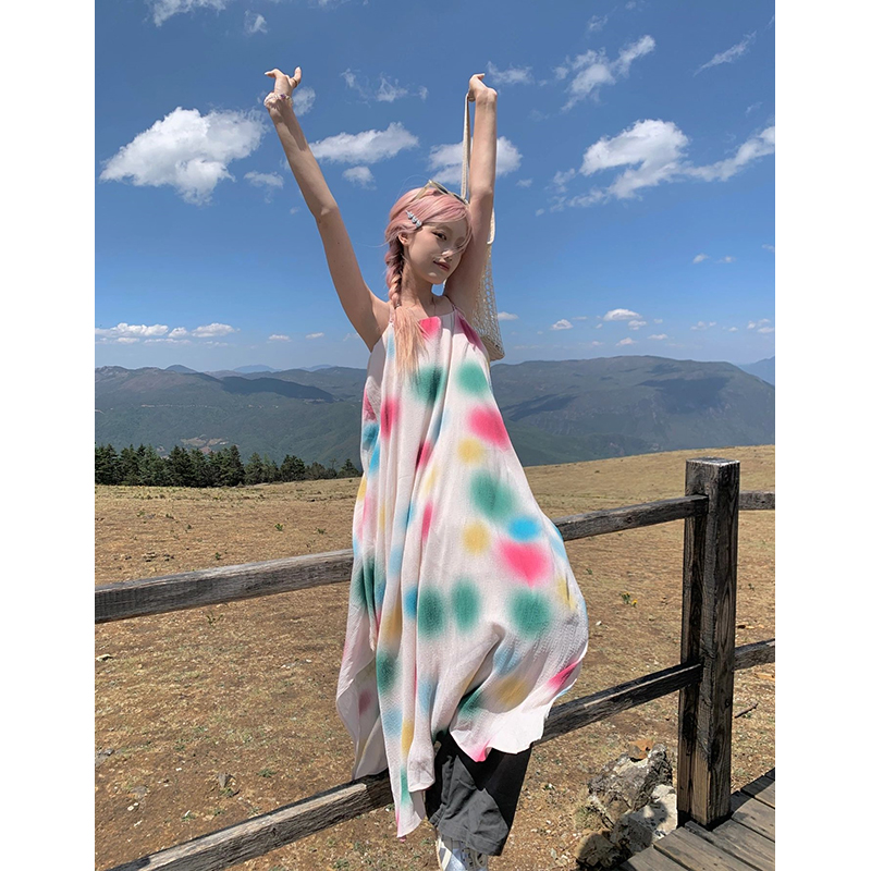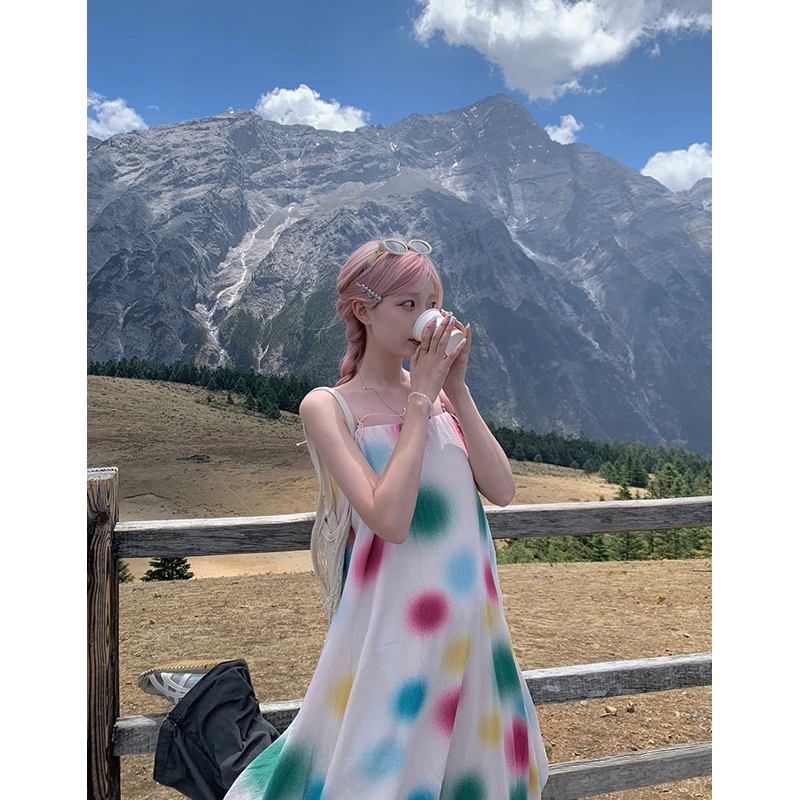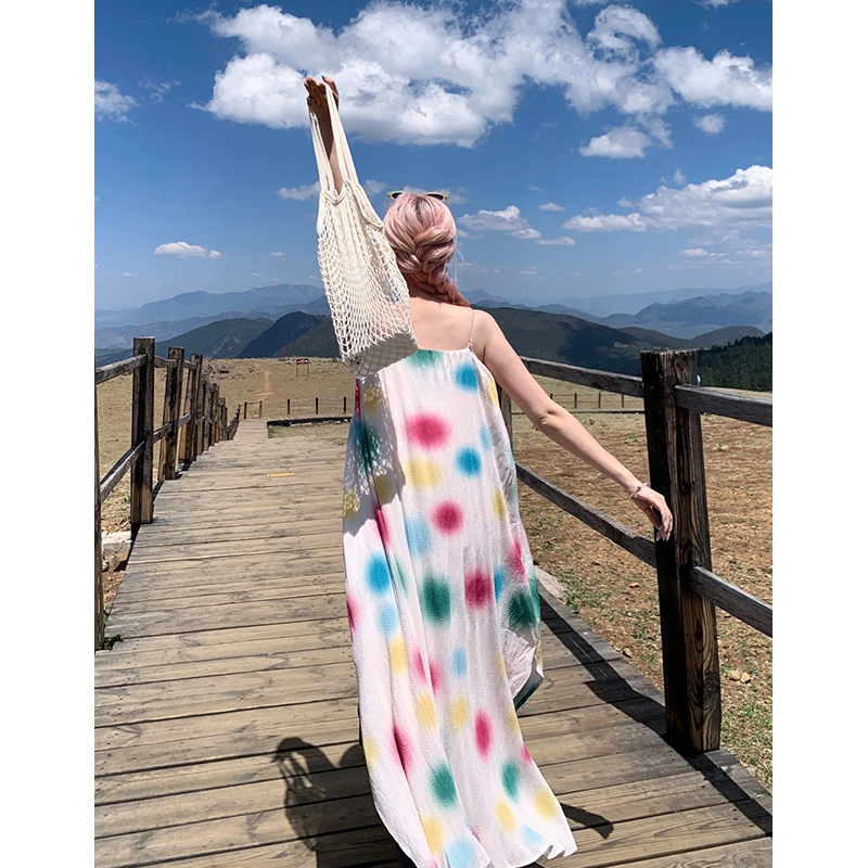 懶人舒適吊帶洋裝 度假風波點沙灘裙2023夏季小眾設計寬鬆長裙