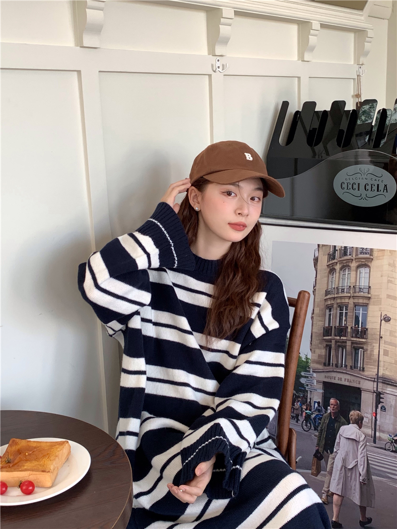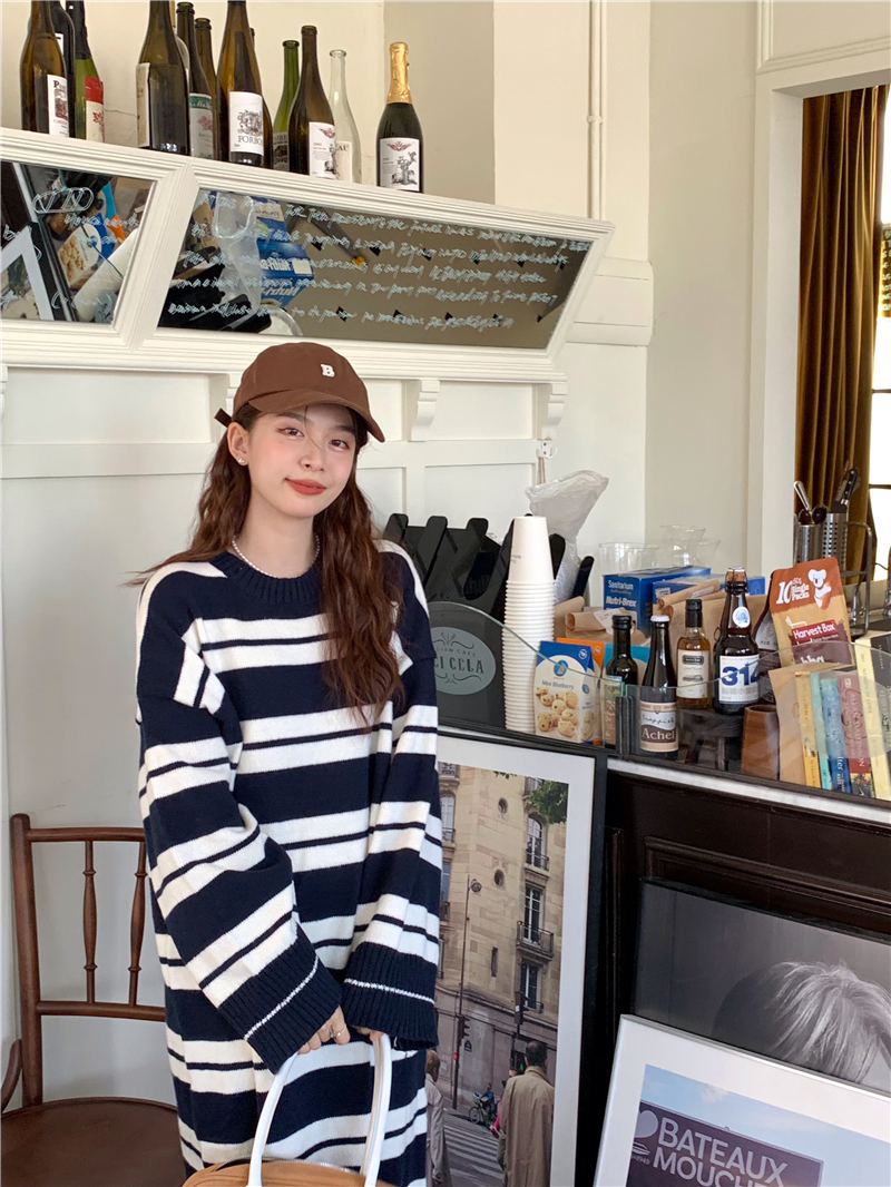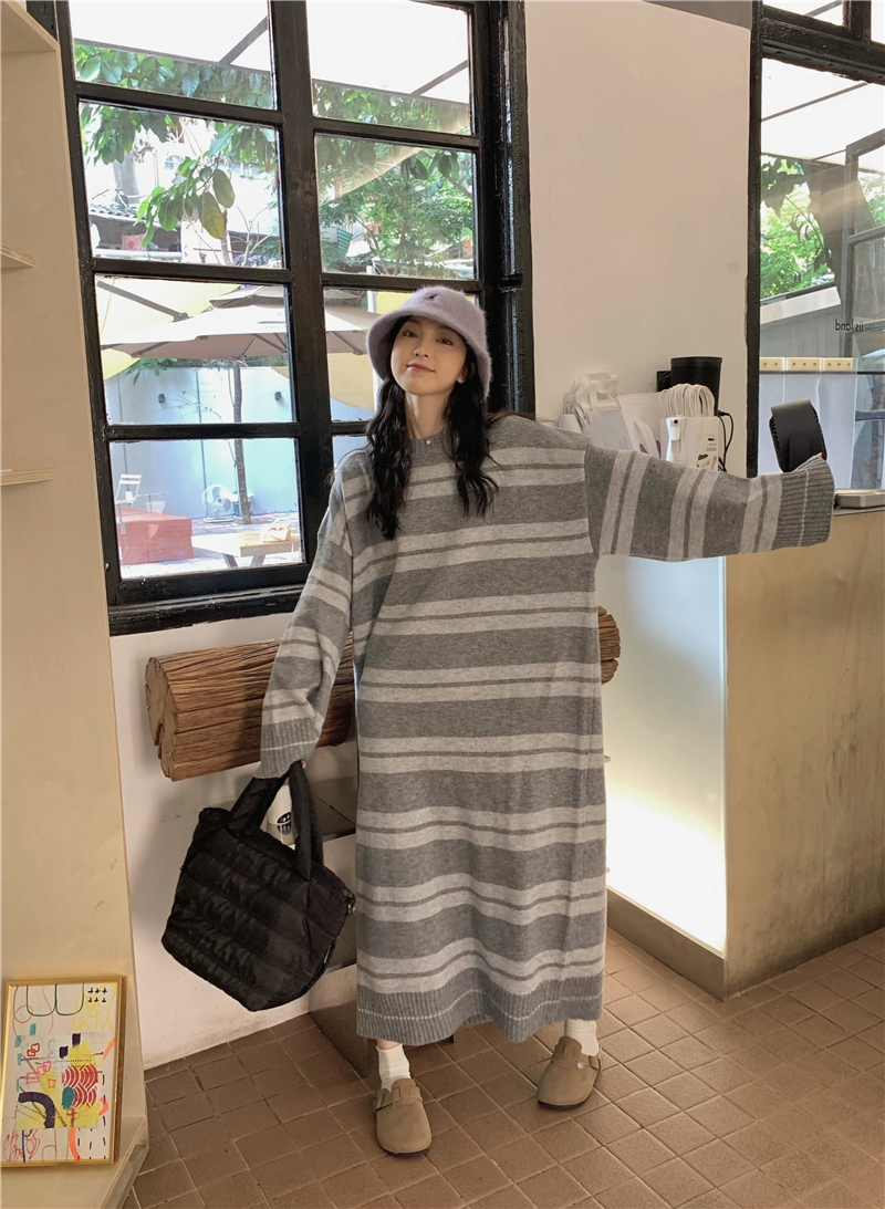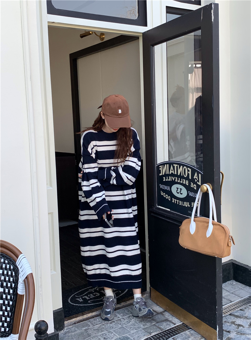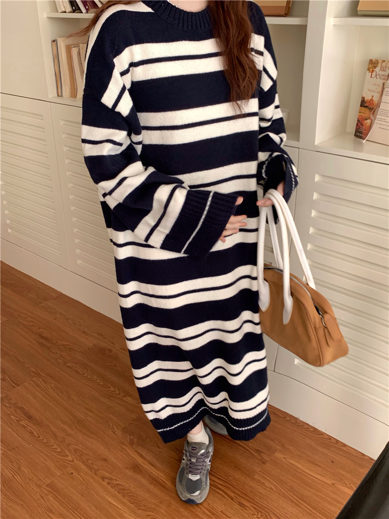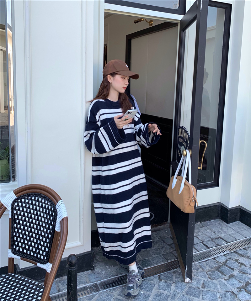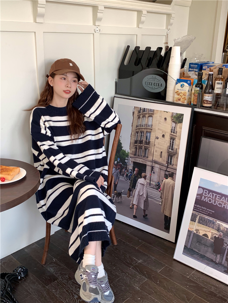 kumikumi港味復古條紋針織洋裝女秋季寬鬆顯瘦長袖毛衣裙長裙子