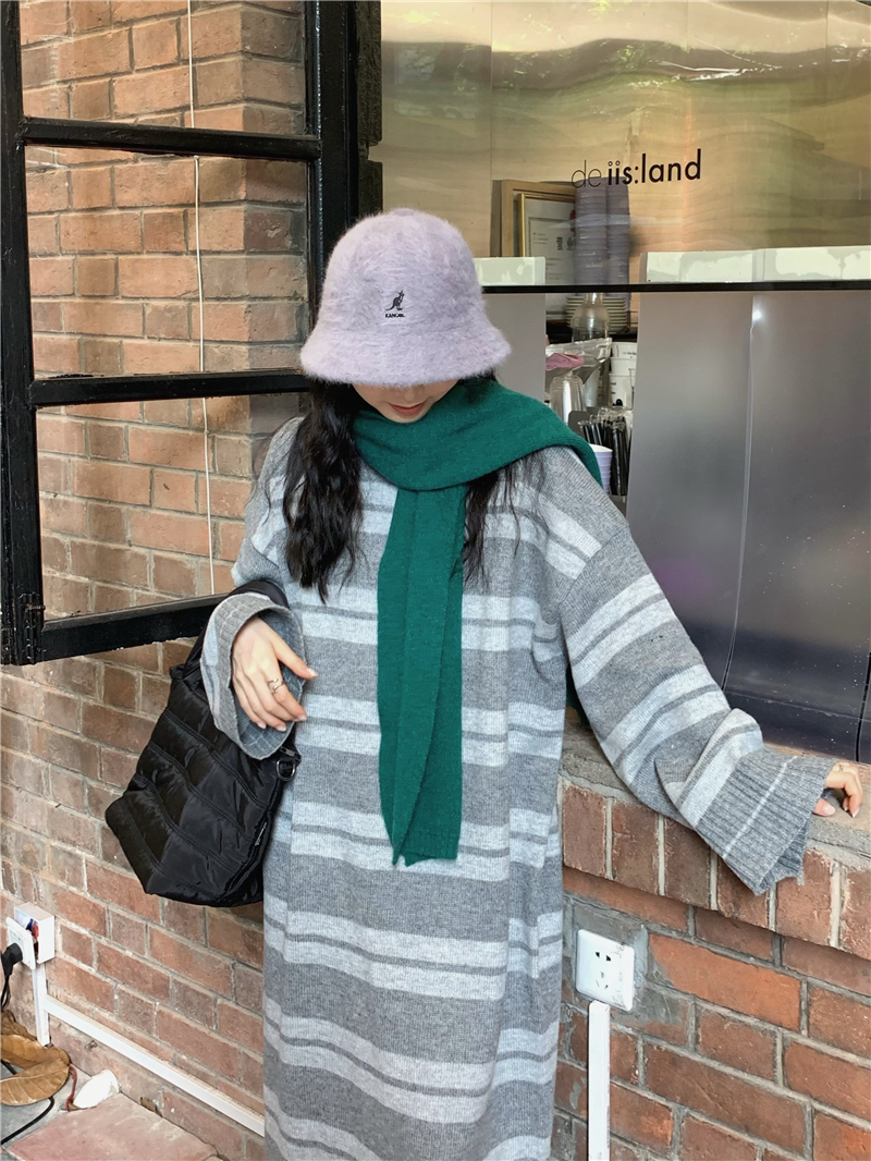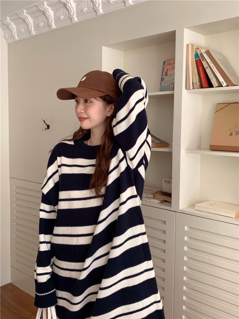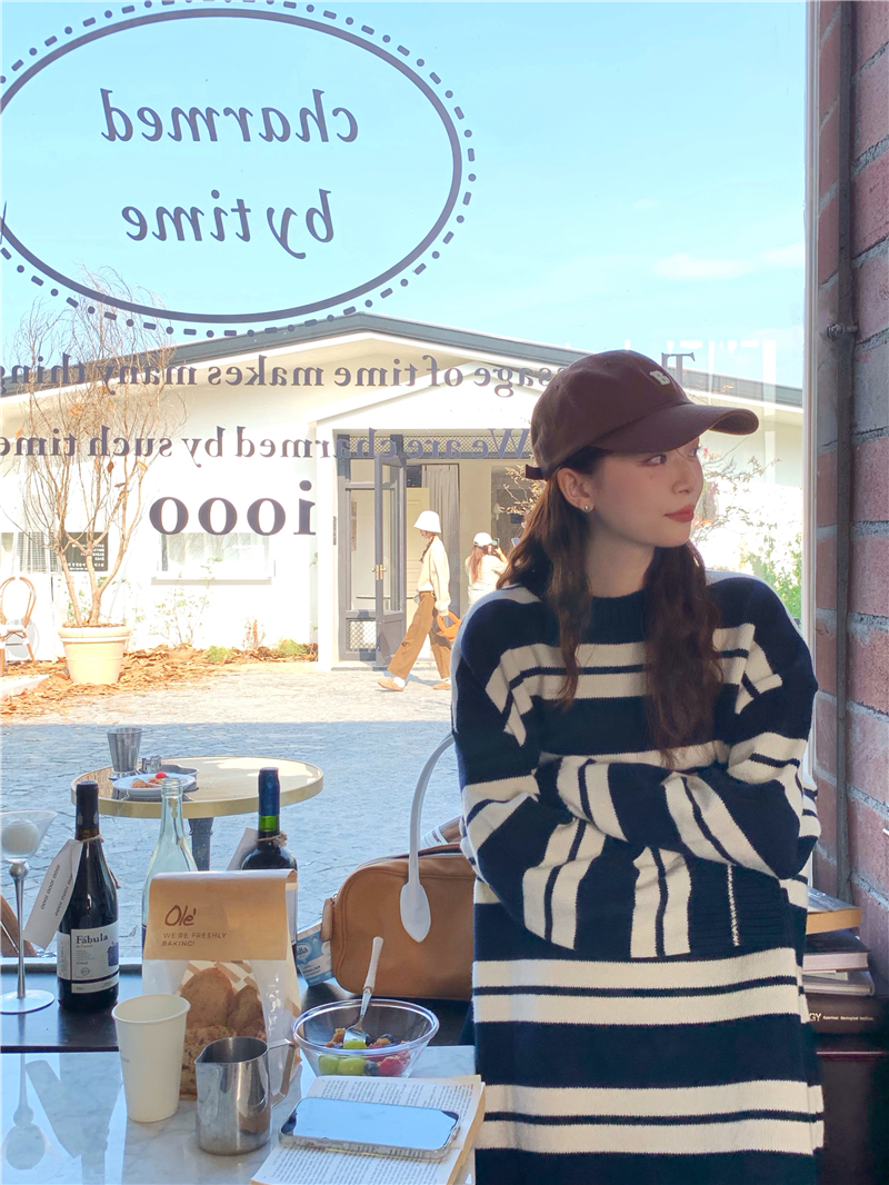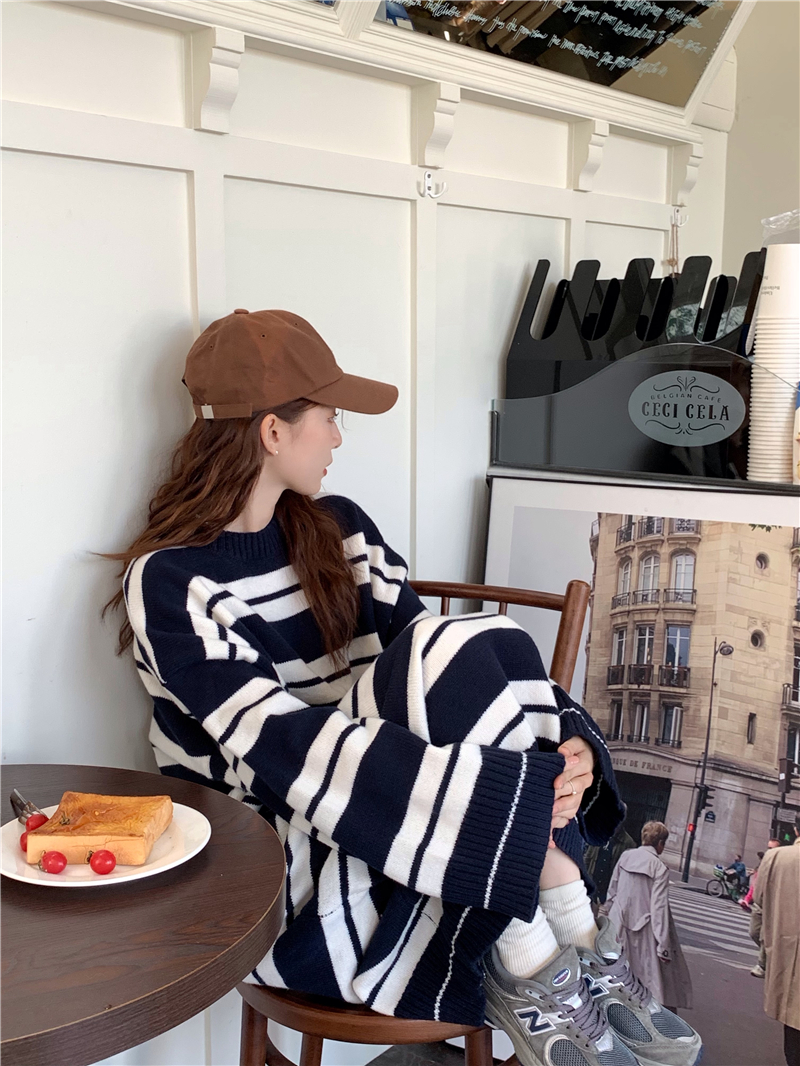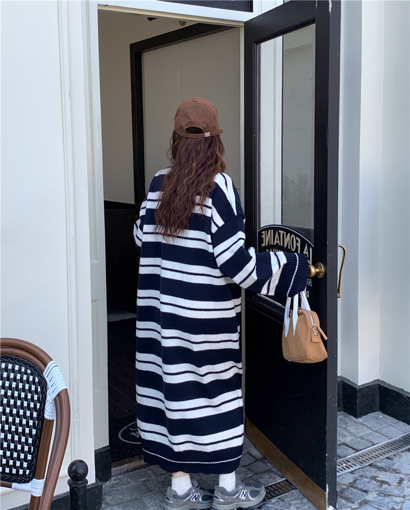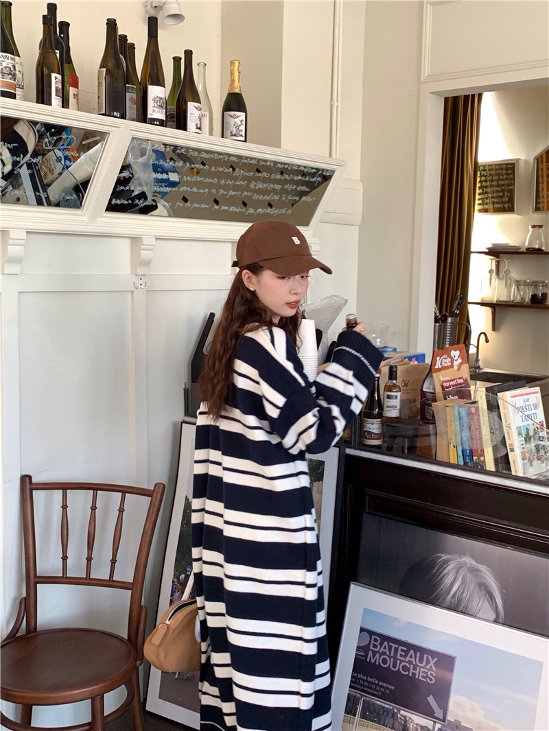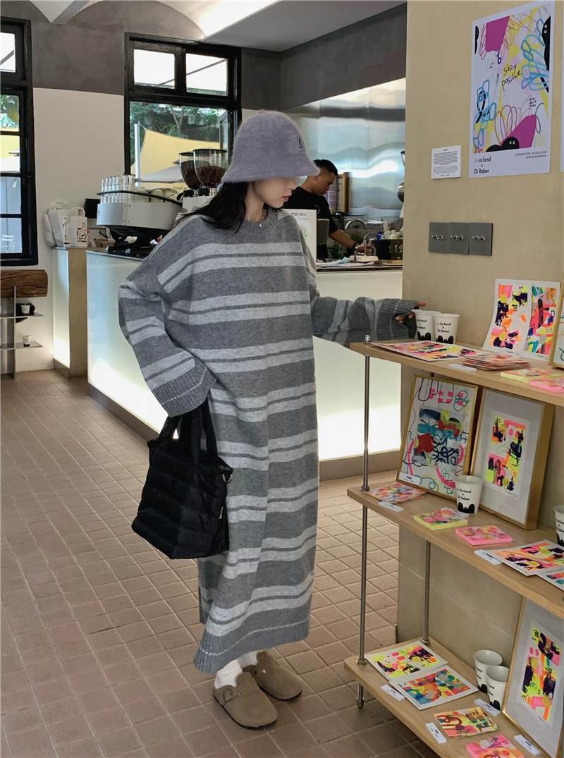 kumikumi港味復古條紋針織洋裝女秋季寬鬆顯瘦長袖毛衣裙長裙子