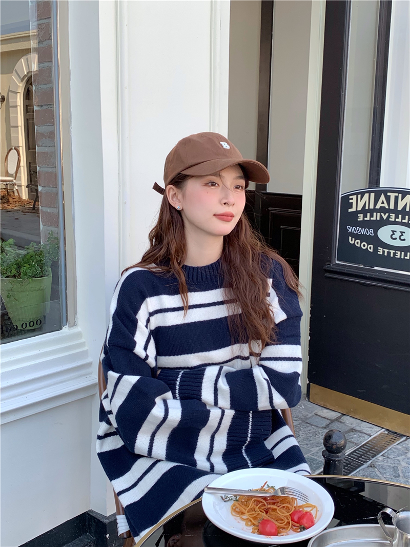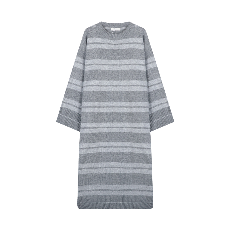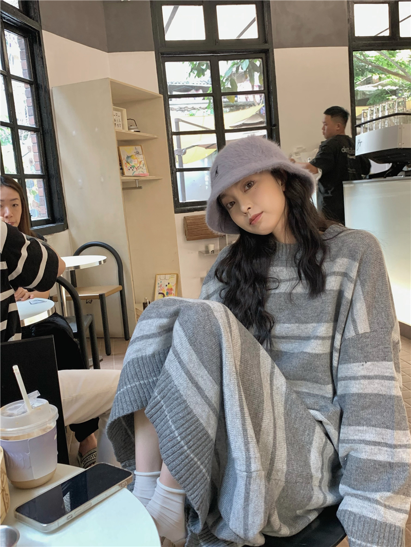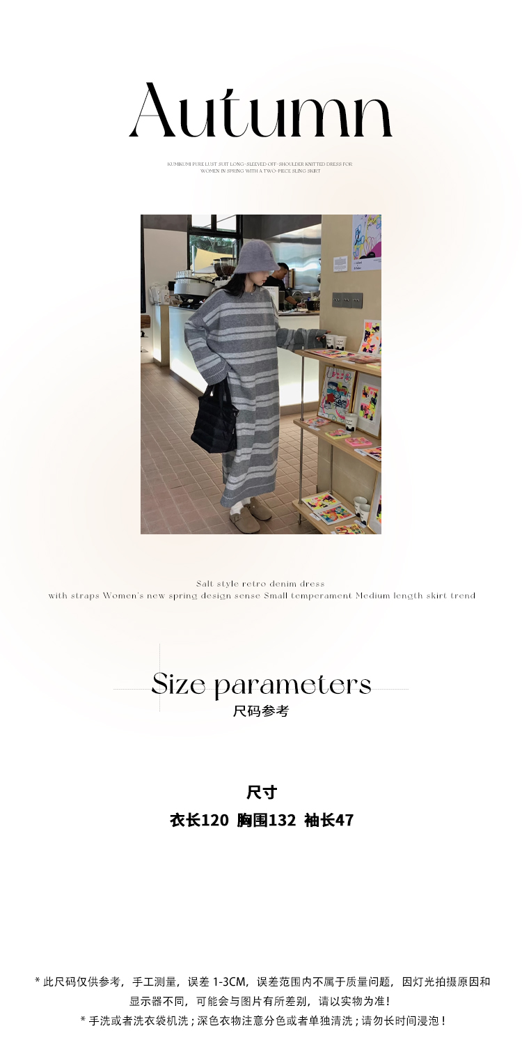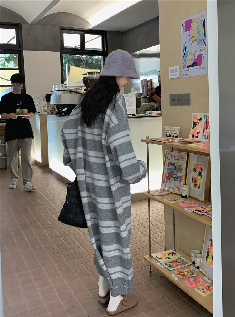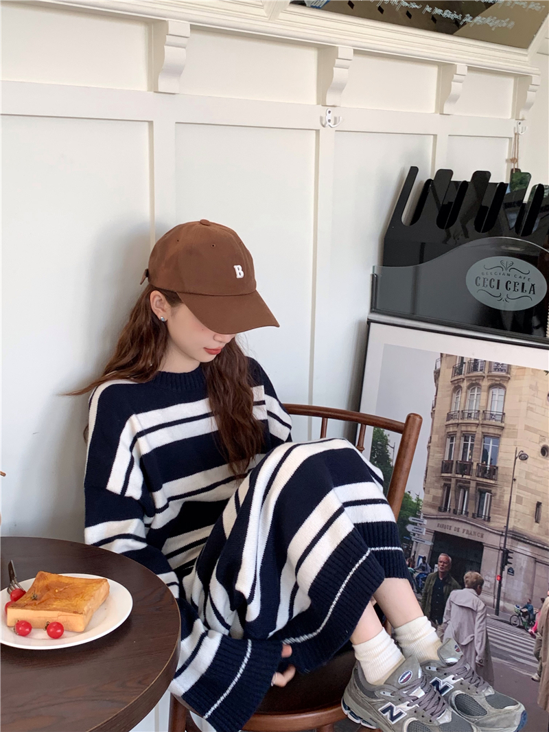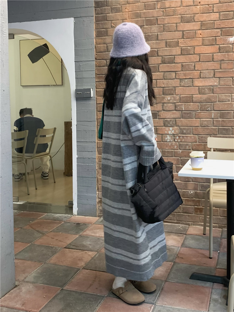 kumikumi港味復古條紋針織洋裝女秋季寬鬆顯瘦長袖毛衣裙長裙子