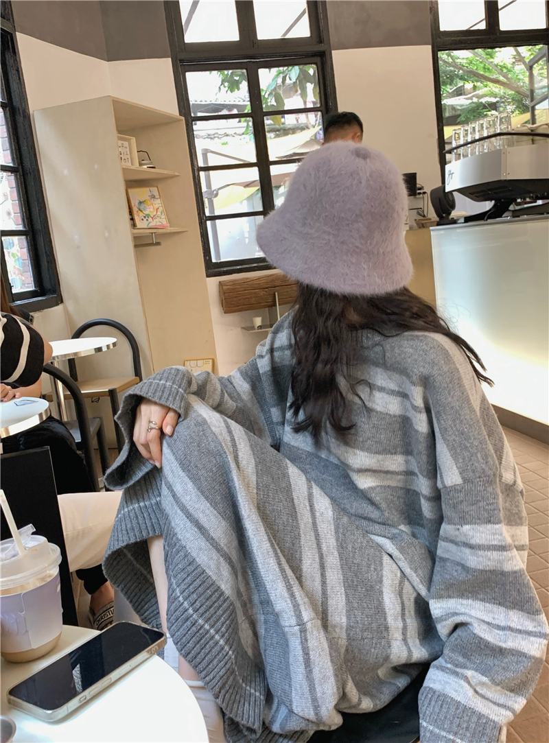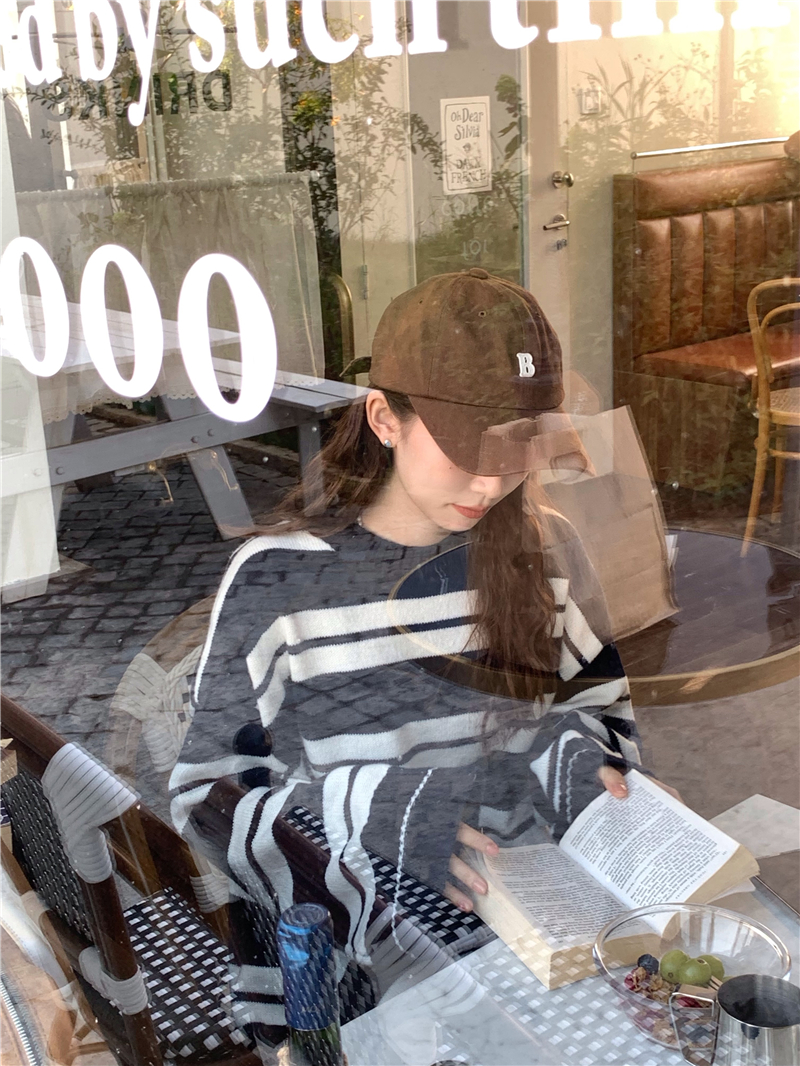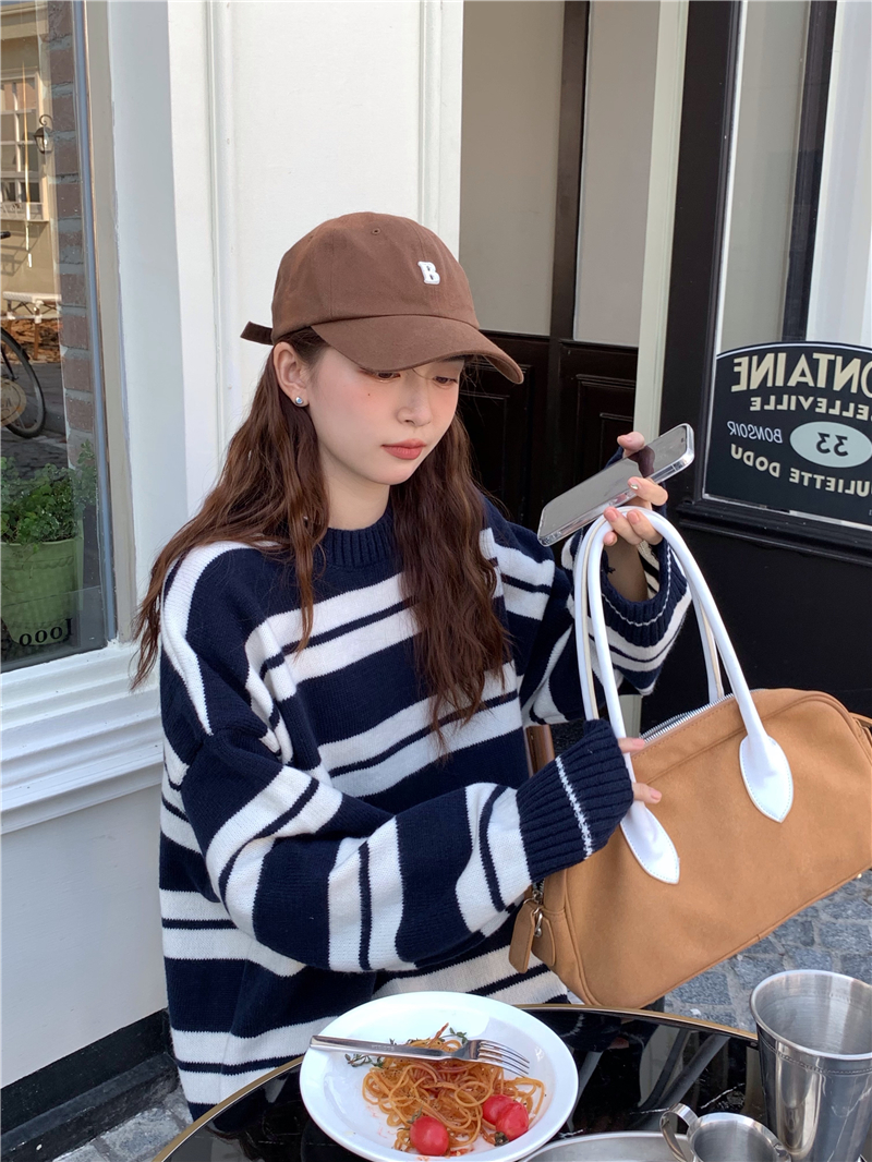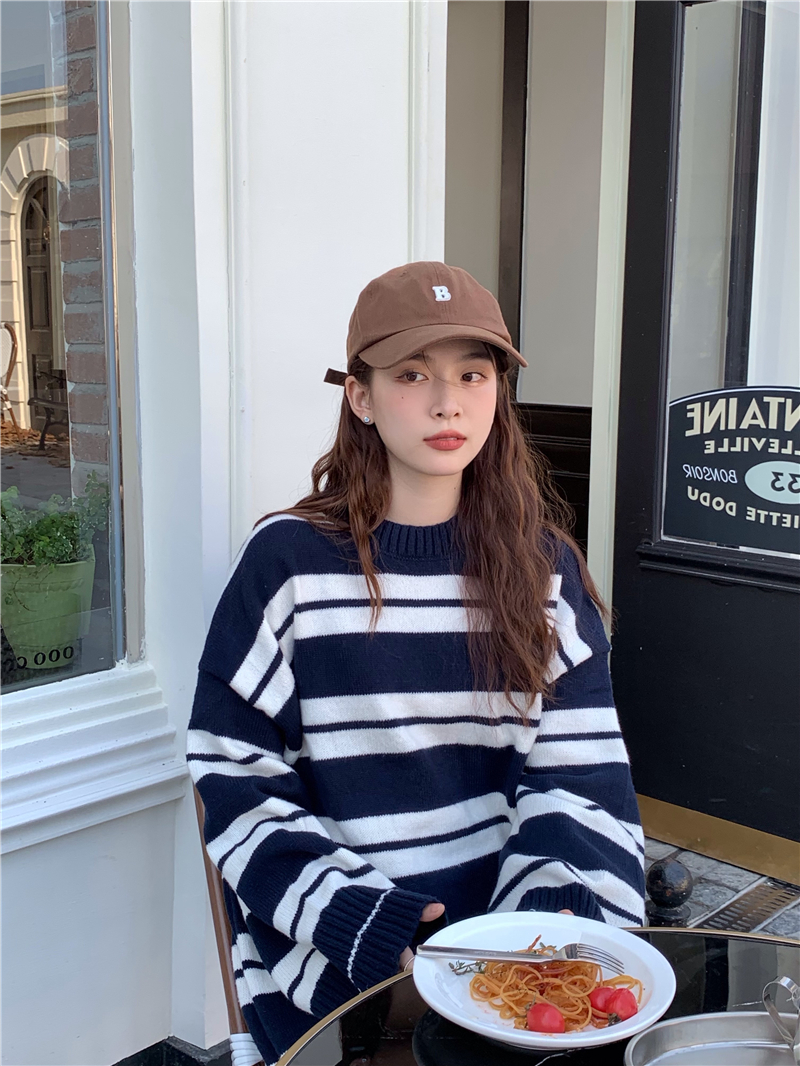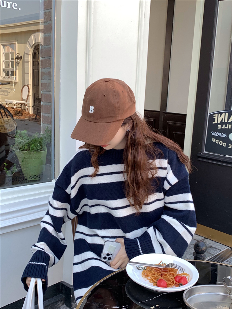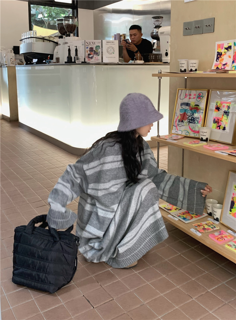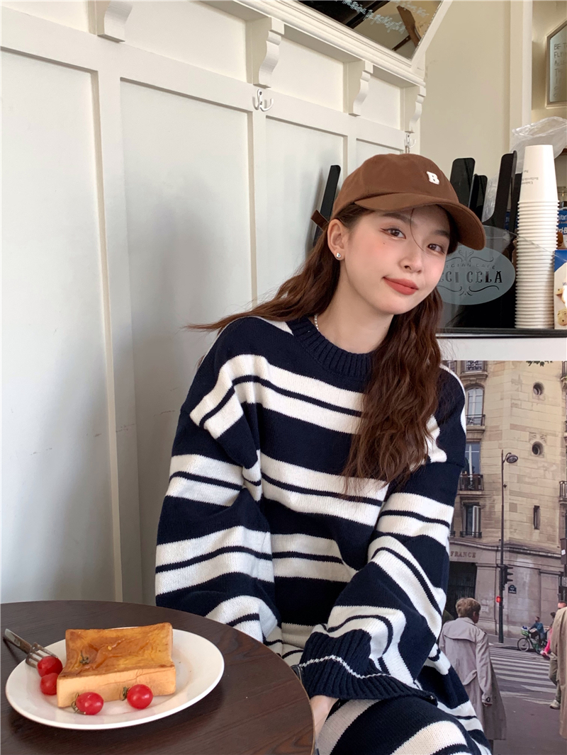 kumikumi港味復古條紋針織洋裝女秋季寬鬆顯瘦長袖毛衣裙長裙子