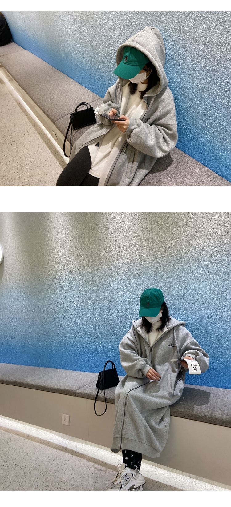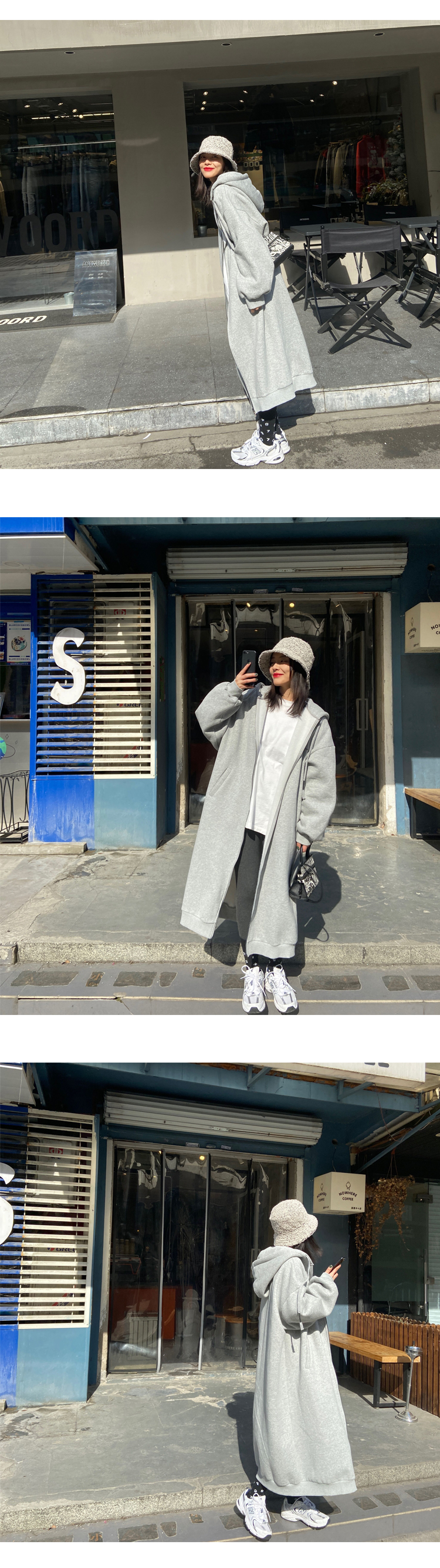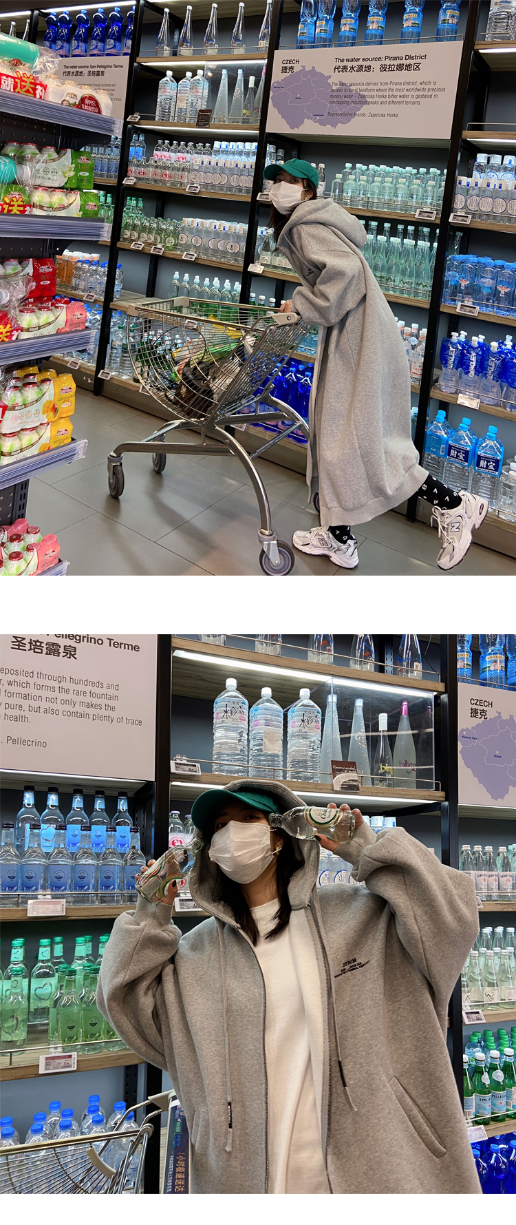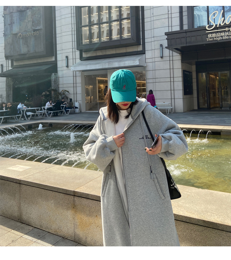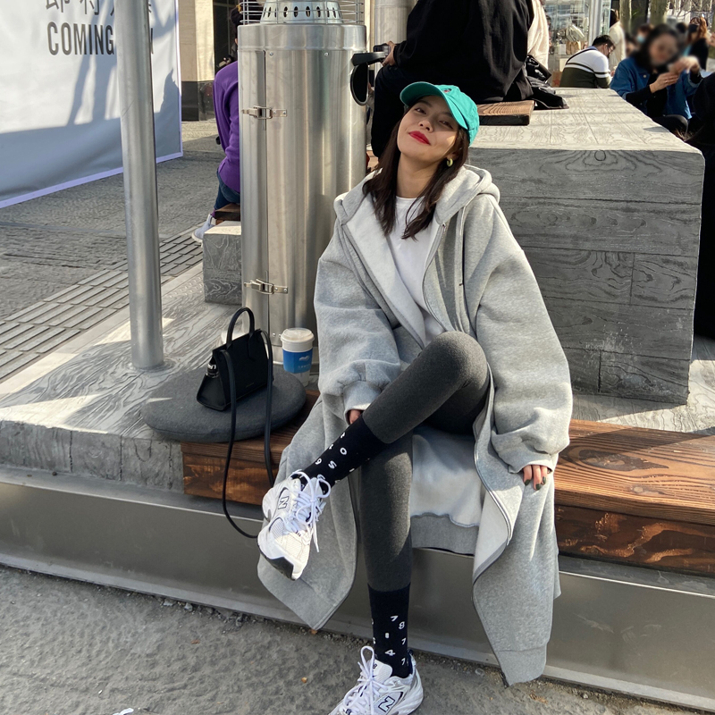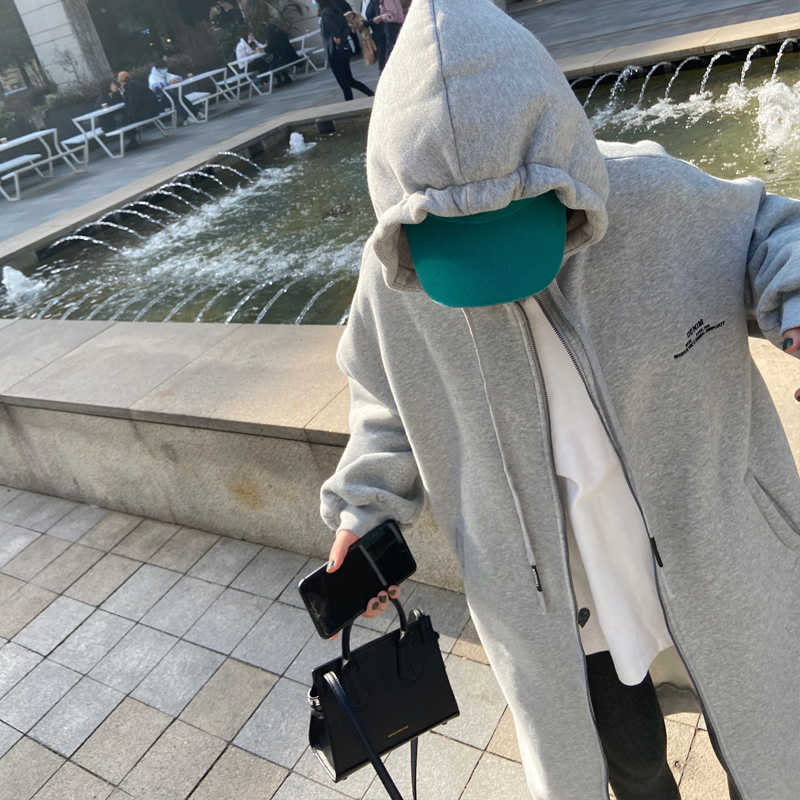 灰色長版過膝oversize連帽加絨衛衣女2023新款春秋寬鬆慵懶風外套