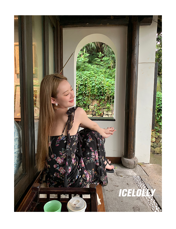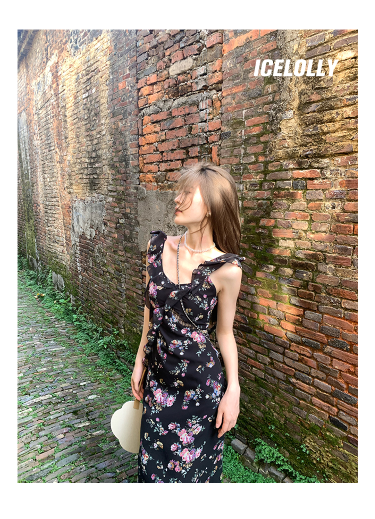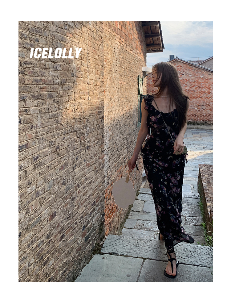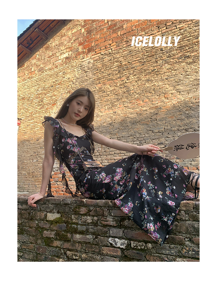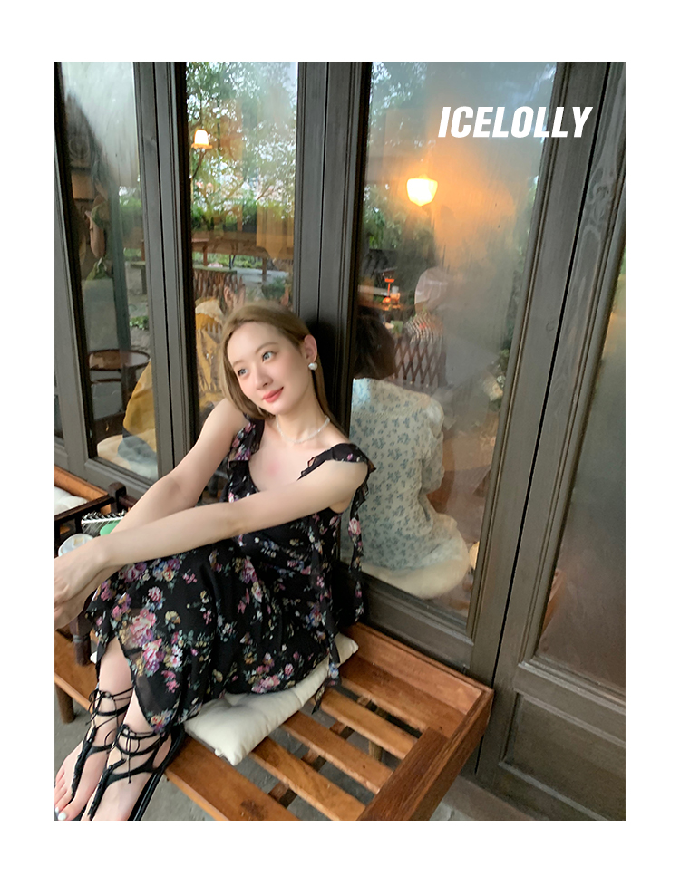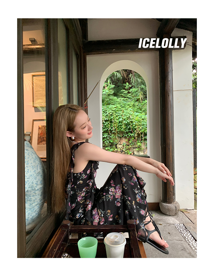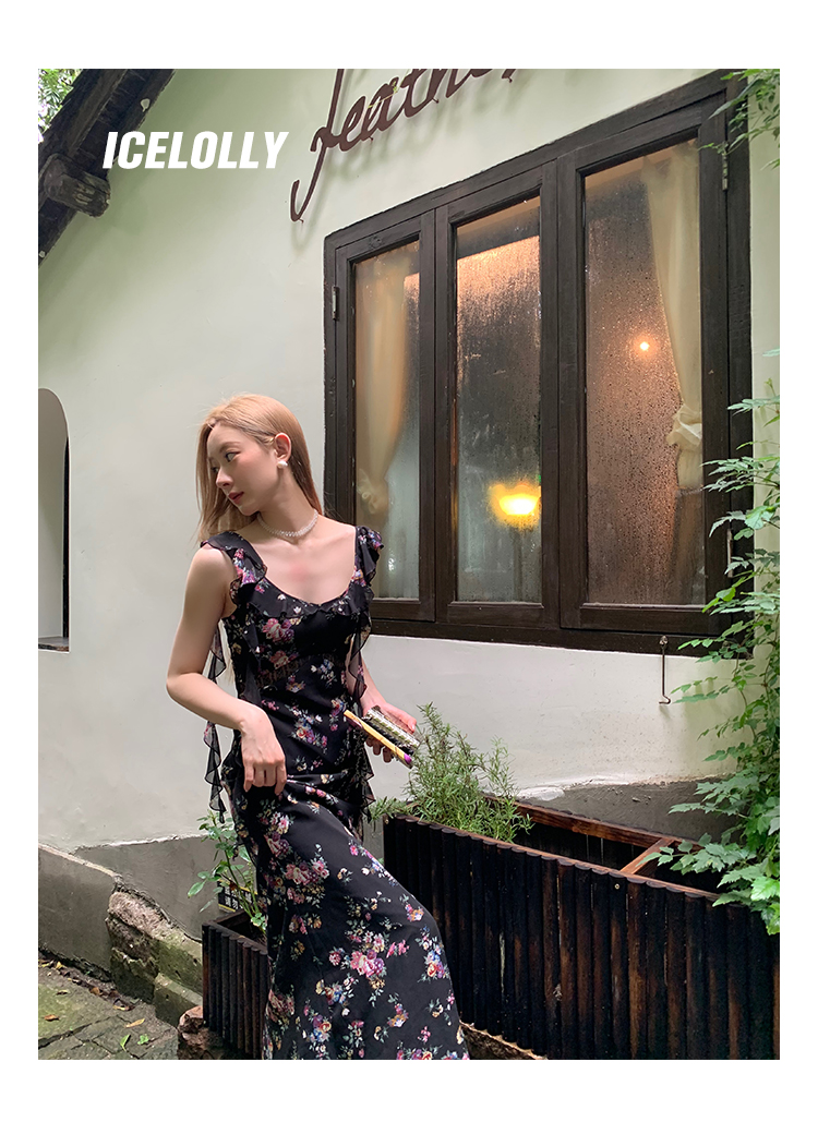 ICELOLLY法式黑色垂墜感獨特碎花吊帶洋裝超好看新款長裙子女夏
