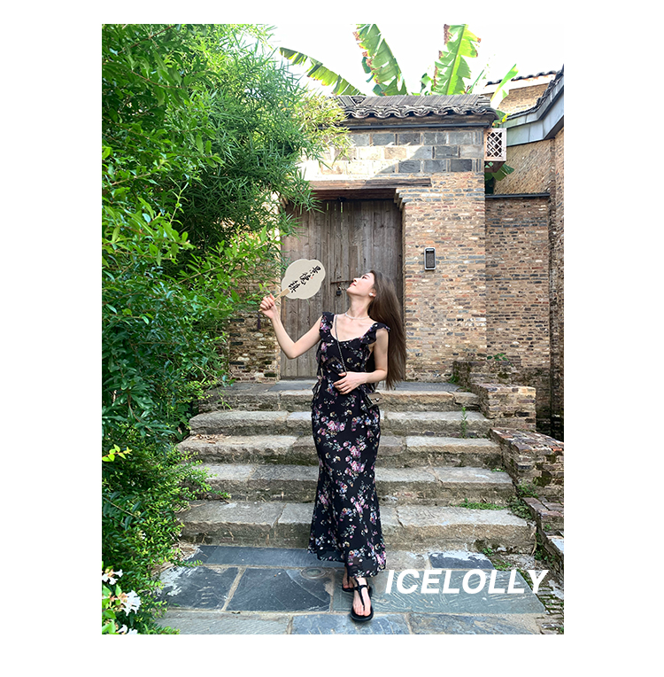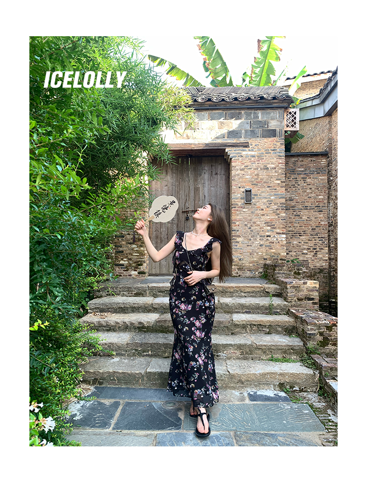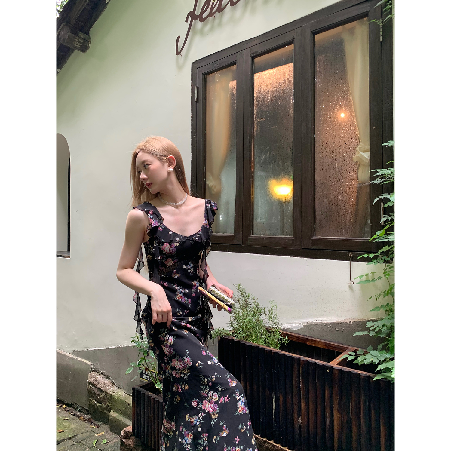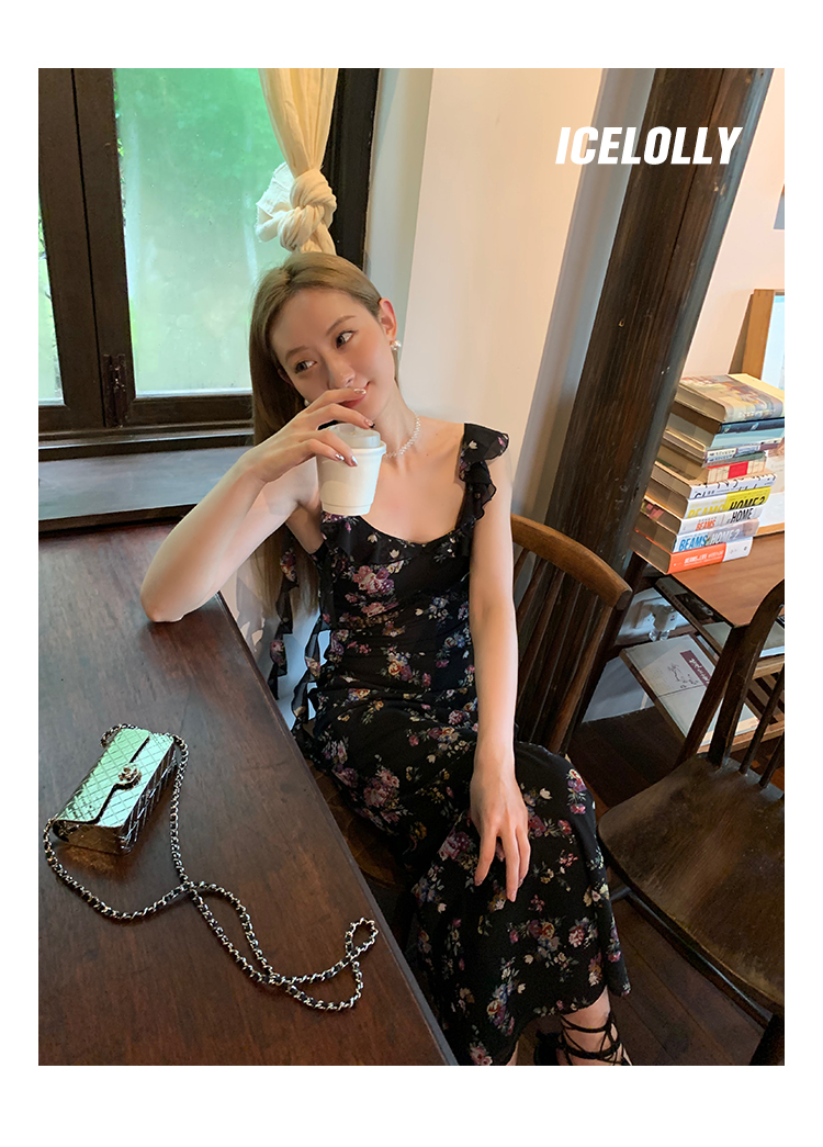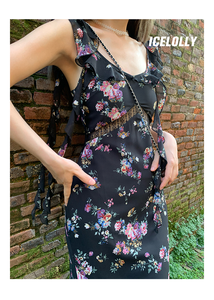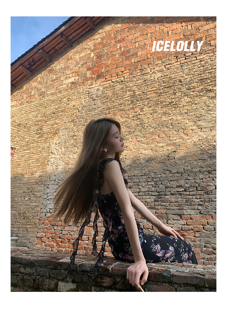 ICELOLLY法式黑色垂墜感獨特碎花吊帶洋裝超好看新款長裙子女夏