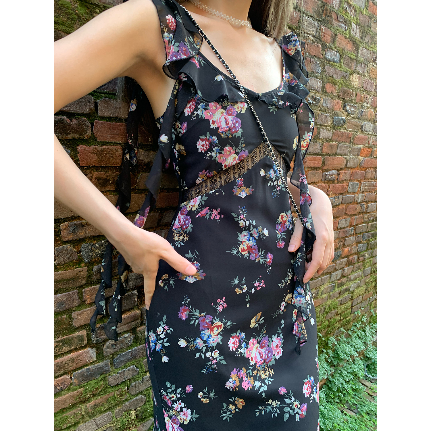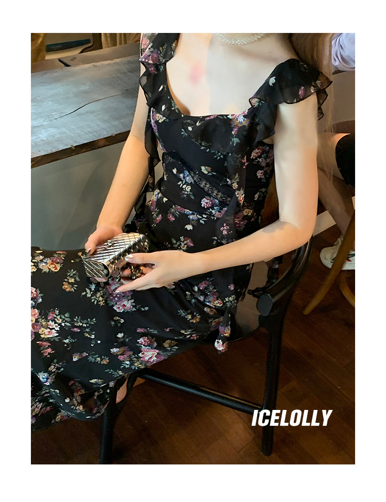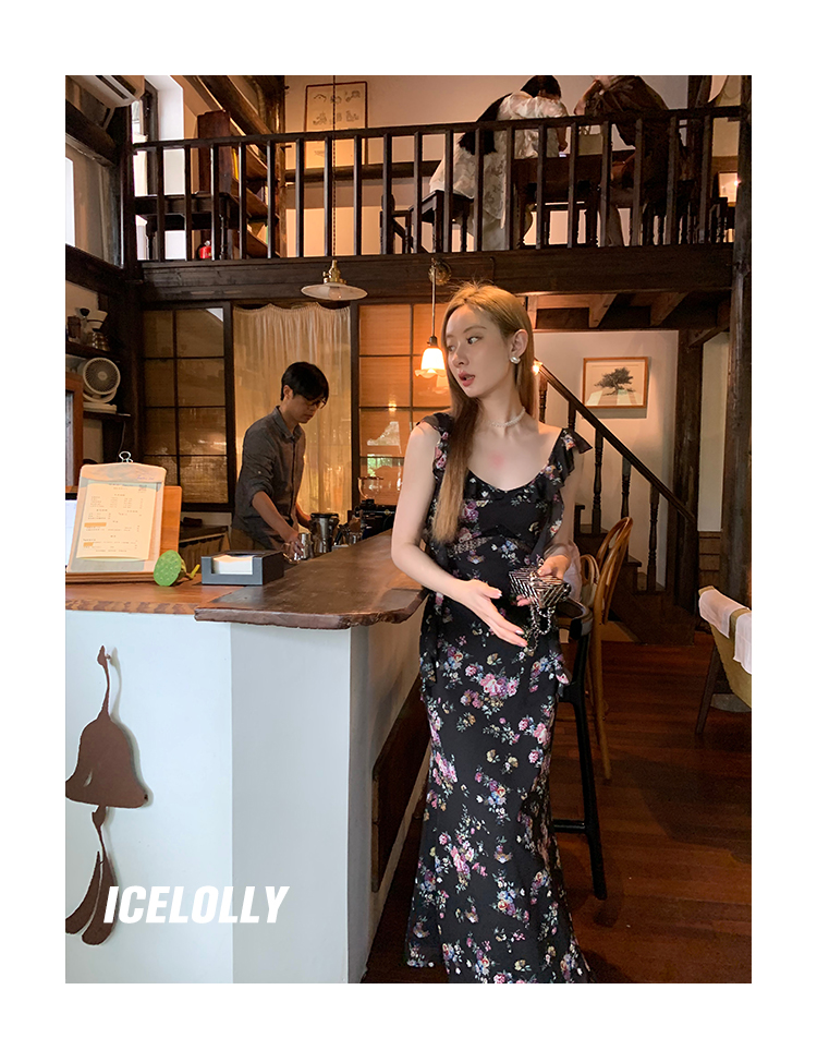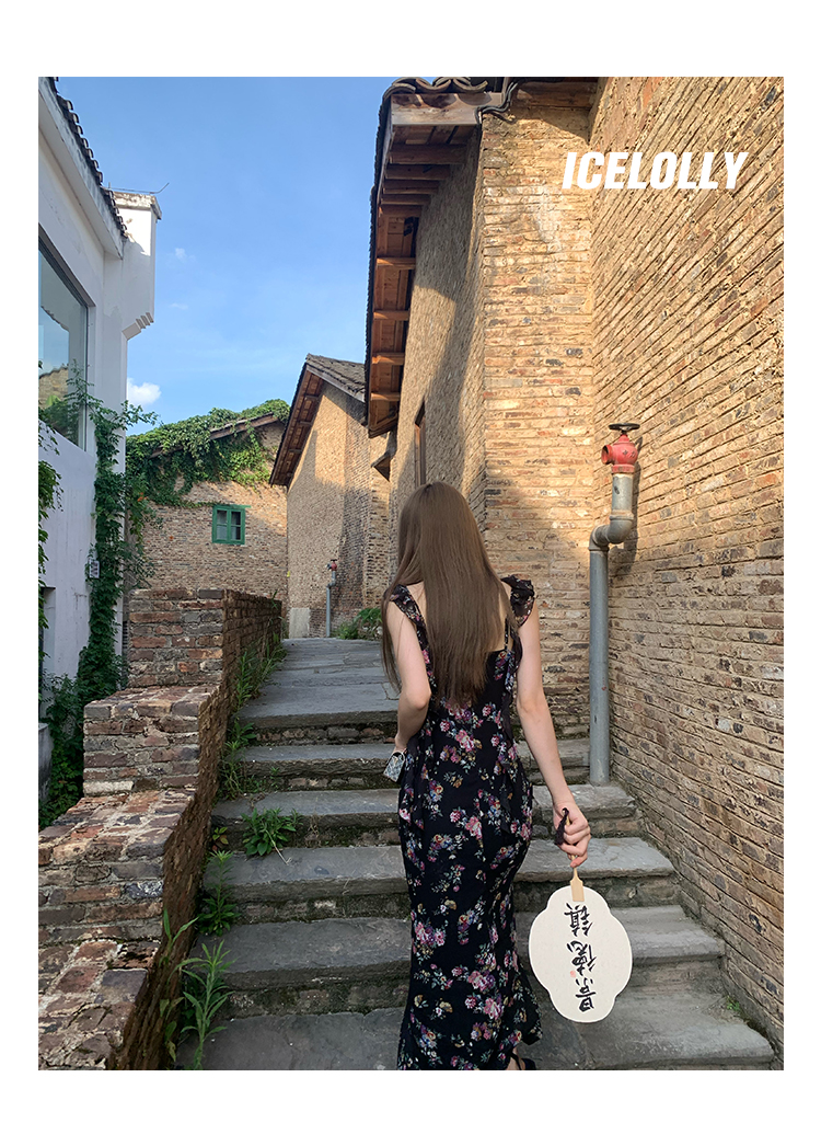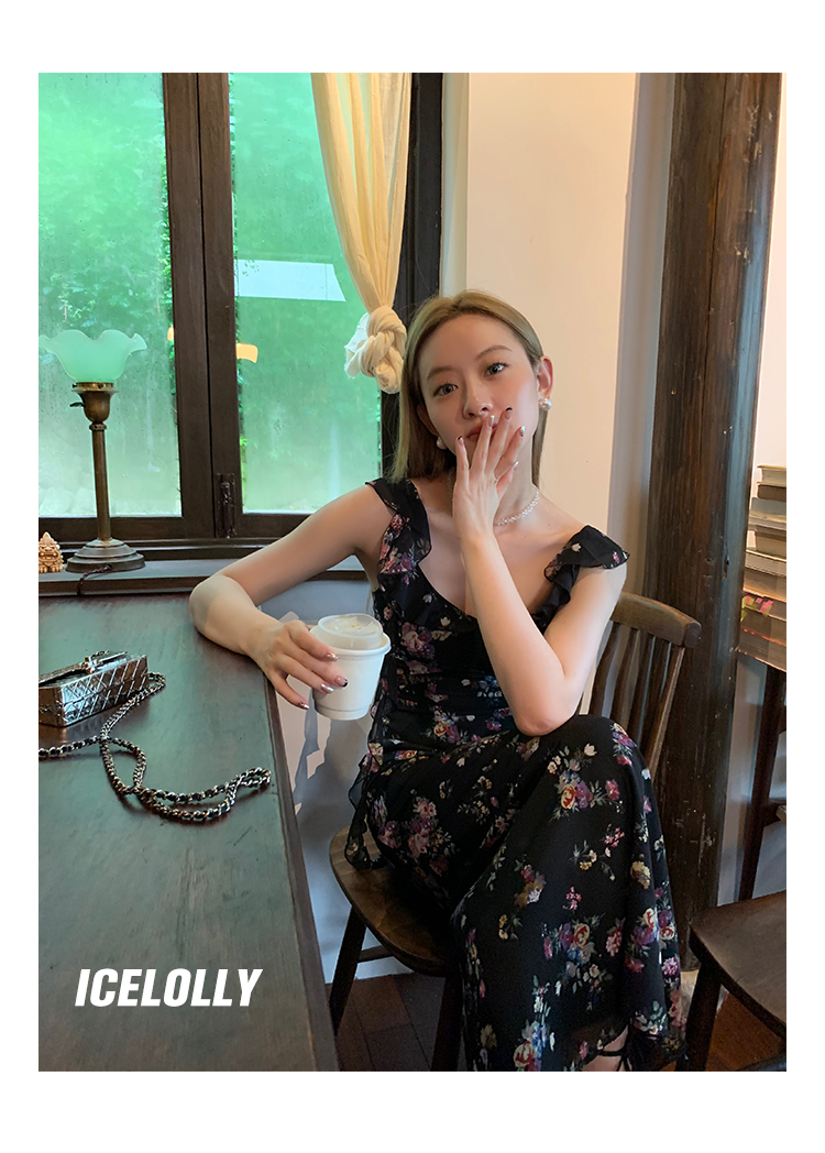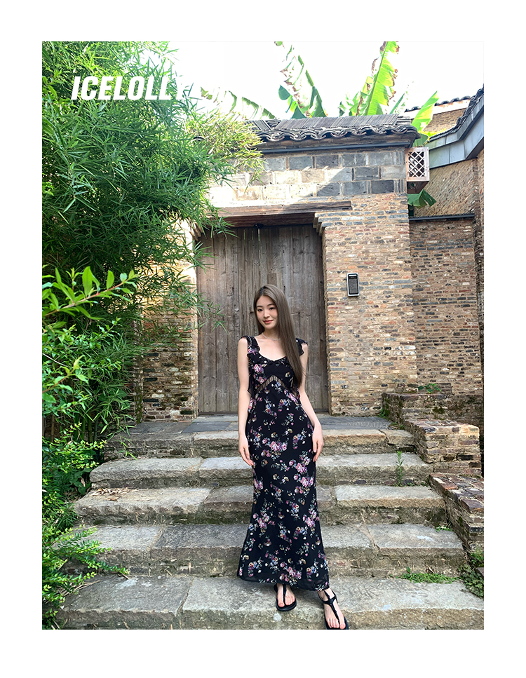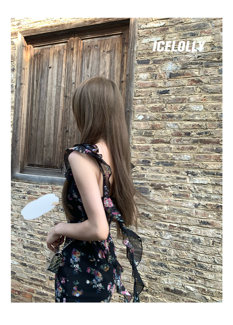 ICELOLLY法式黑色垂墜感獨特碎花吊帶洋裝超好看新款長裙子女夏