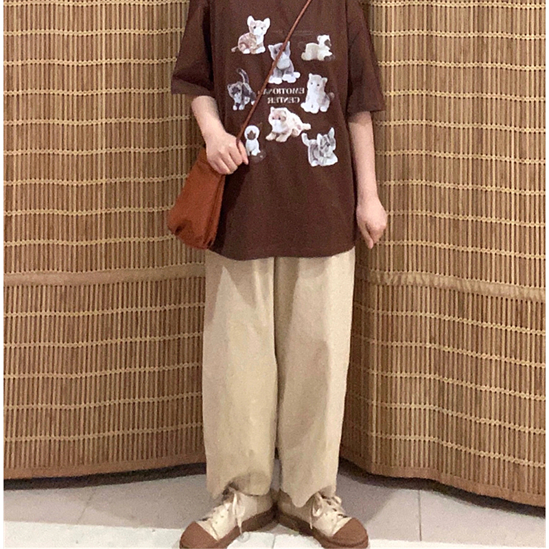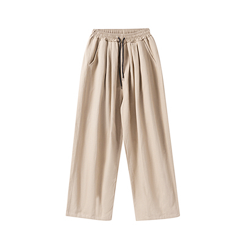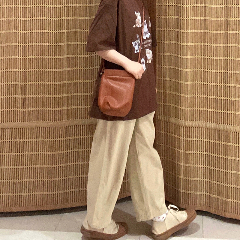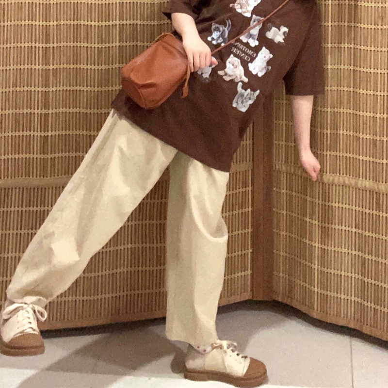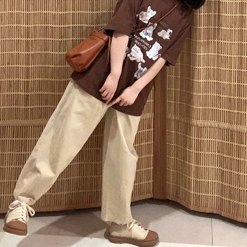 卡其色褲子女春秋季2023新款日系闊腿褲小個子休閒寬鬆直筒工裝褲