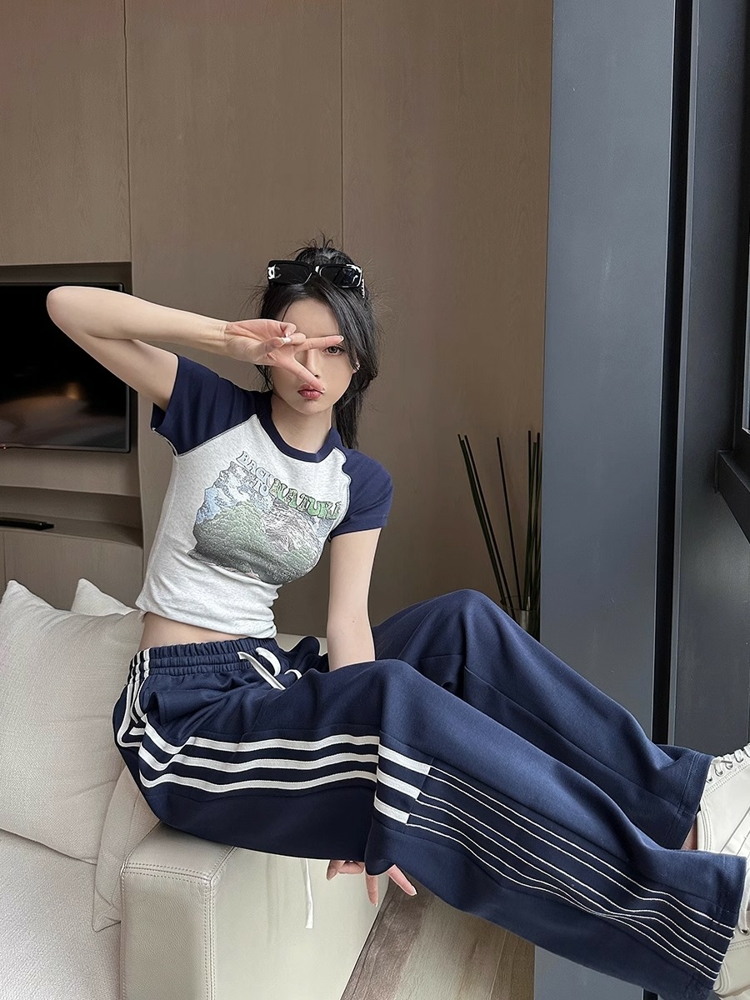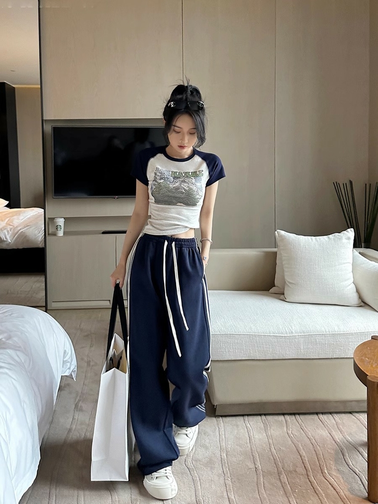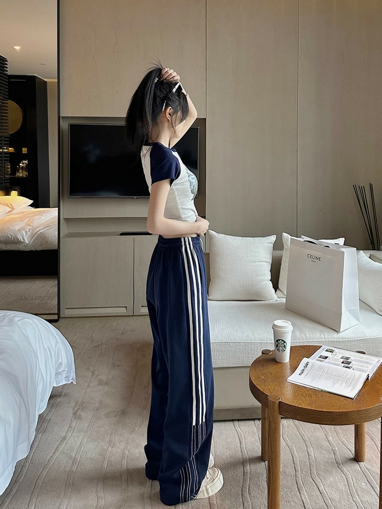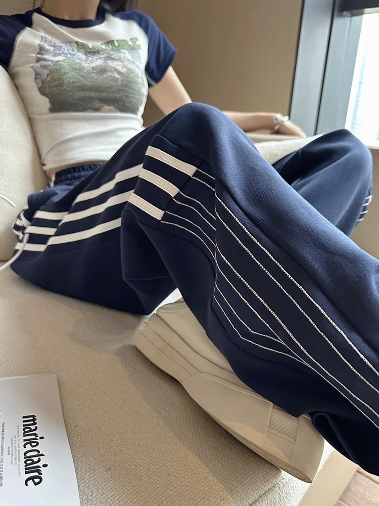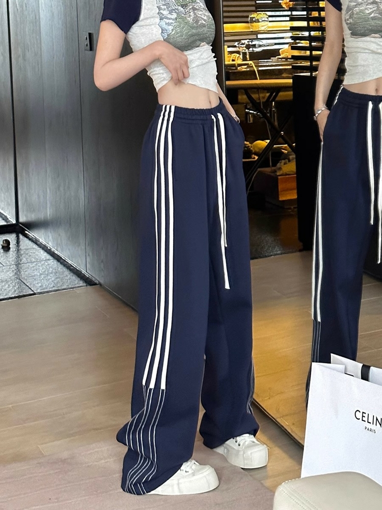 2023梨形身材大尺碼休閒褲女側邊條紋直筒運動褲顯瘦西裝褲長褲