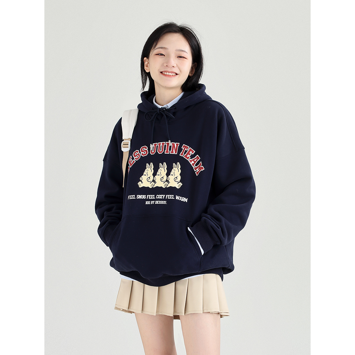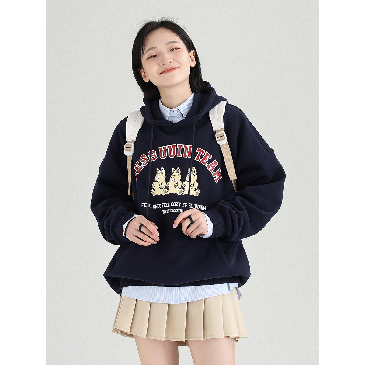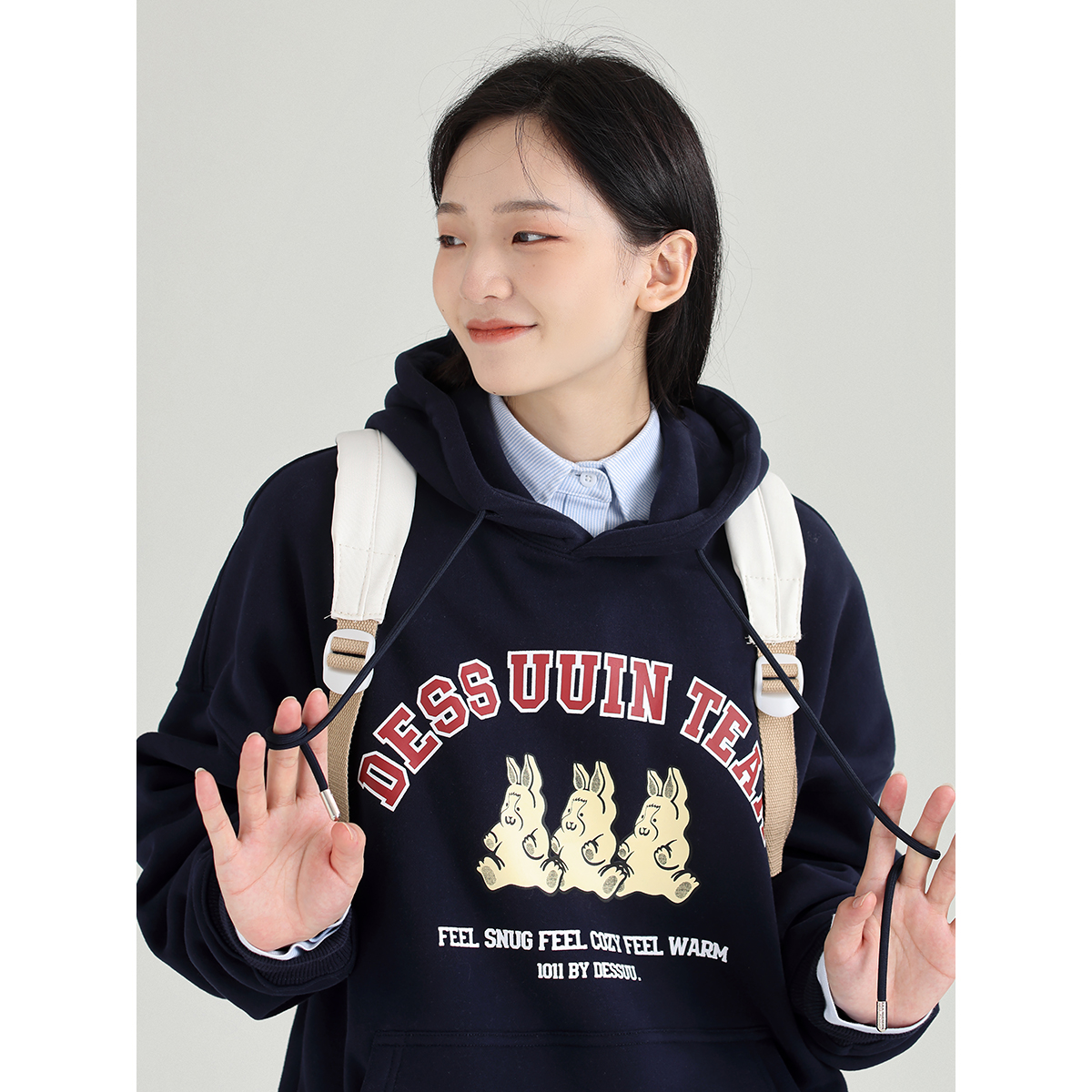 DESSUU秋冬復古學院風連帽加絨衛衣女兔子印花寬鬆帽衫丨兔年限定