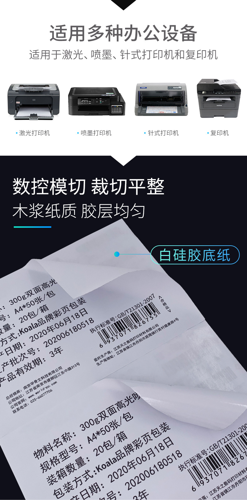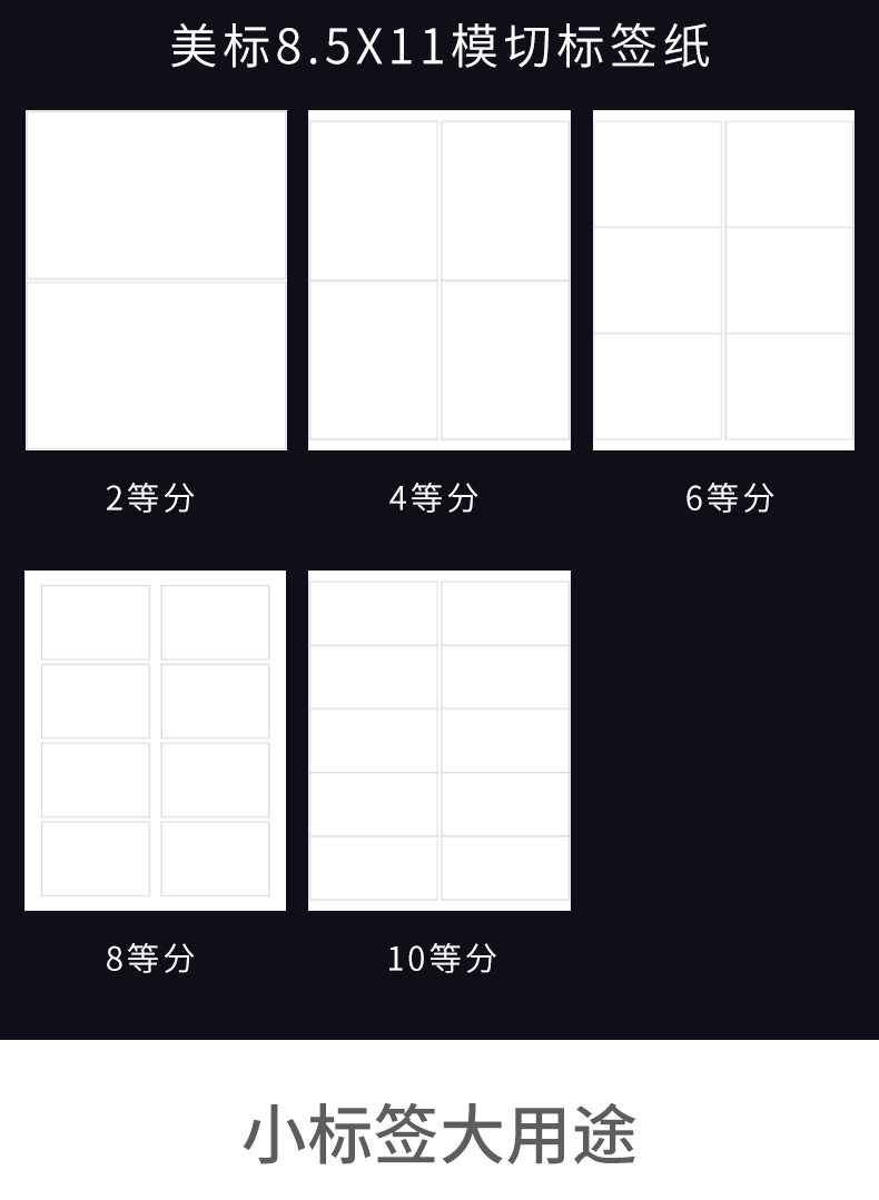 颜色 美标A4(亚面2格)8.5*5.5英寸,美标A4(亚面4格)56*127mm美标A4(亚面2格)4*5英寸,美标A4(亚面6格)4*3.33英寸,美标A4(亚面8格)3.375*2.33英寸,美标A4(亚面10格)4*2英寸,A4(光面整张)210*297mm,A4(亚面整张)210*297mm,A4(亚面2格)148*210mm,A4(亚面21格)40*64.5mm,A4(亚面27格)31.5*70mm,A4(亚面30格)29.5*70mm,A4(亚面40格)29.5*52.5mm,A4(亚面44格)25.5*48.5mm,A4(亚面整张)210*297mm*100张