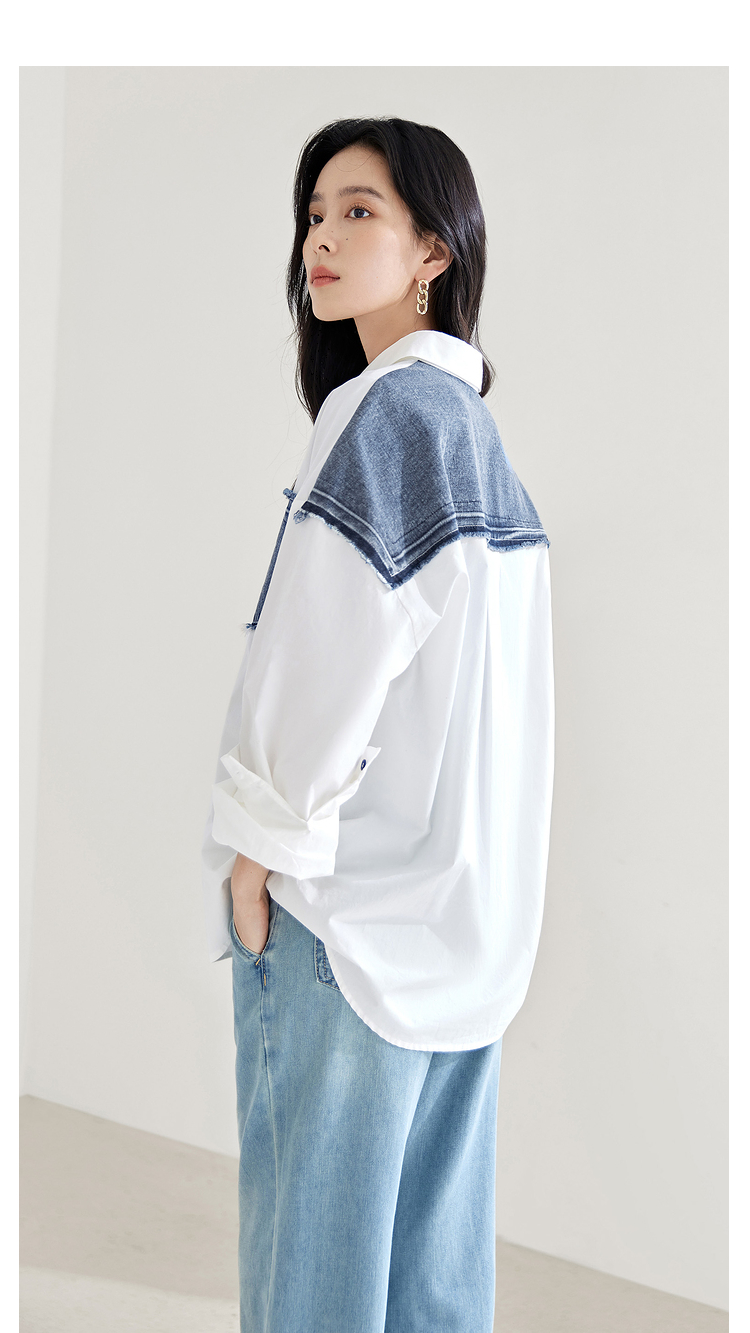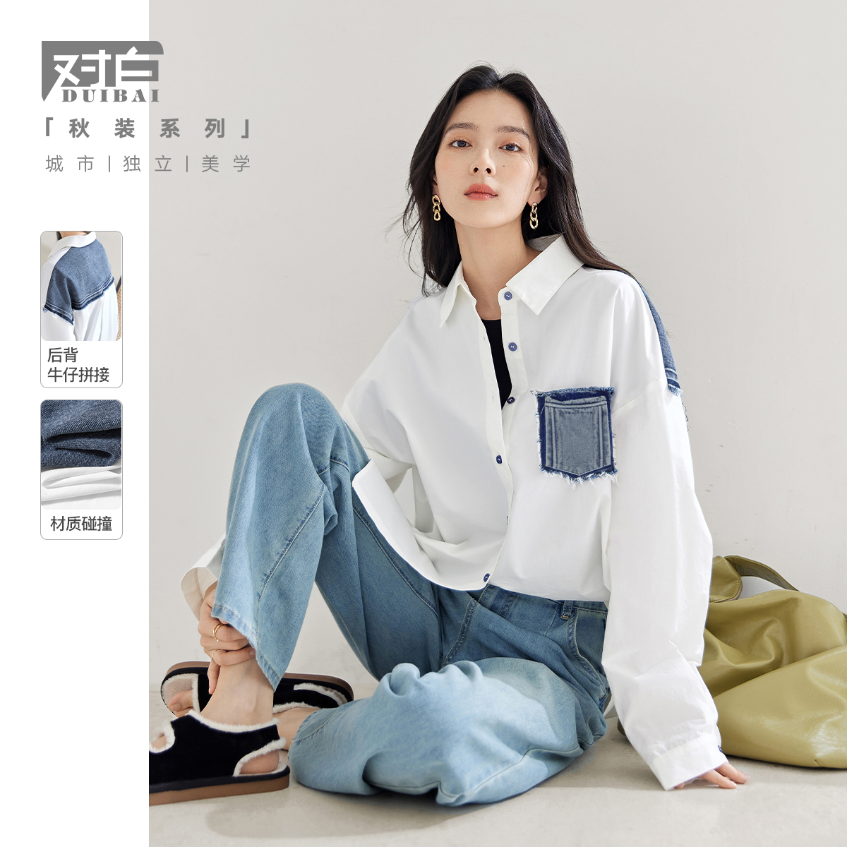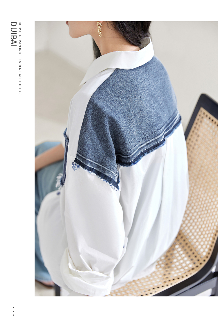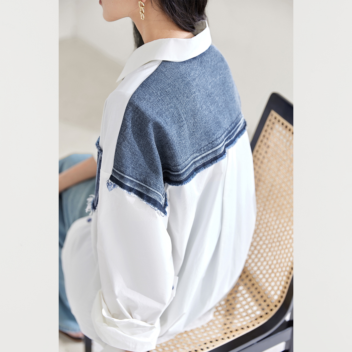 對白時尚牛仔拼接白襯衫女2023秋裝新款寬鬆休閒簡約小眾純棉上衣
