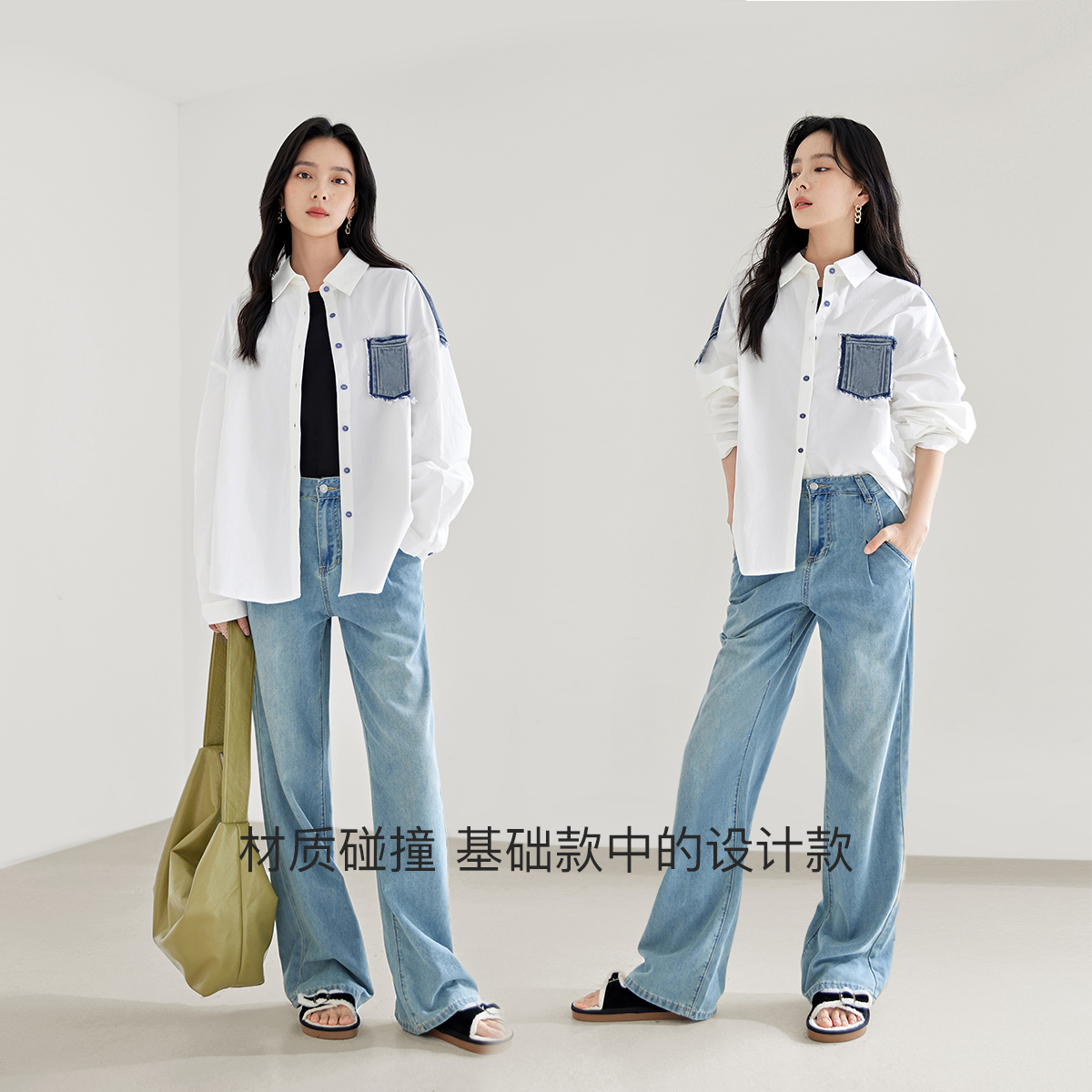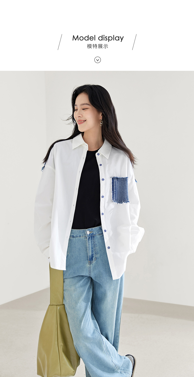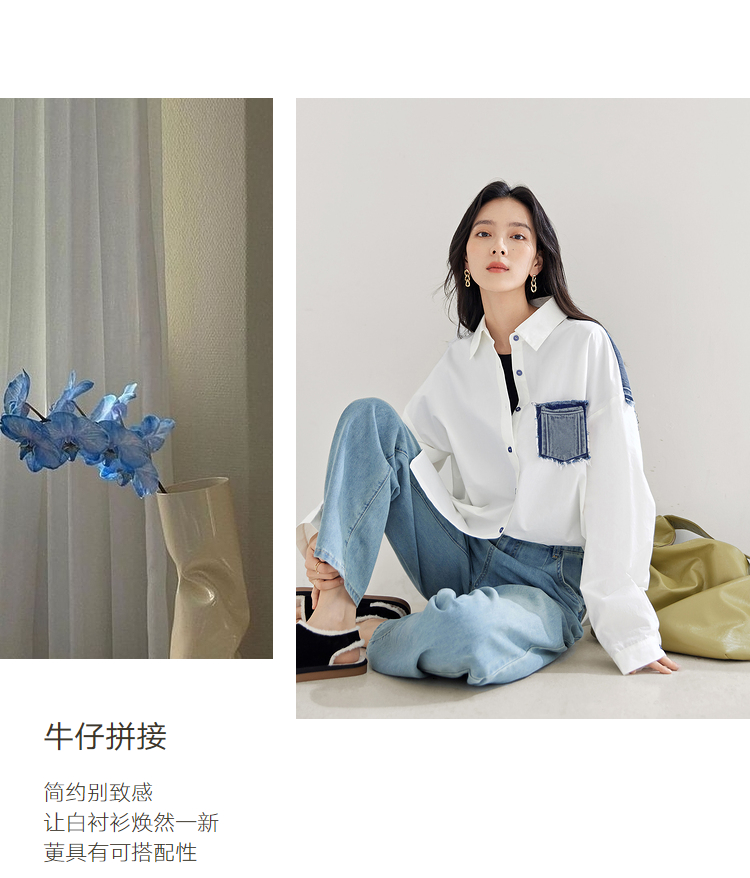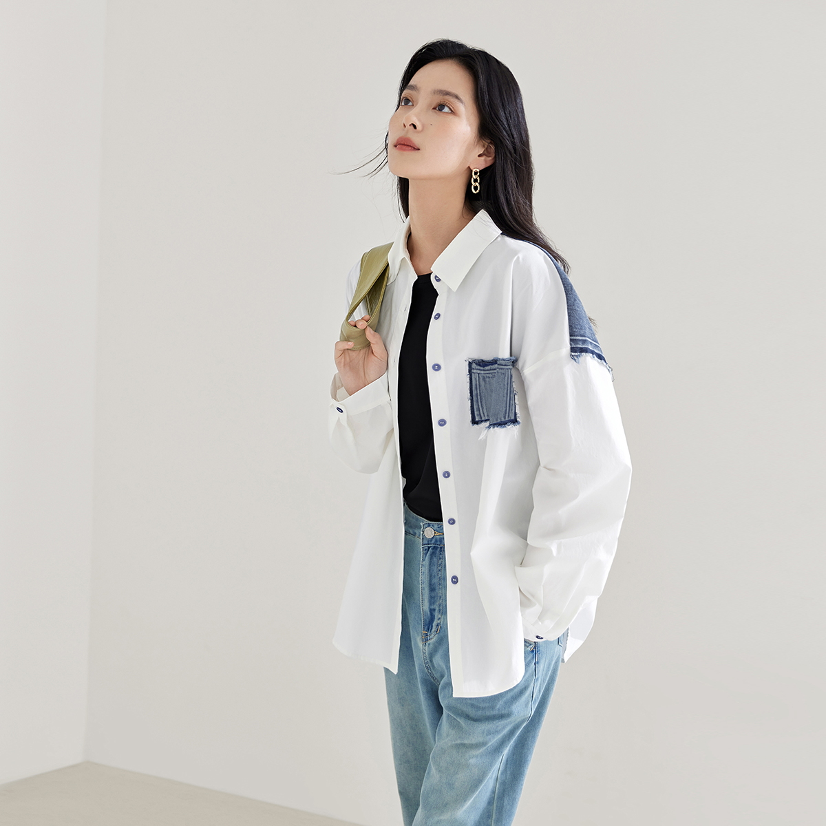 對白時尚牛仔拼接白襯衫女2023秋裝新款寬鬆休閒簡約小眾純棉上衣