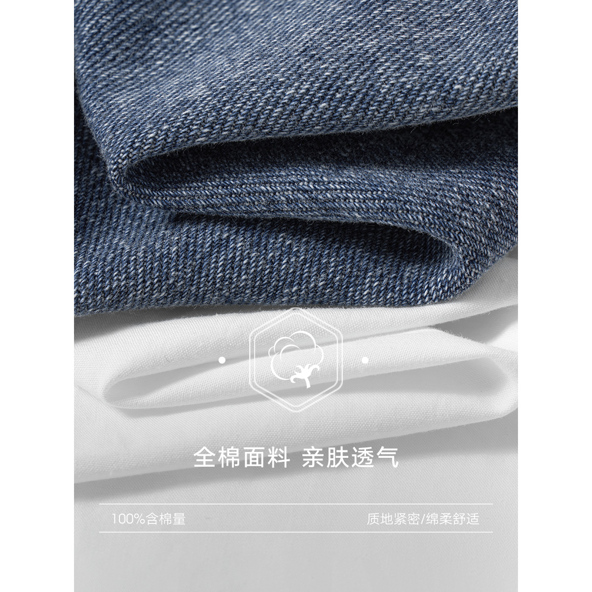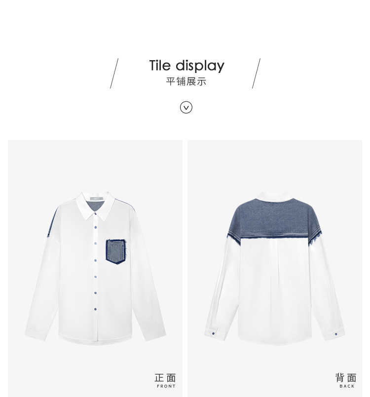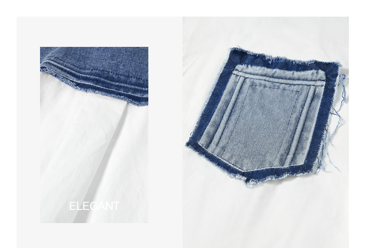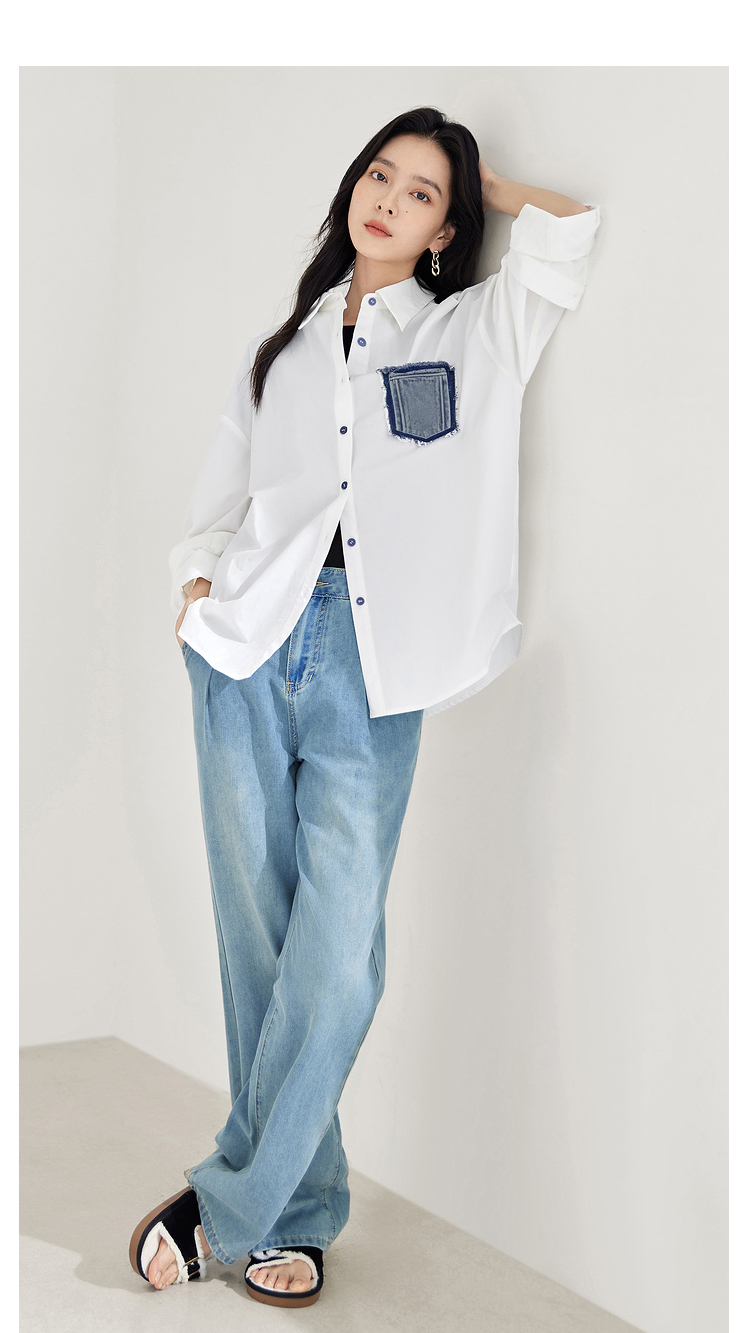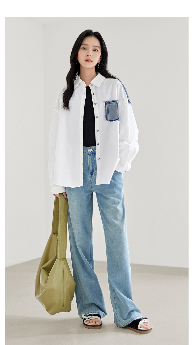 對白時尚牛仔拼接白襯衫女2023秋裝新款寬鬆休閒簡約小眾純棉上衣