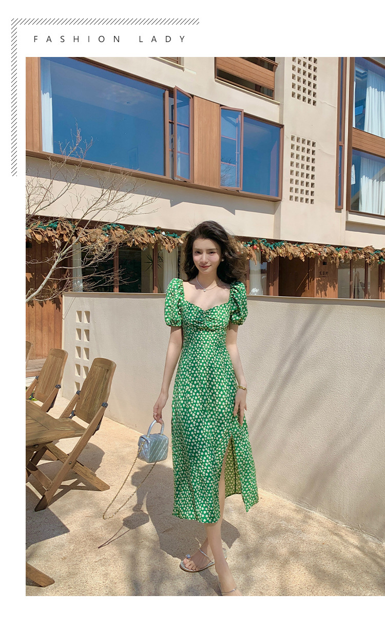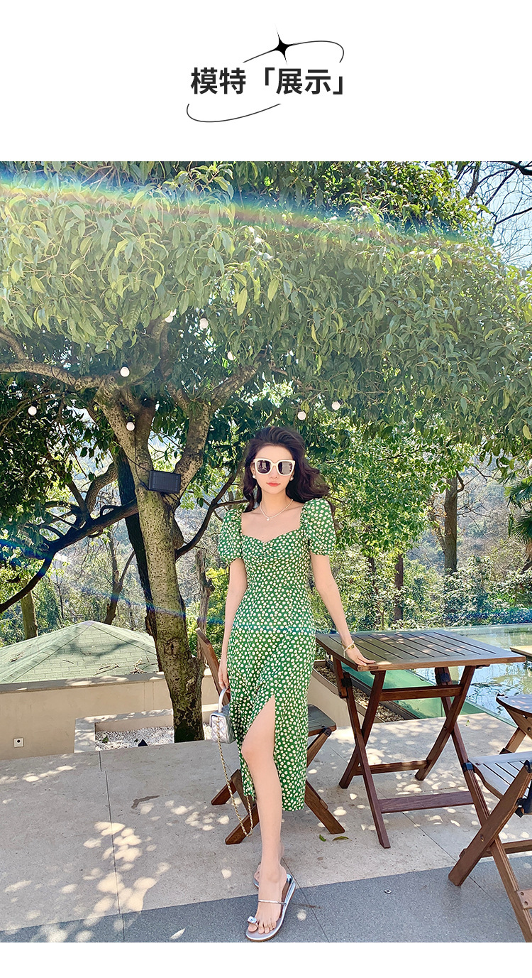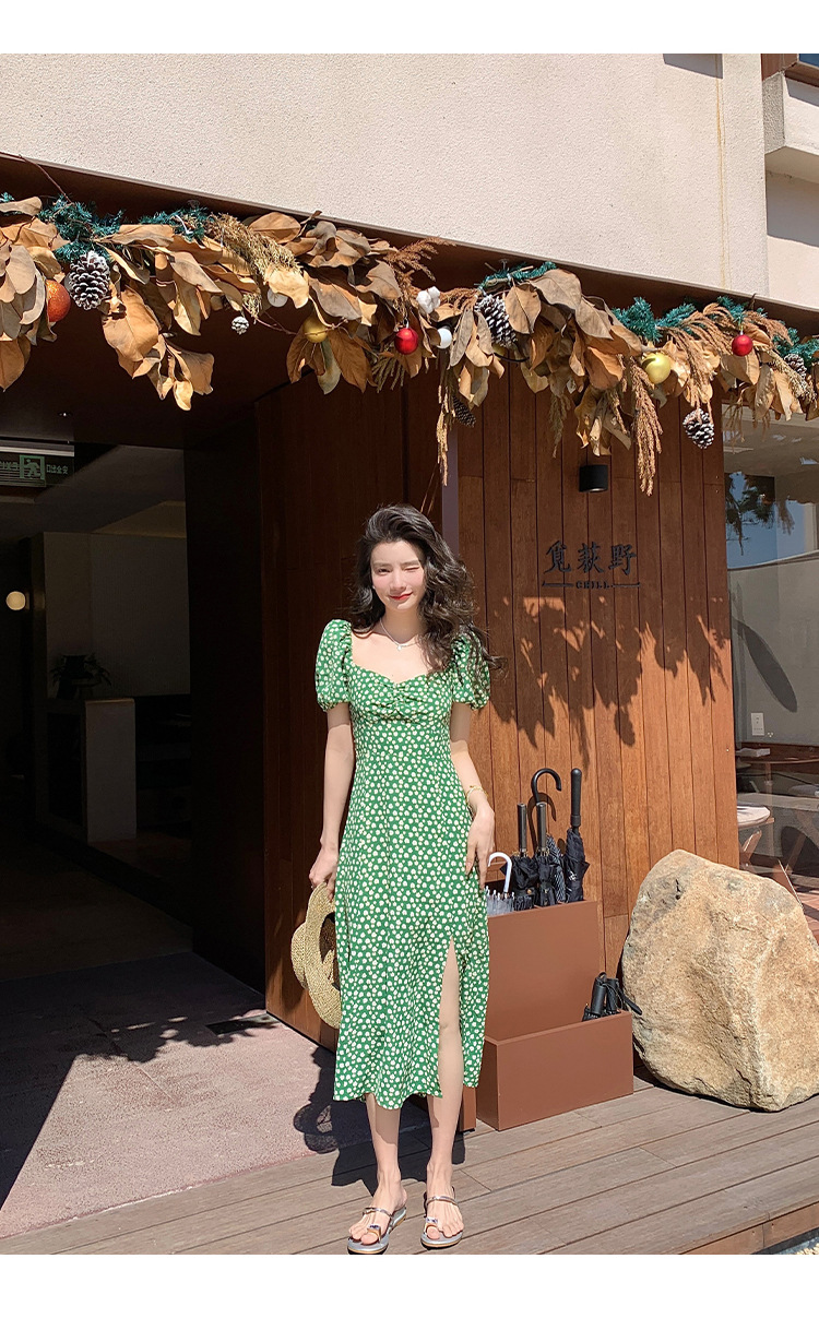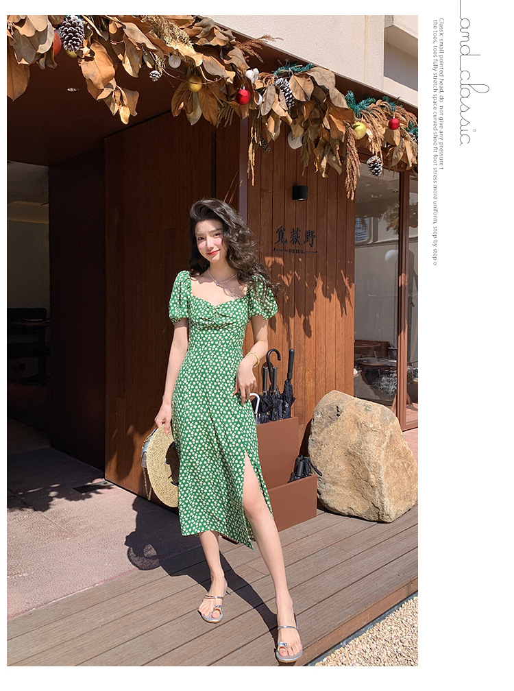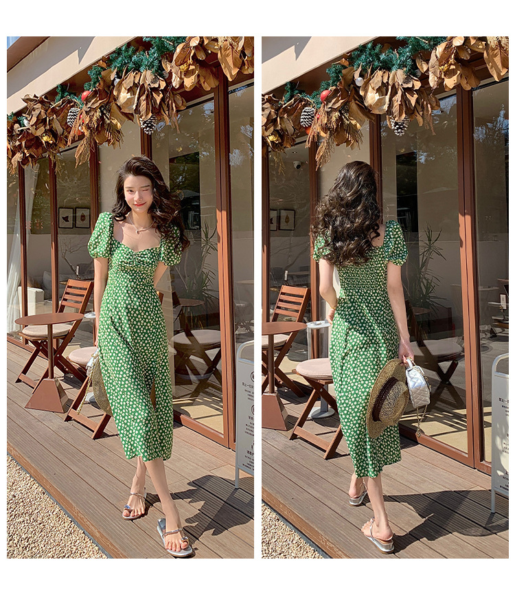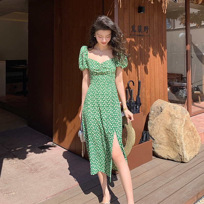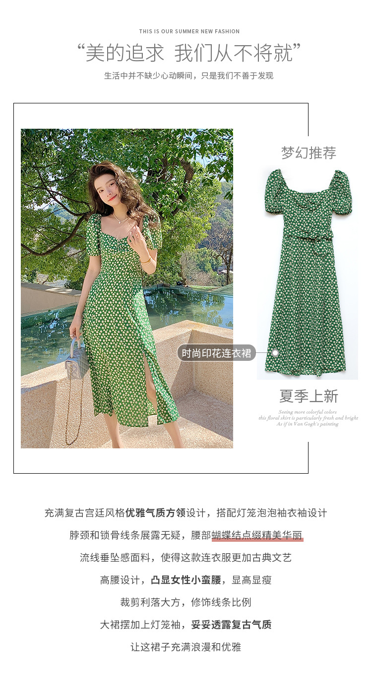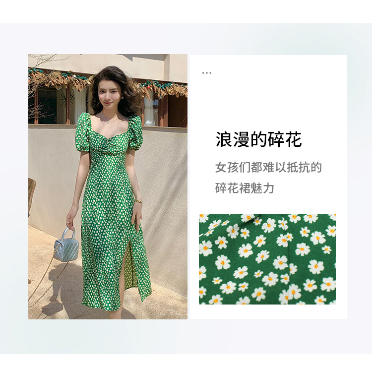 法式收腰长裙泡泡袖方领碎花连衣裙夏女修身显瘦小个子开叉茶歇裙