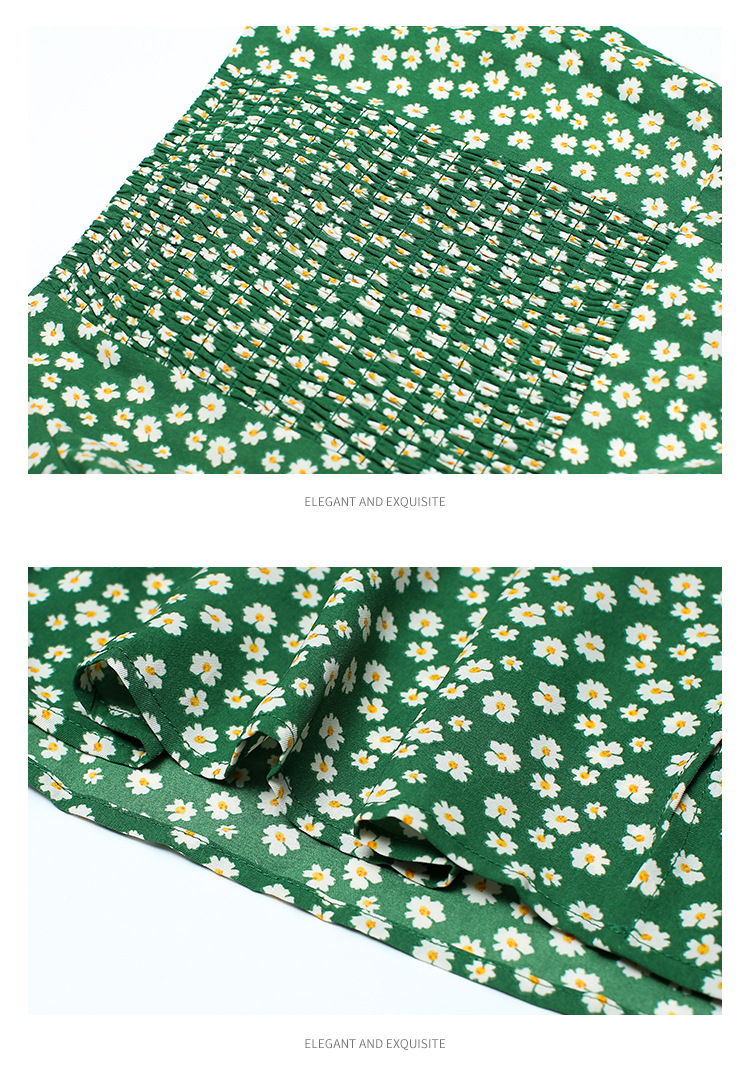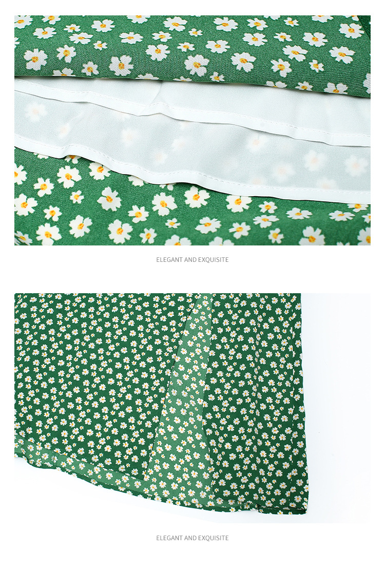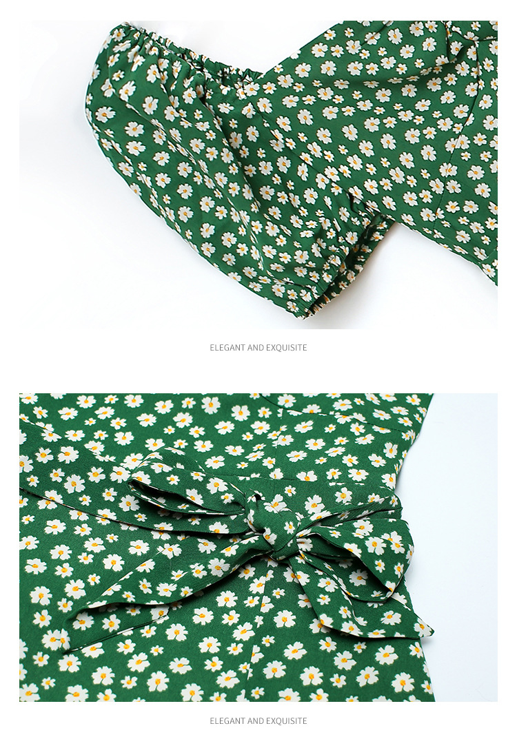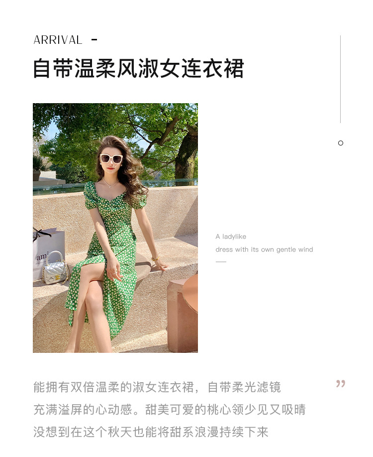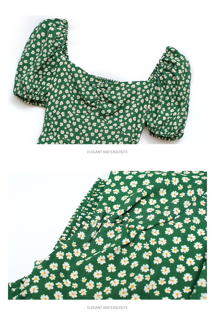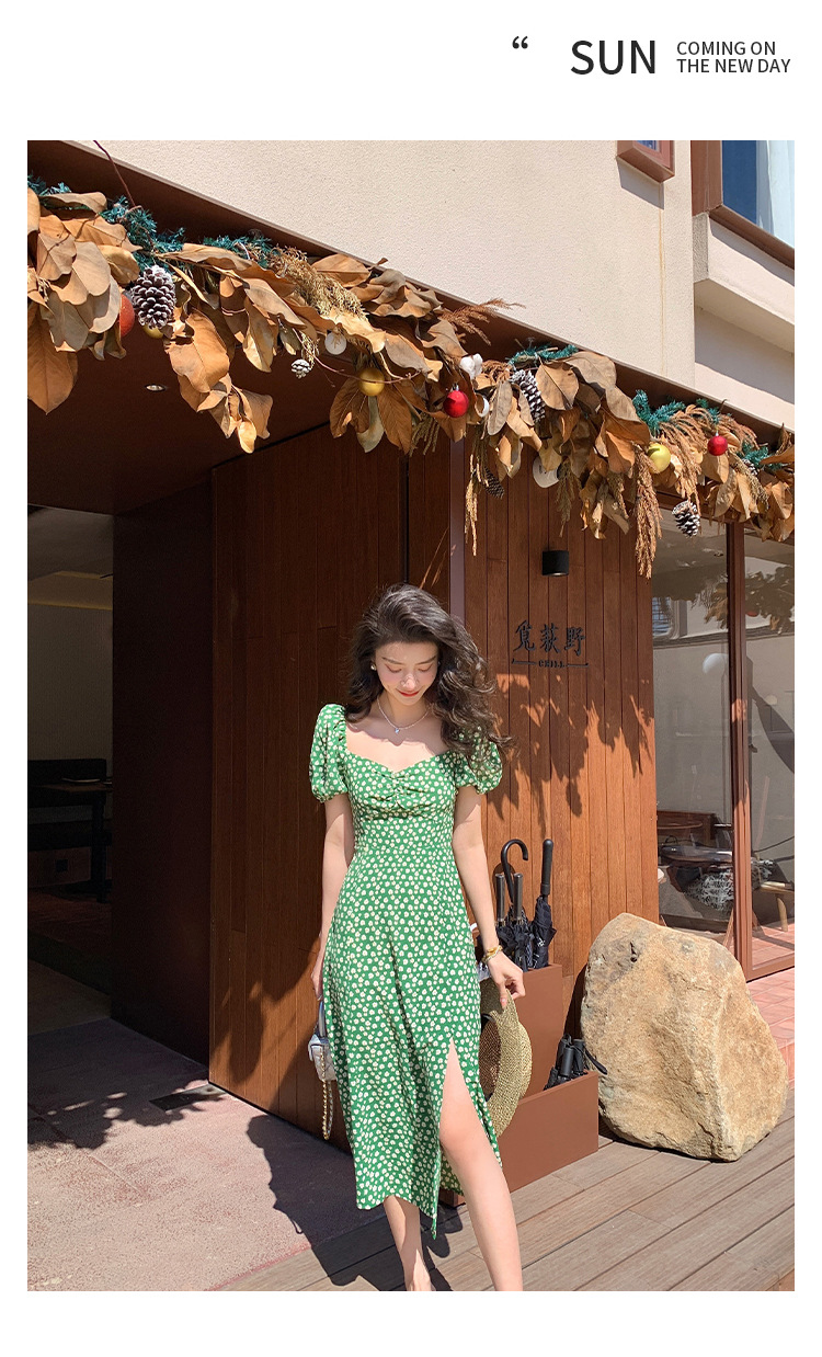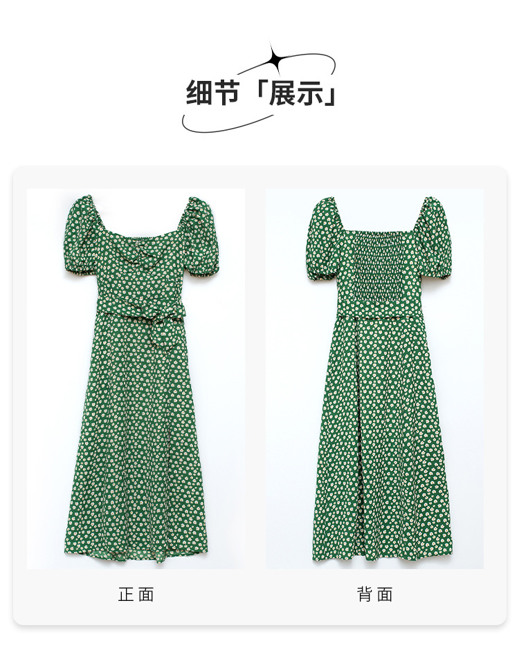 法式收腰长裙泡泡袖方领碎花连衣裙夏女修身显瘦小个子开叉茶歇裙
