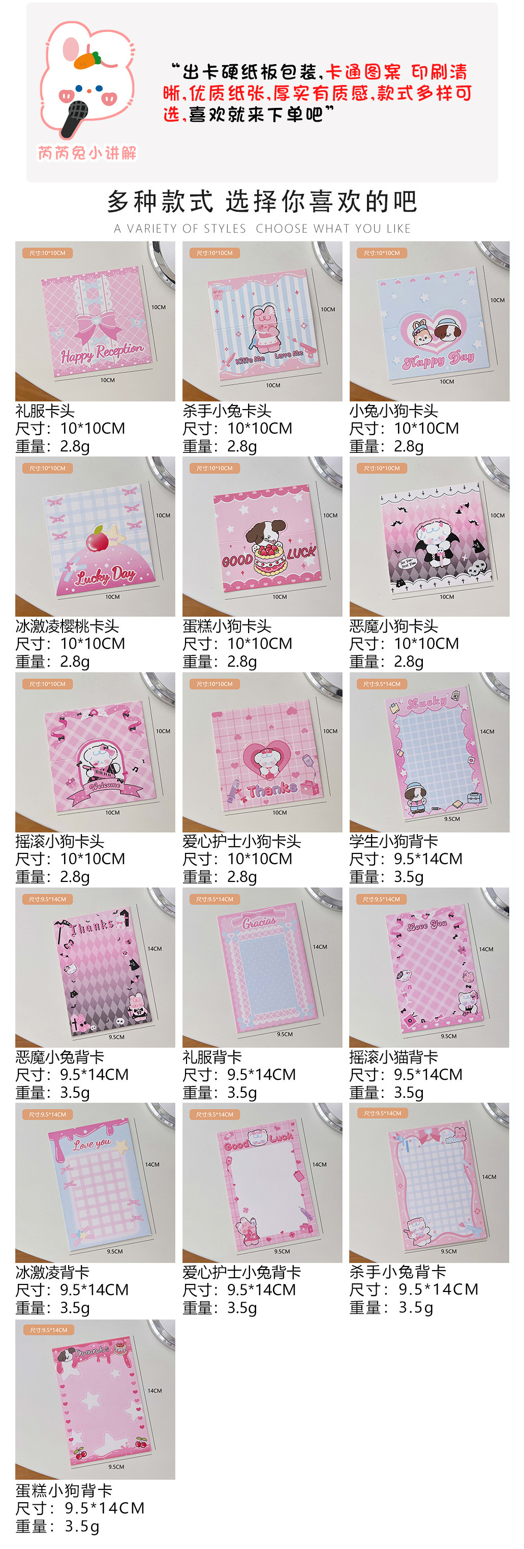 规格 1#恶魔小狗卡头,2#爱心护士小狗卡头,3#摇滚小狗卡头,4#小兔小狗卡头,5#蛋糕小狗卡头,6#冰激凌樱桃卡头,7#杀手小兔卡头,8#礼服卡头,9#恶魔小兔背卡,10#摇滚小猫背卡,11#爱心护士小兔背卡,12#冰激凌背卡,13#学生小狗背卡,14#礼服背卡,15#杀手小兔背卡,16#蛋糕小狗背卡,17#opp袋,白色圆点袋(一包10个),白色星星袋(一包10个),粉色星星袋(一包10个),蓝色星星袋(一包10个),白色圆点袋(一包50个),白色星星袋(一包50个),蓝色星星袋(一包50个),粉色星星袋(一包50个),1#梦幻天使【头卡】,2#梦幻天使【背卡】,3#奶盖软糖【头卡】,4#奶盖软糖【背卡】,5#沉睡天使【头卡】,6#沉睡天使【背卡】,7#奶牛甜心【头卡】,8#奶牛甜心【背卡】,9#桃汽曲奇【头卡】,10#桃汽曲奇【背卡】,11#粉心小熊【头卡】,12#粉心小熊【背卡】