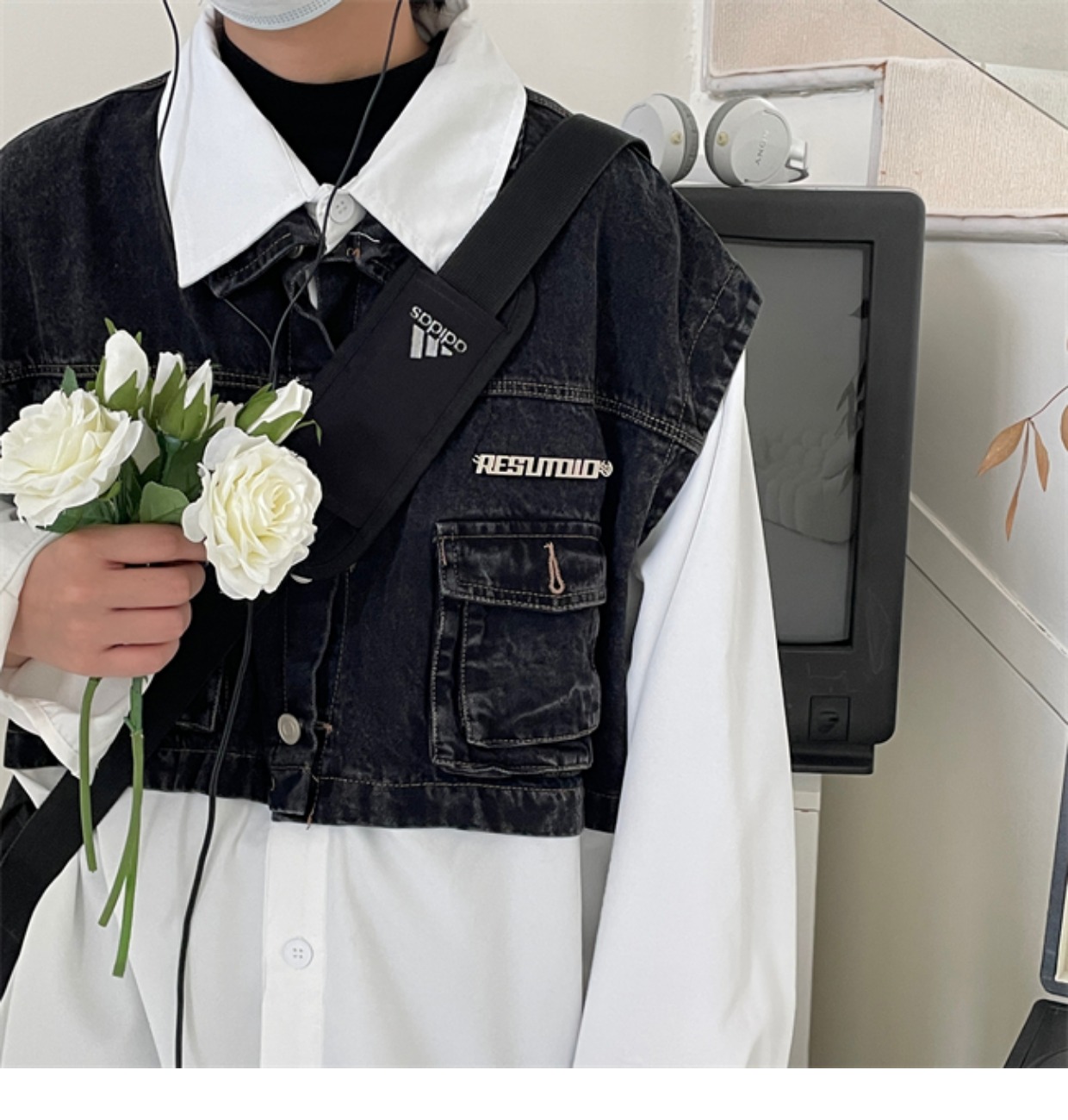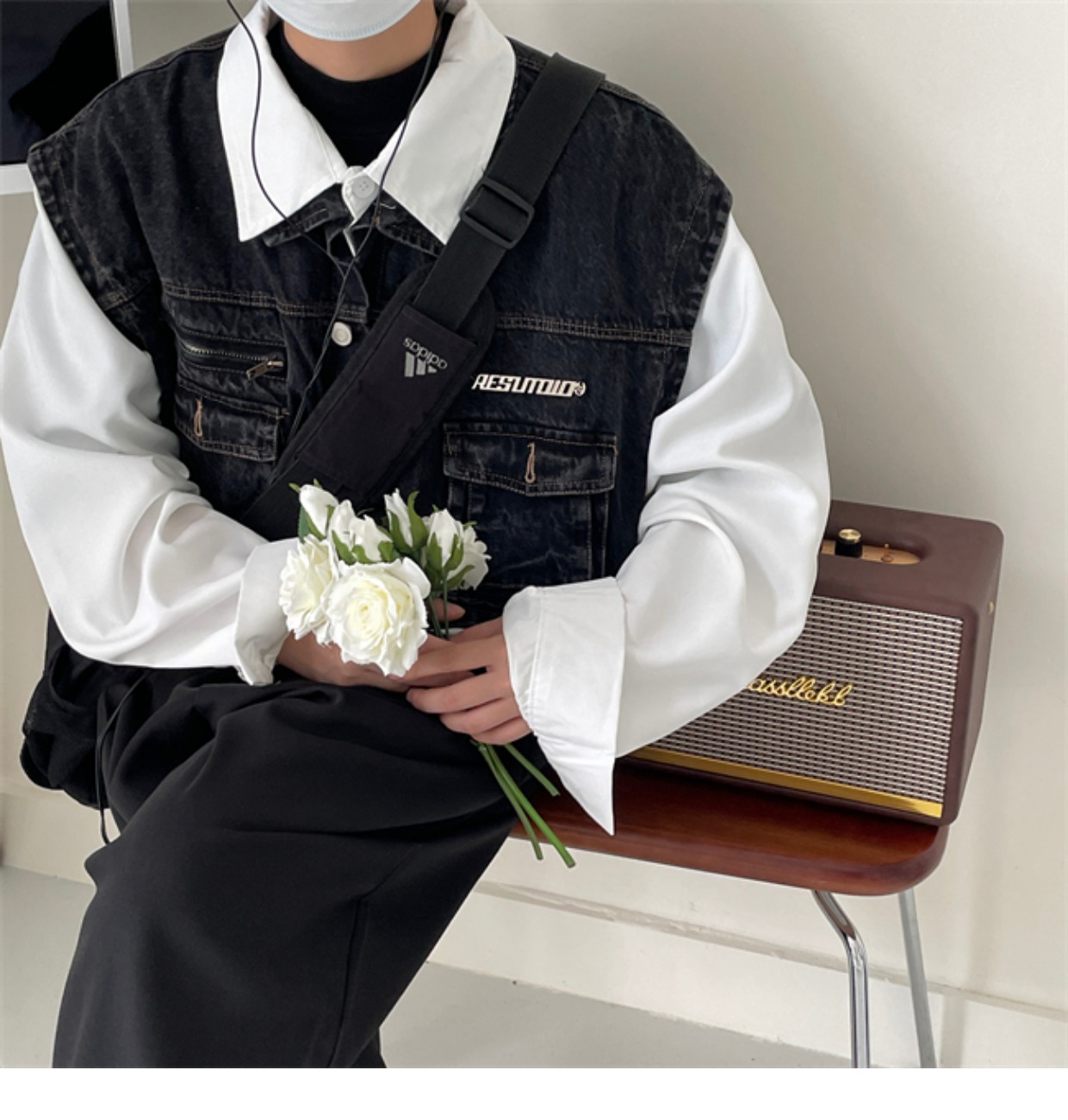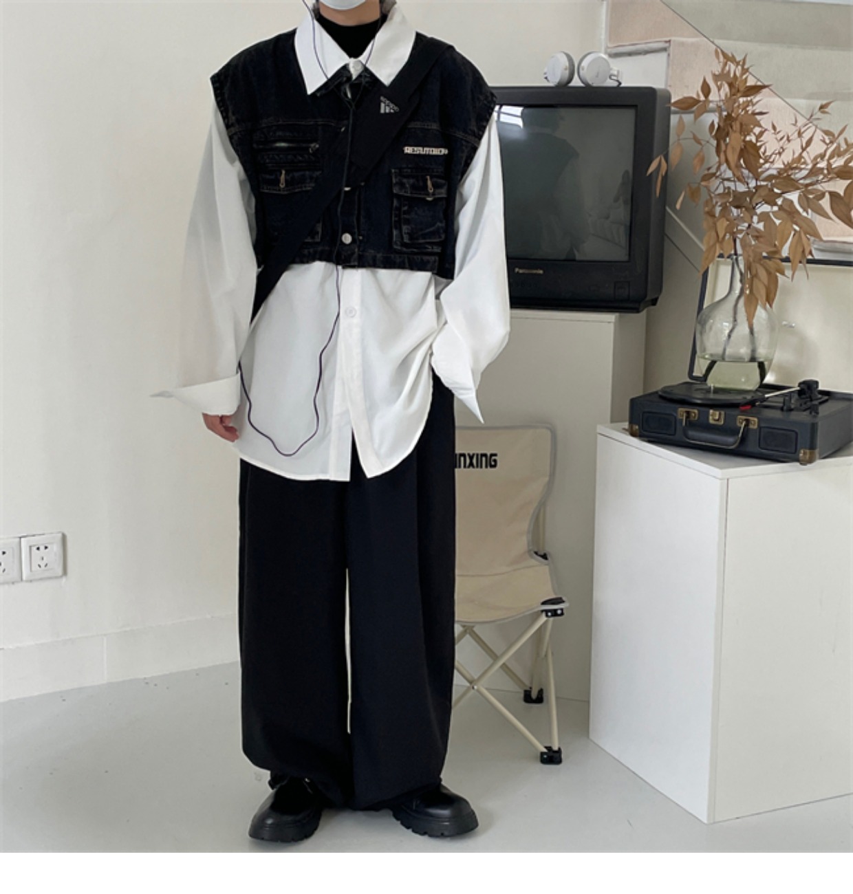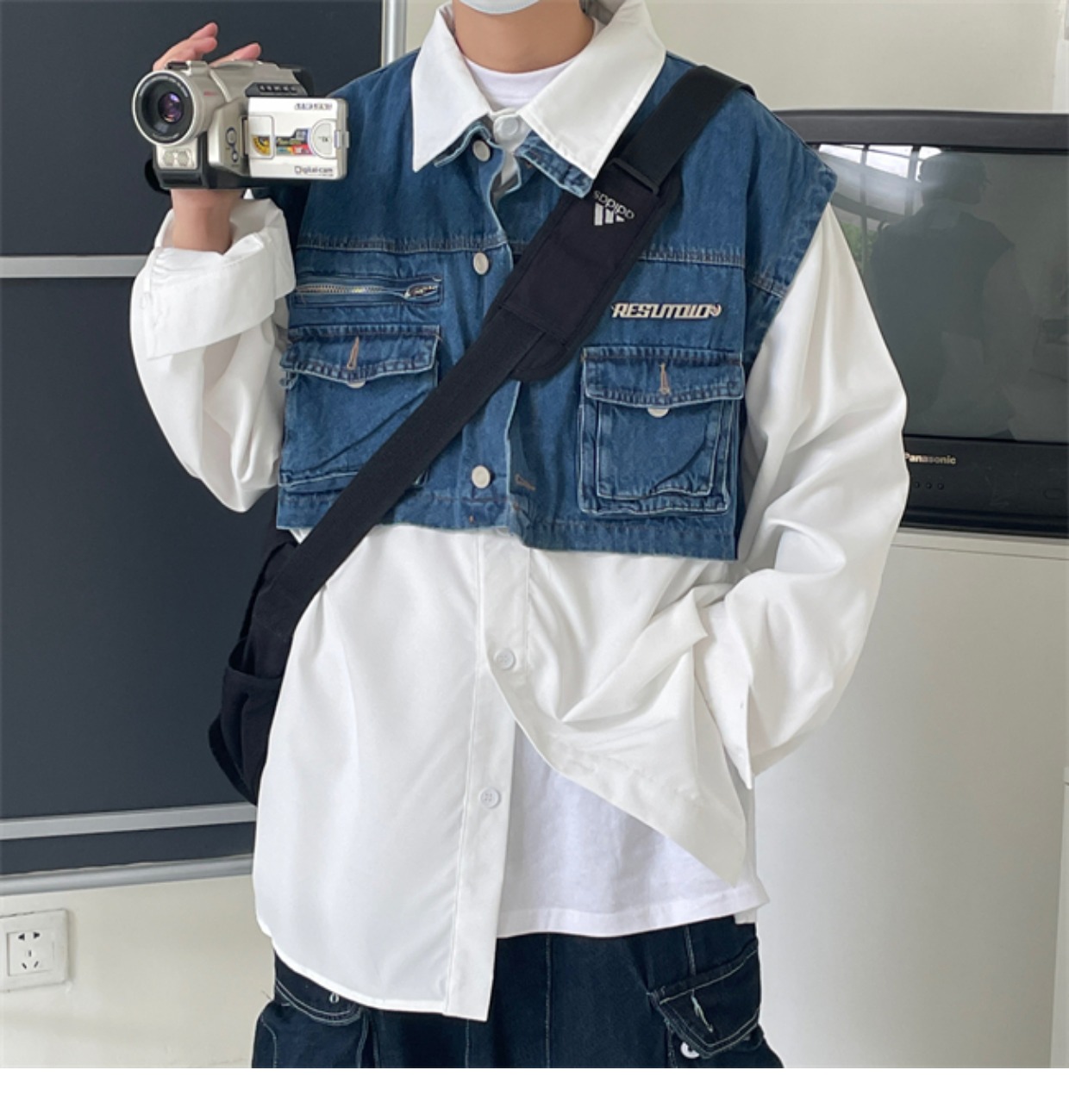 巨獸人自制春秋牛仔襯衫假兩件上衣2023新款小眾設計翻領長袖襯衫