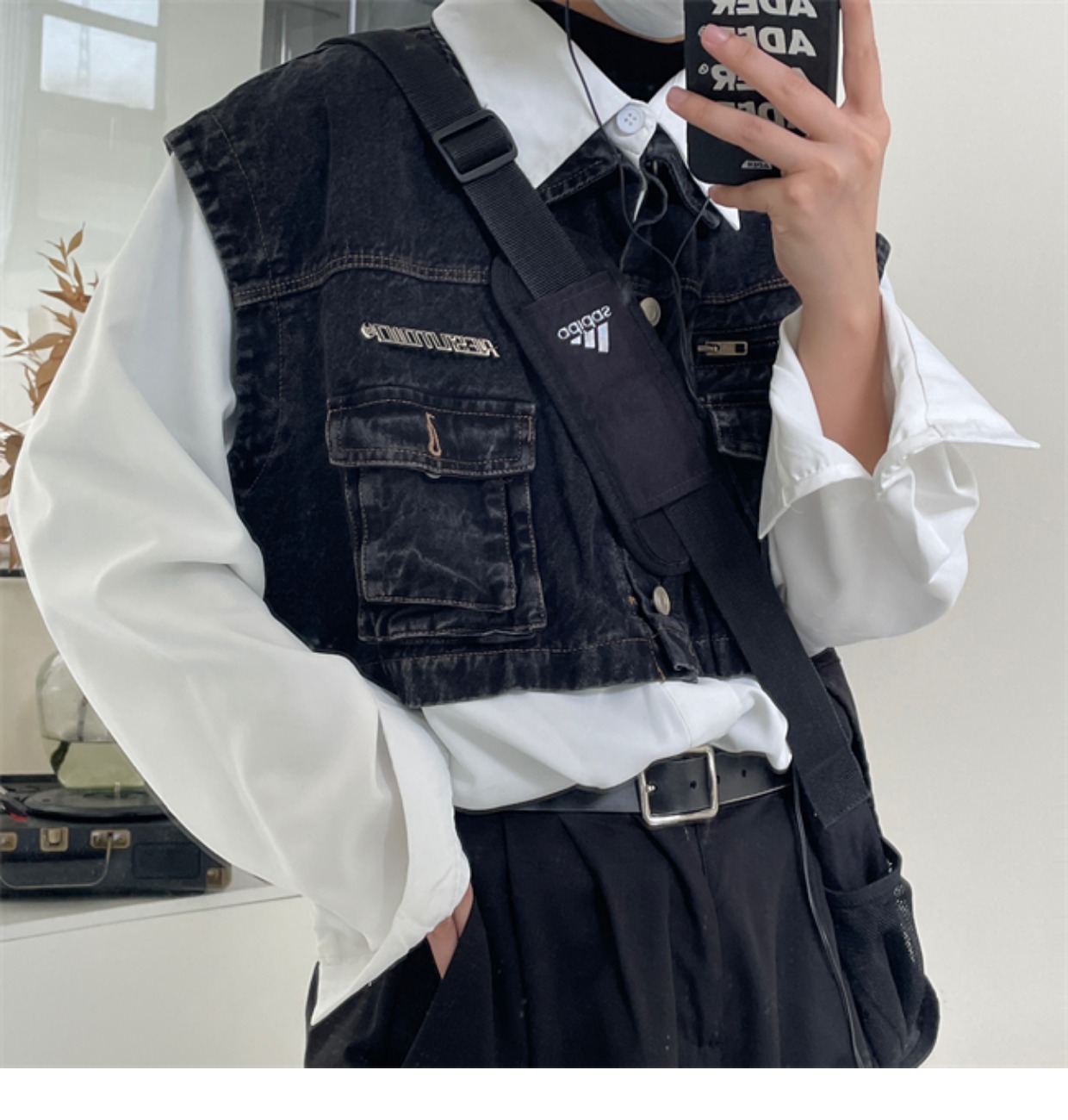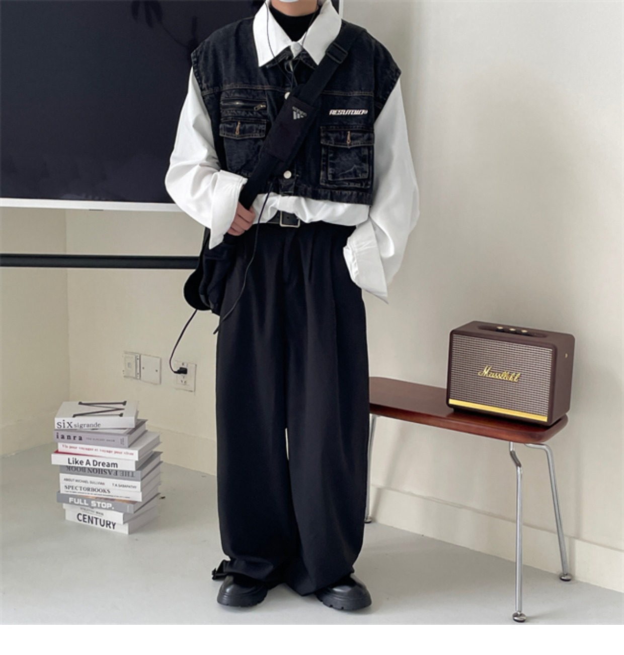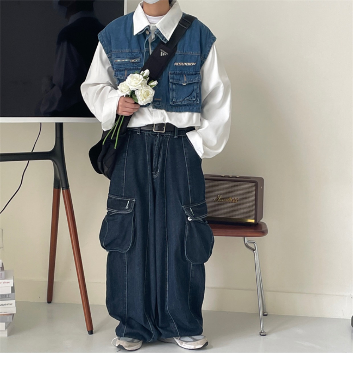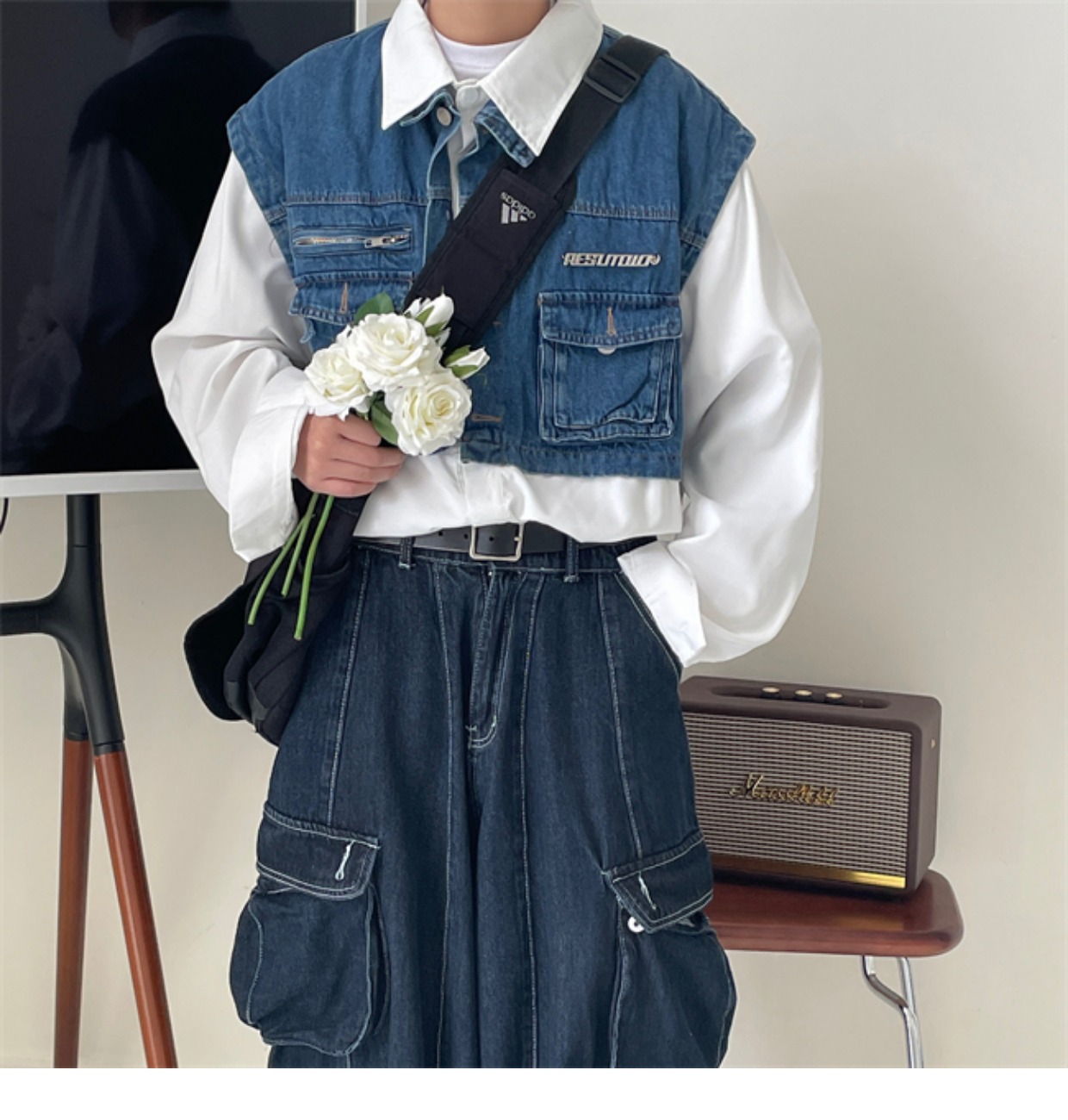 巨獸人自制春秋牛仔襯衫假兩件上衣2023新款小眾設計翻領長袖襯衫
