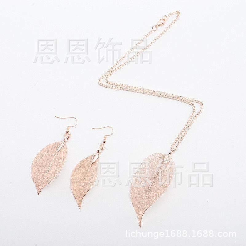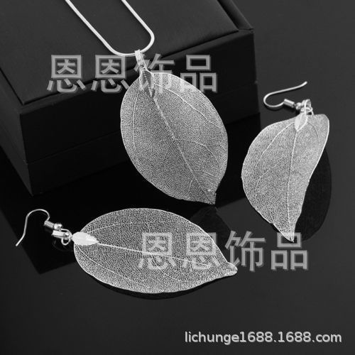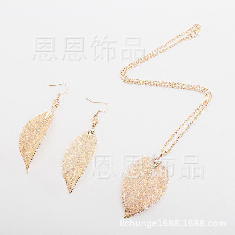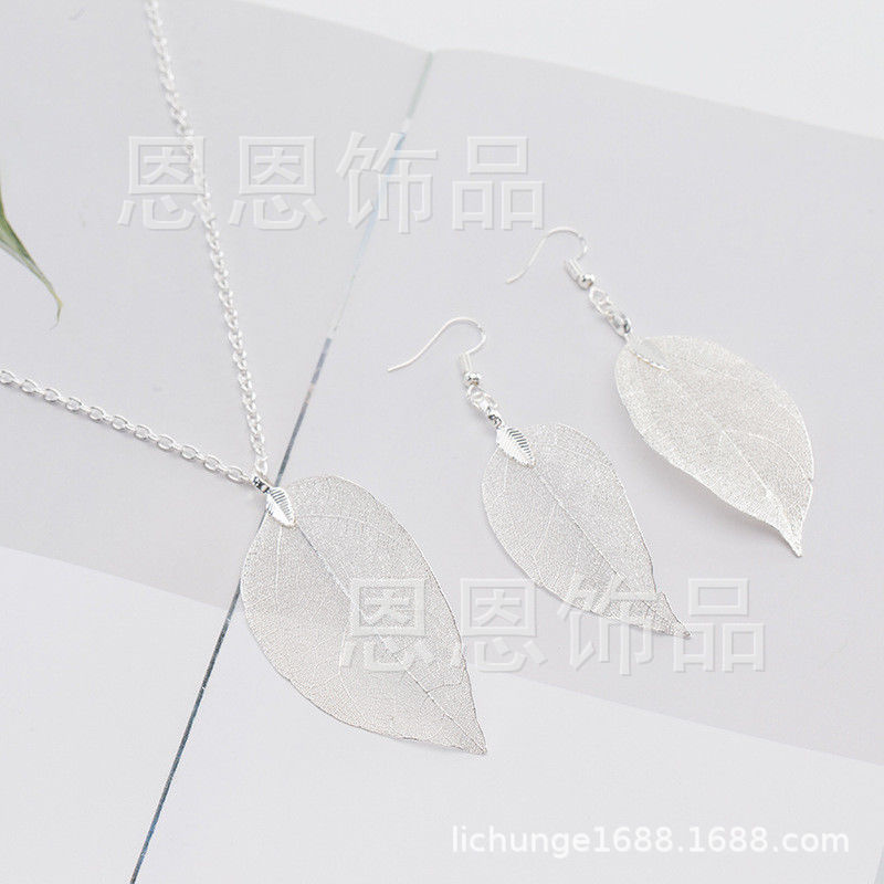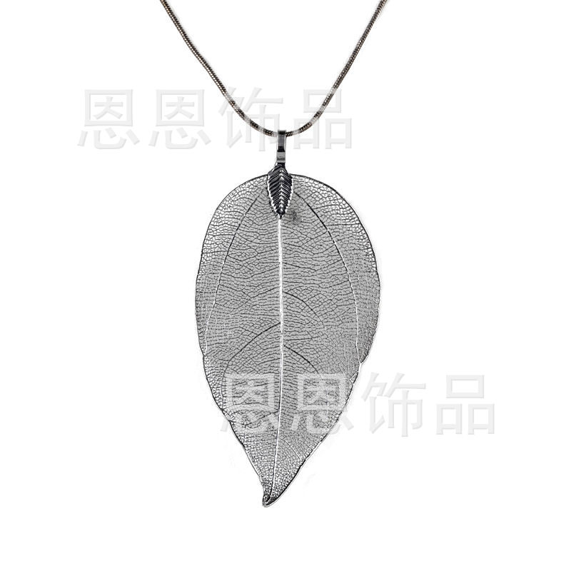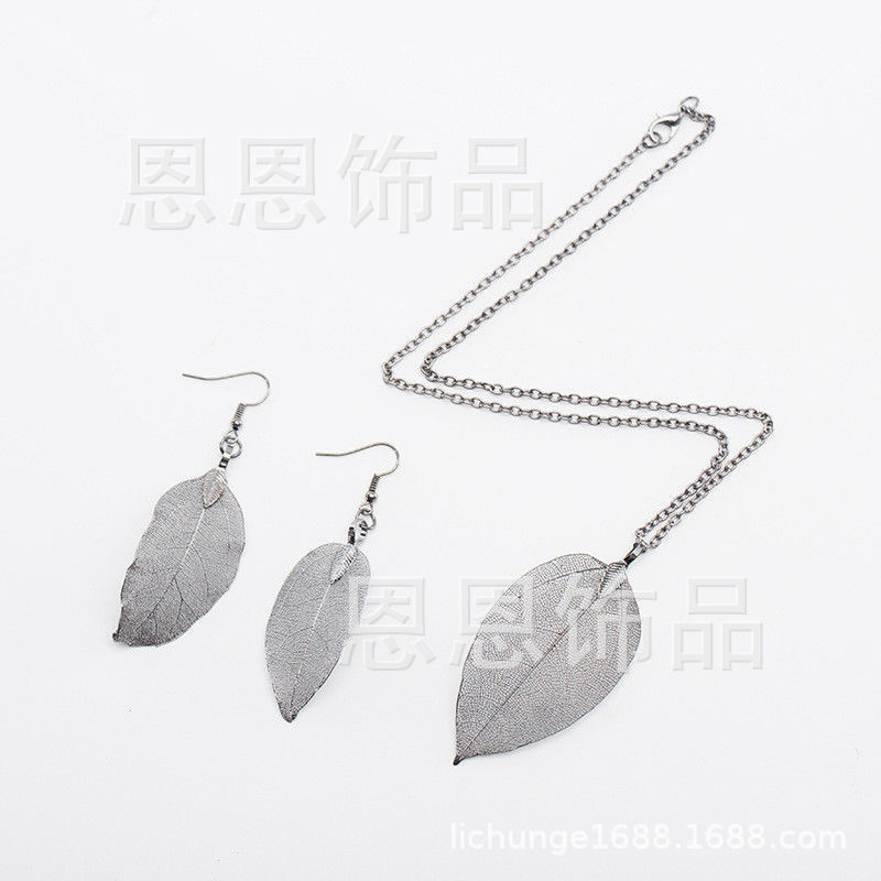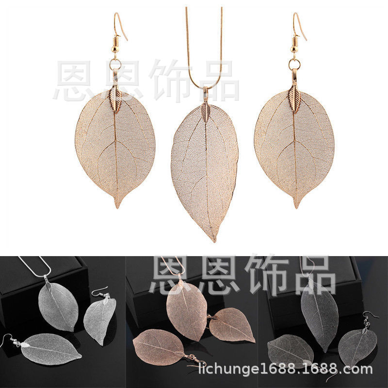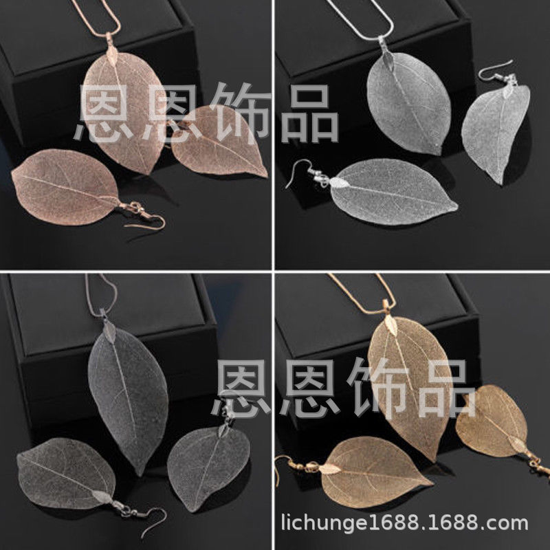 四色两件套女人叶吊坠长毛衣链项链耳环 纯天然真树叶项饰耳饰