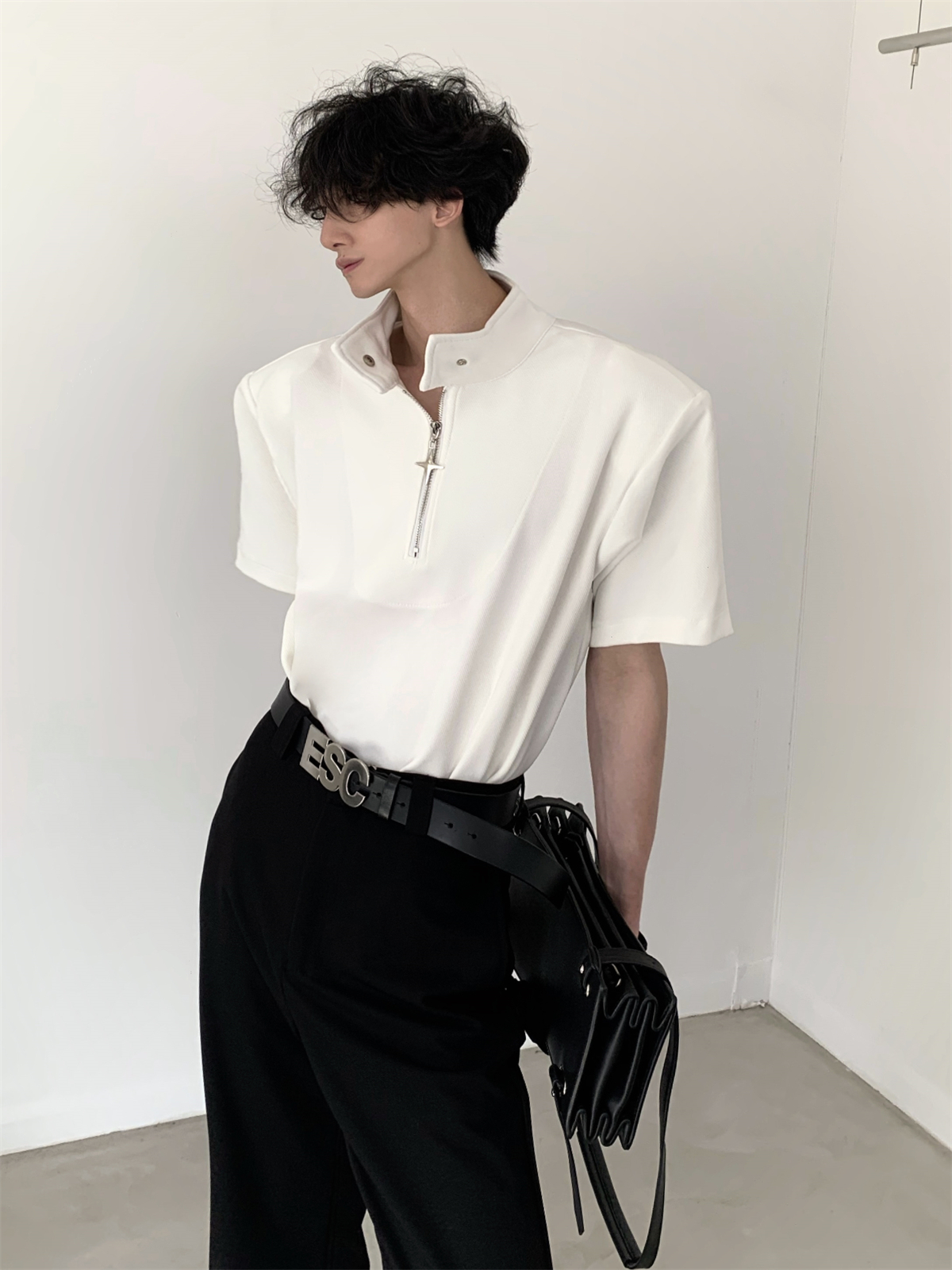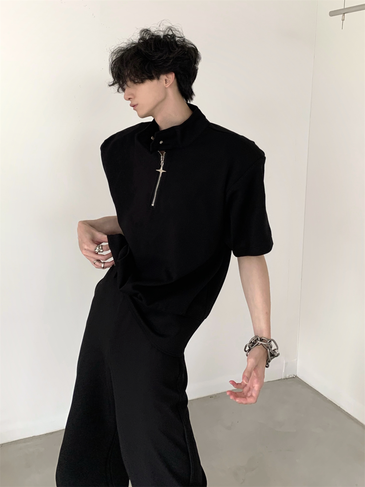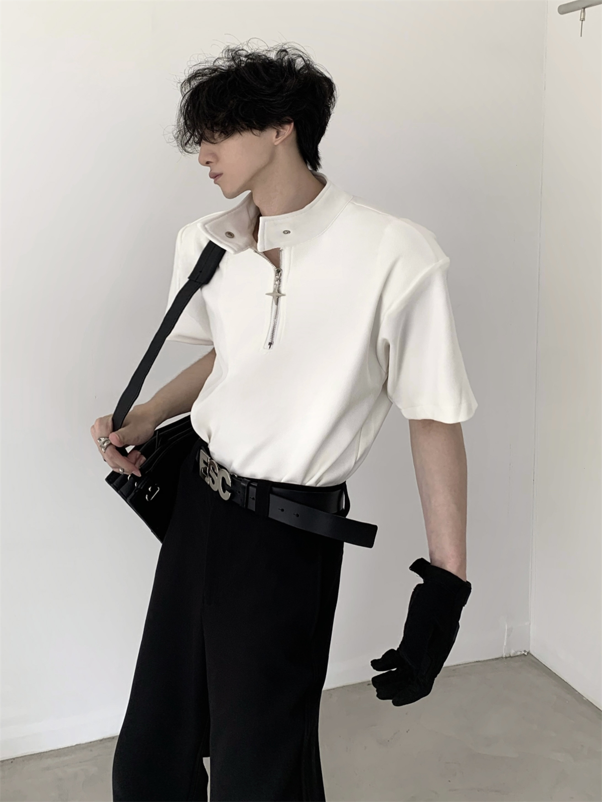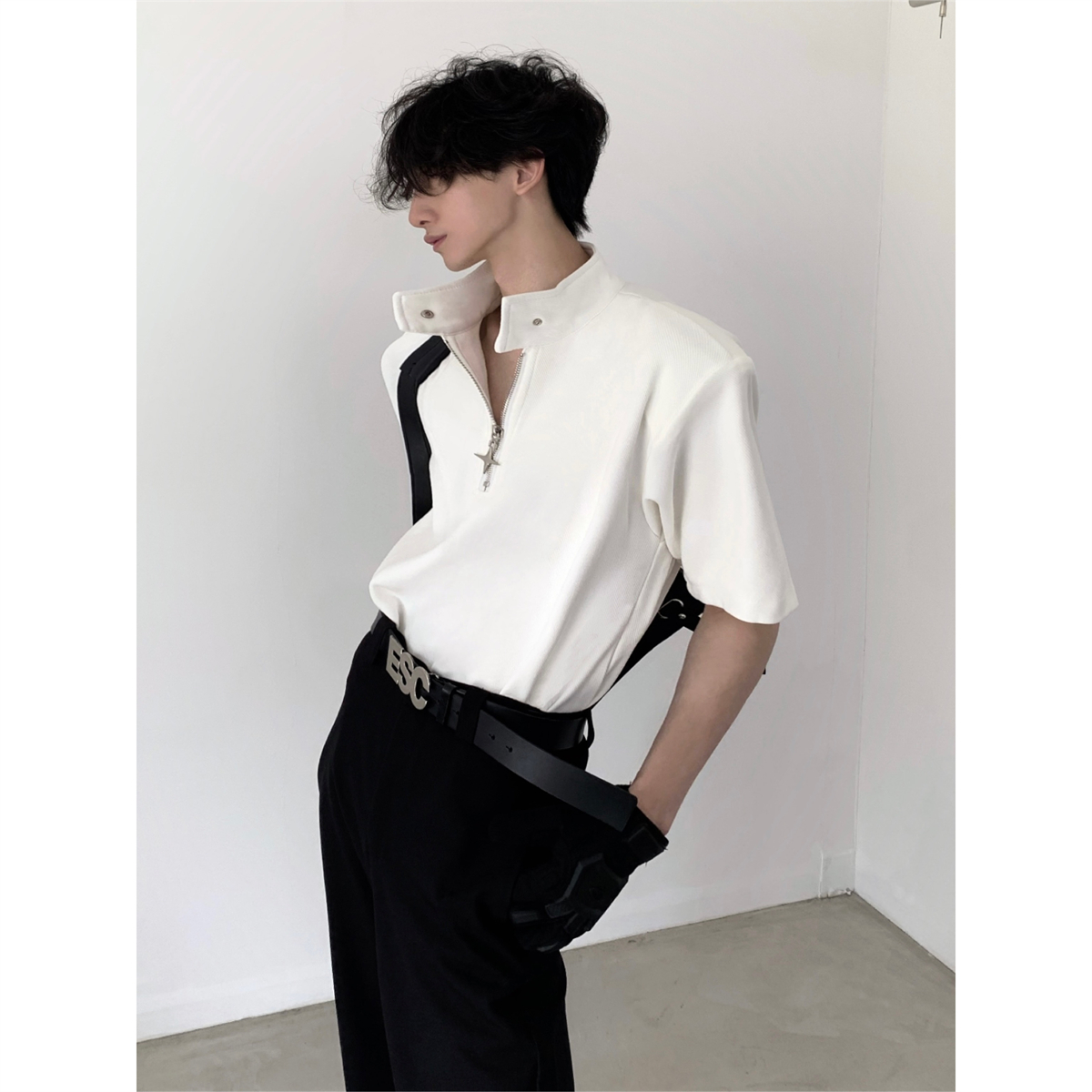 秋山風/小眾半拉鍊設計感墊肩T恤男款夏季polo衫高級感短袖上衣潮
