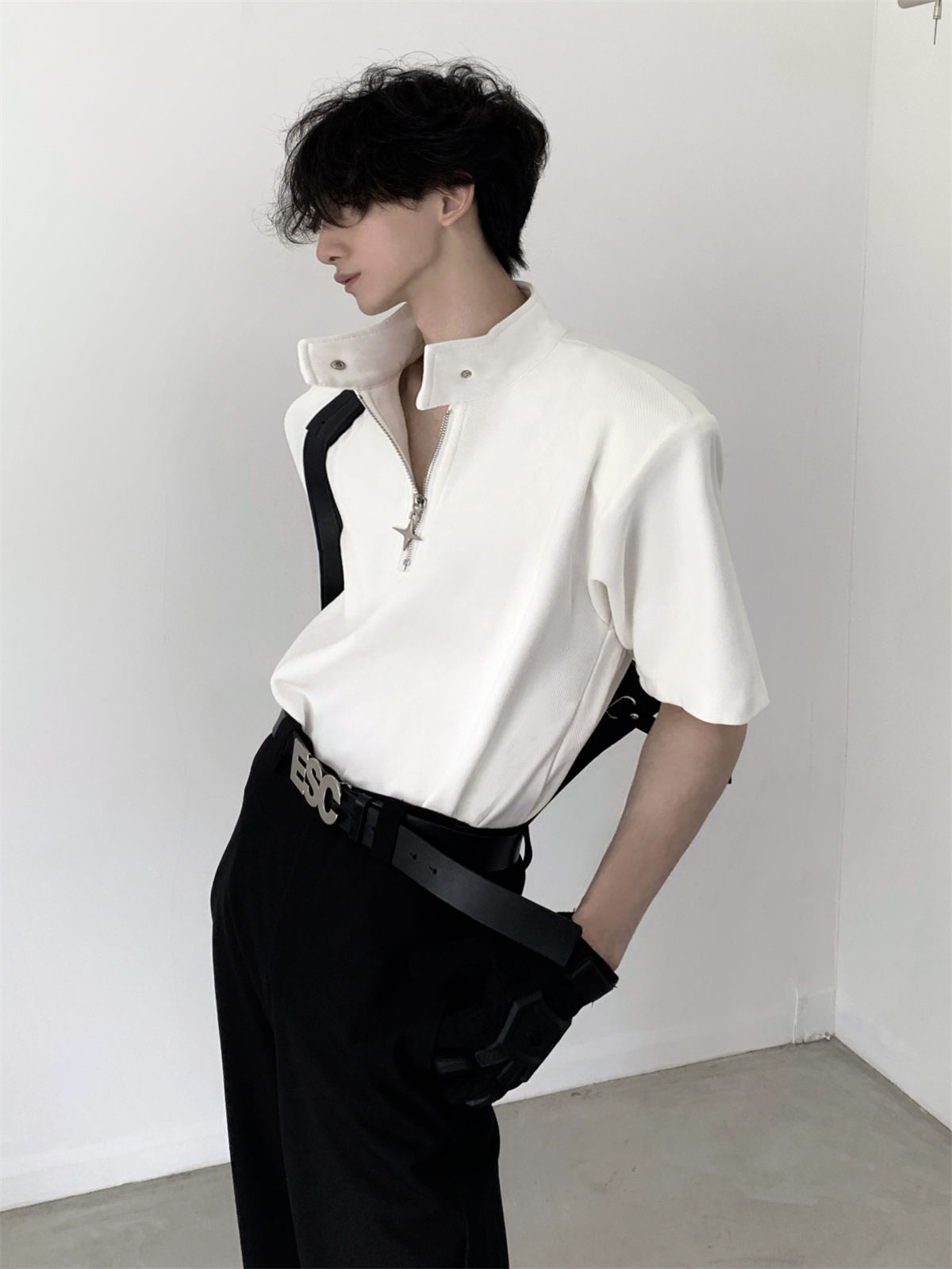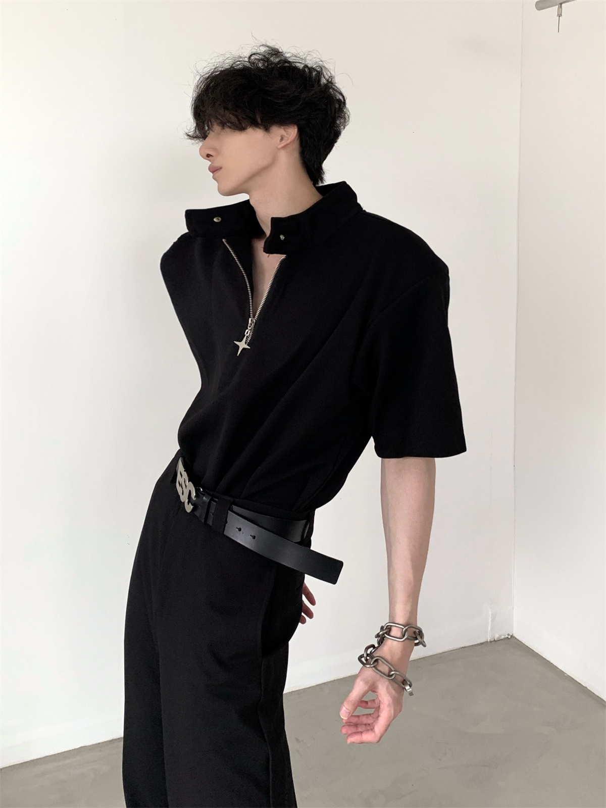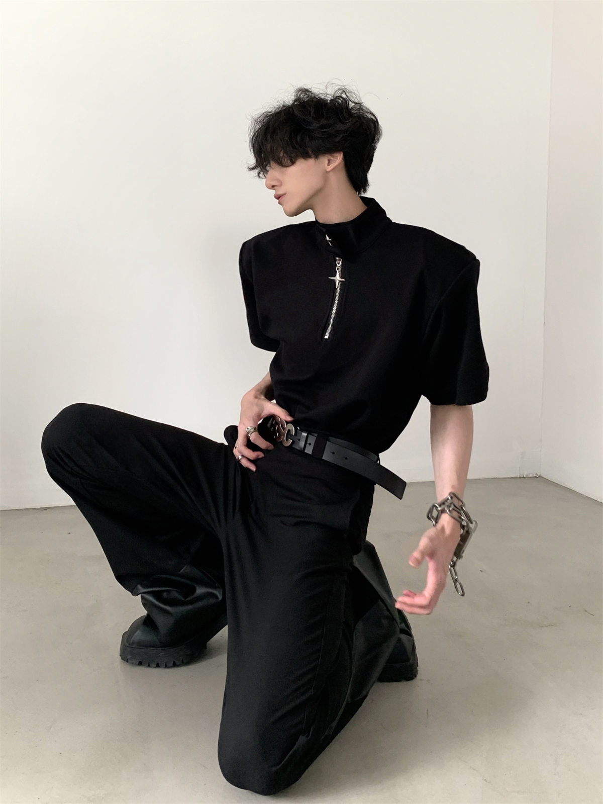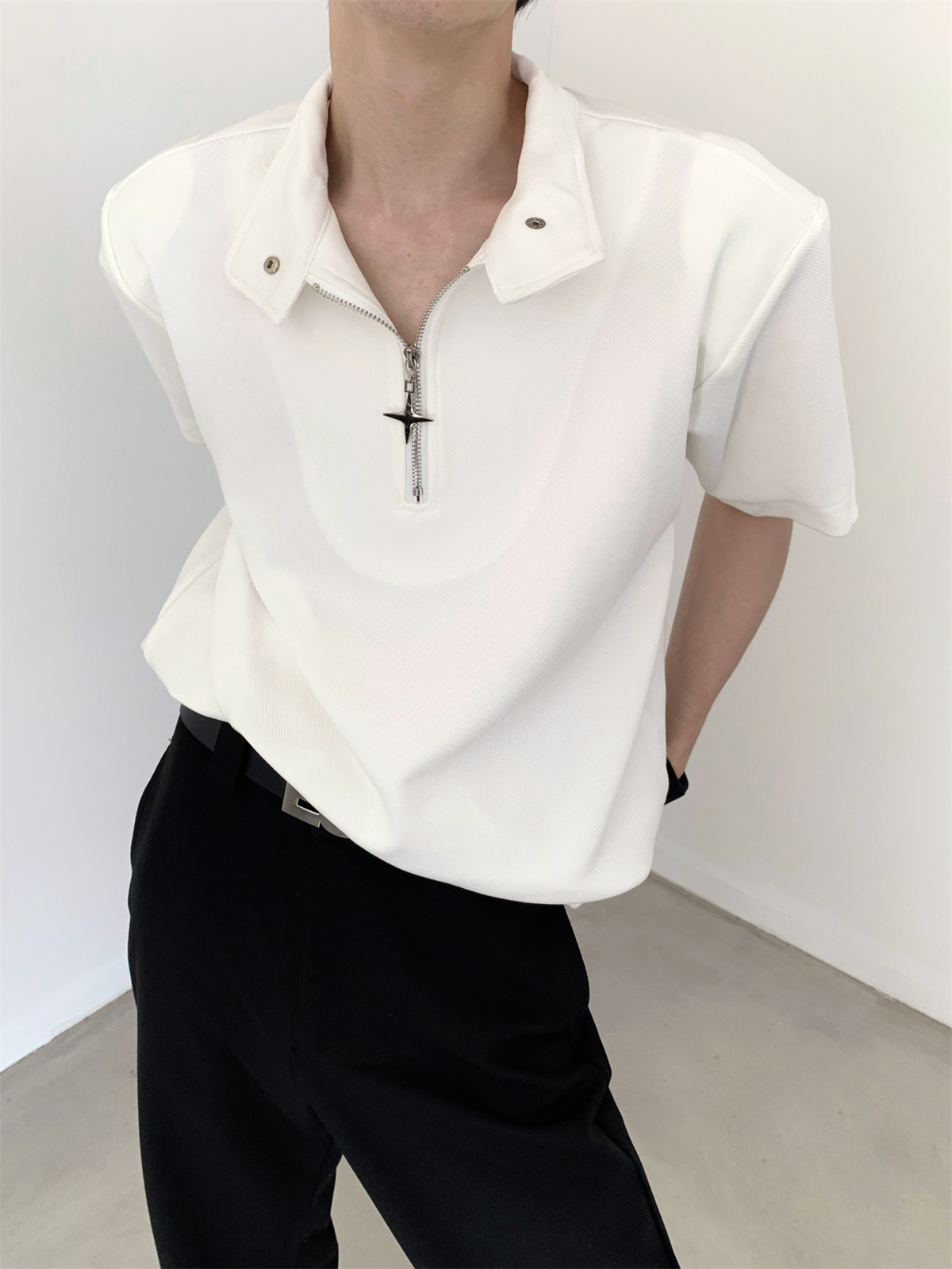 秋山風/小眾半拉鍊設計感墊肩T恤男款夏季polo衫高級感短袖上衣潮