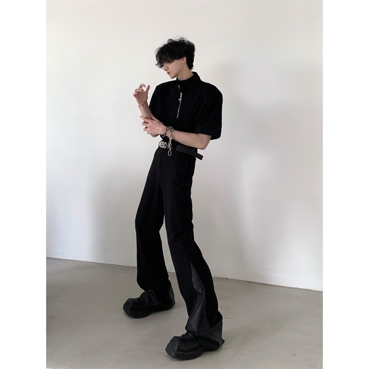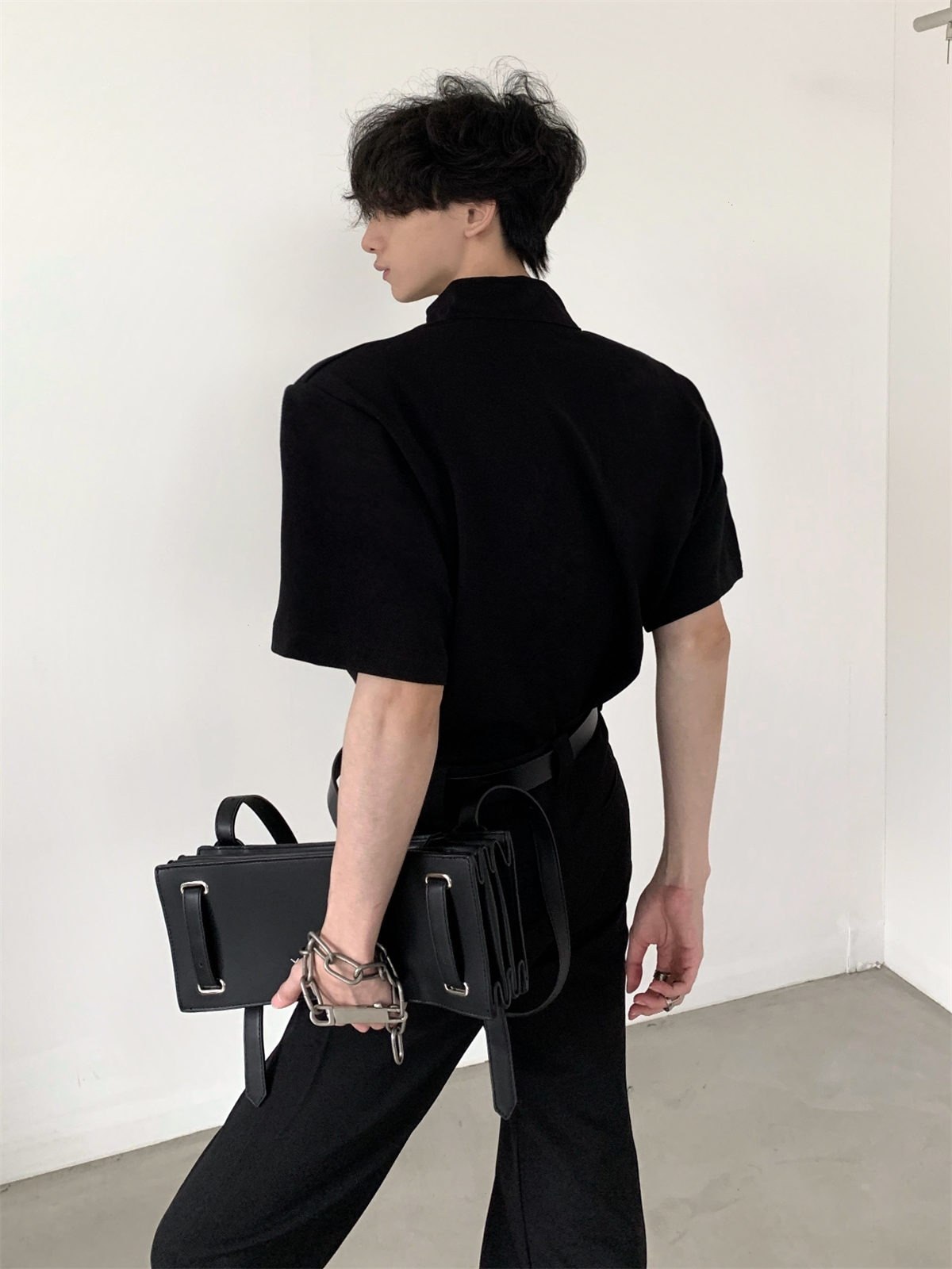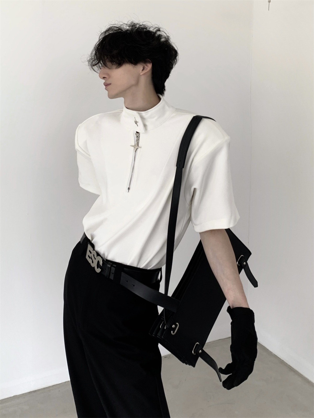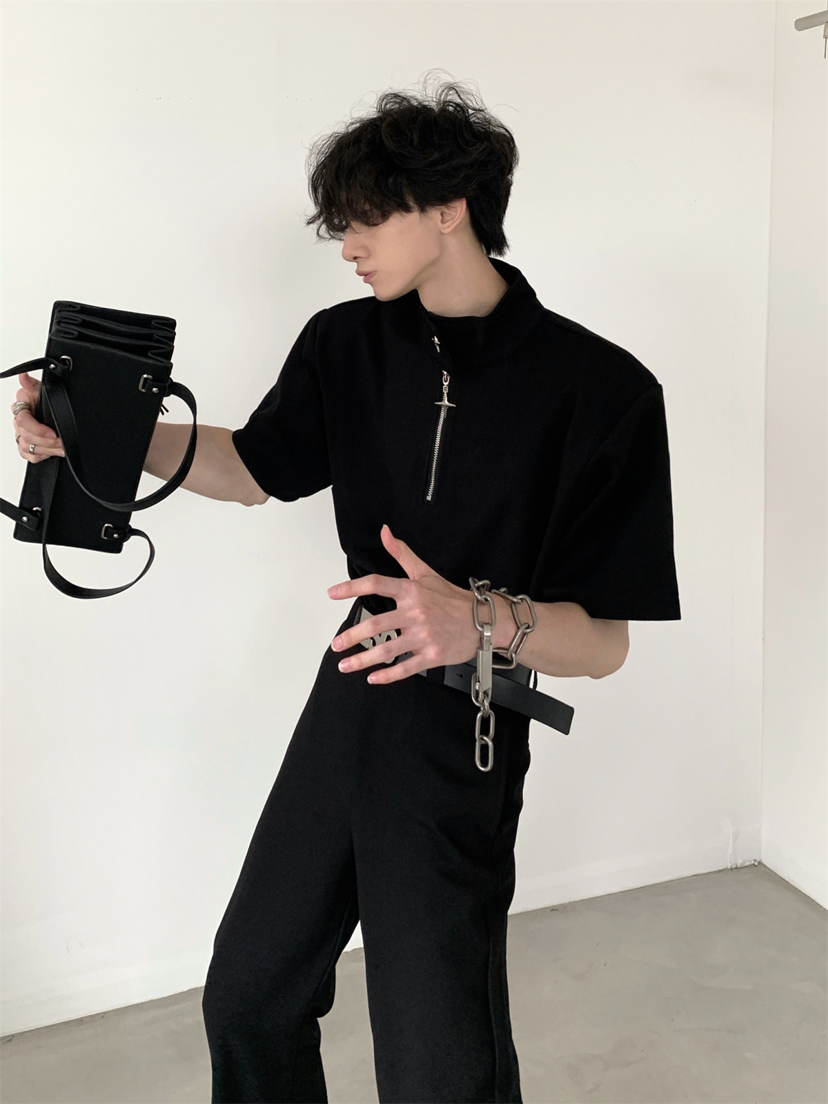 秋山風/小眾半拉鍊設計感墊肩T恤男款夏季polo衫高級感短袖上衣潮