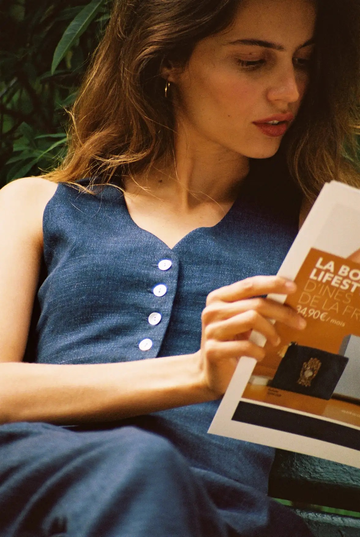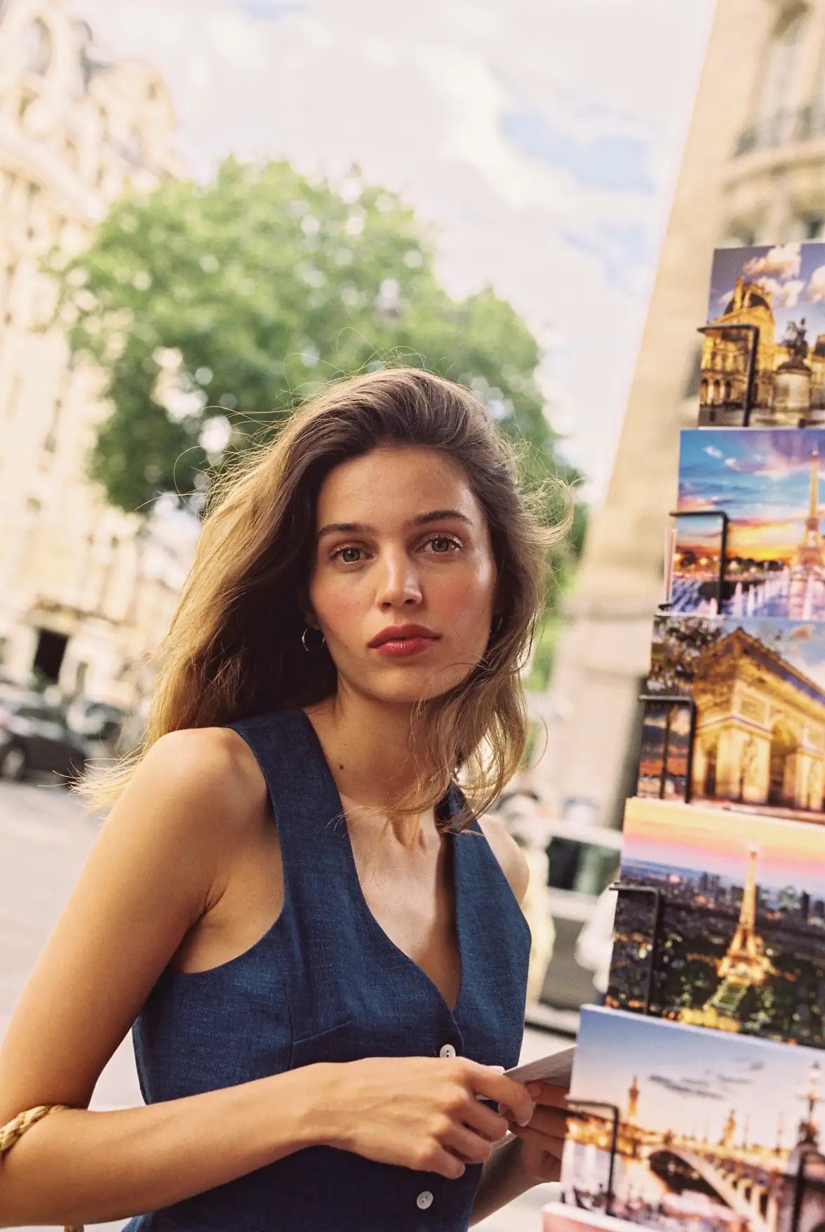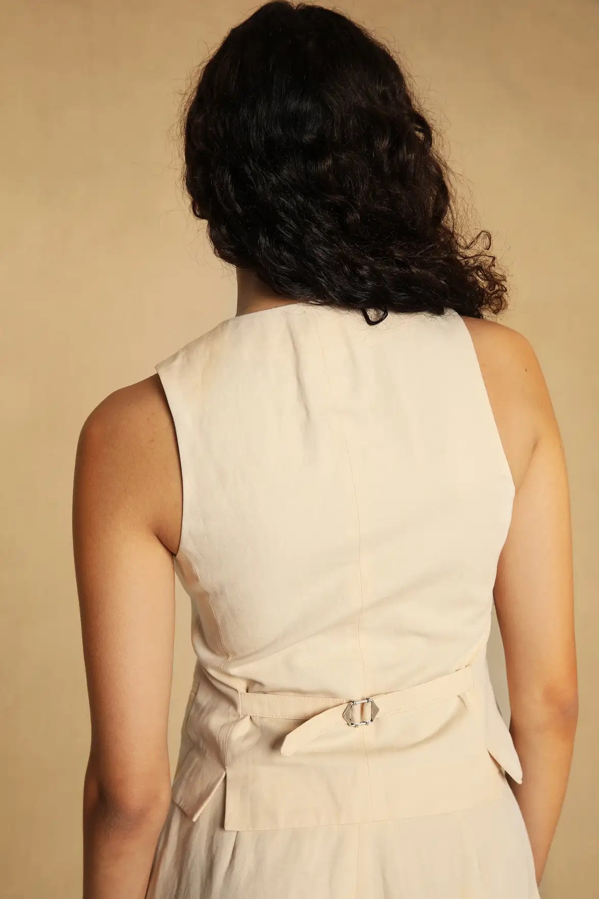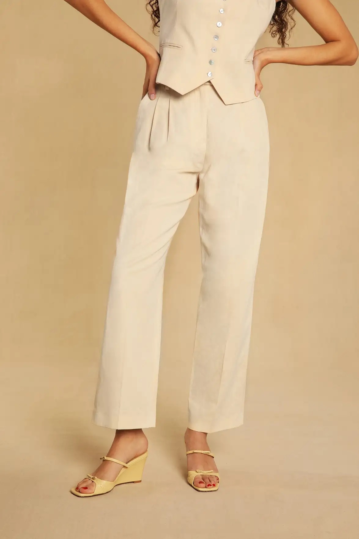 法系女装RO2023年商务英伦风亚麻短款无袖背心+长裤两件套装30948