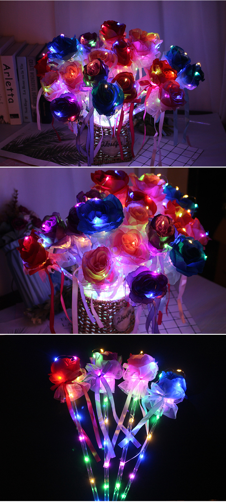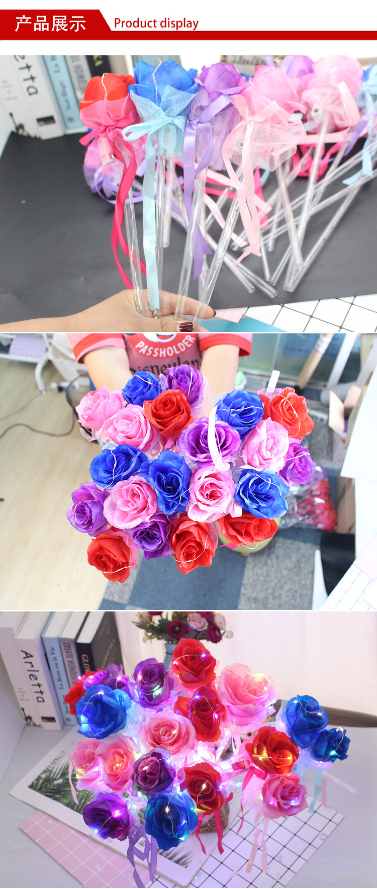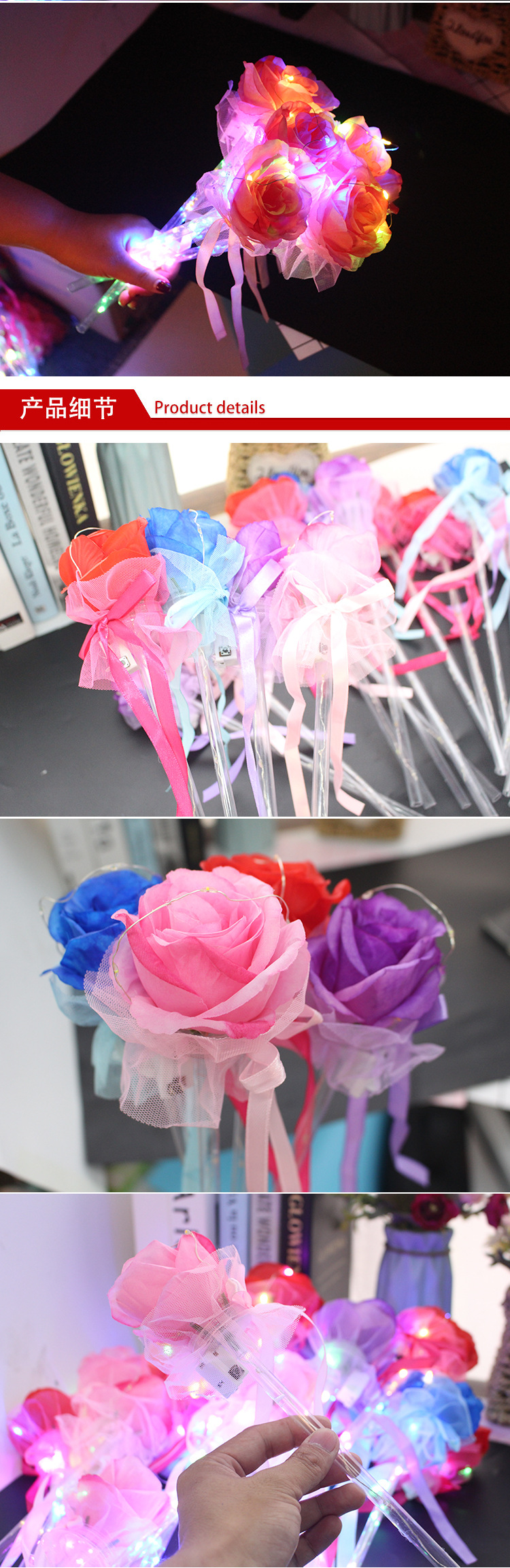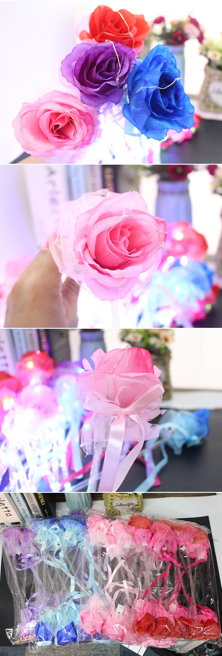 发光玫瑰花 七彩玫瑰花棒 七夕情人节表白花束公园地摊热卖批发