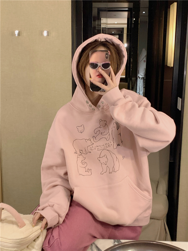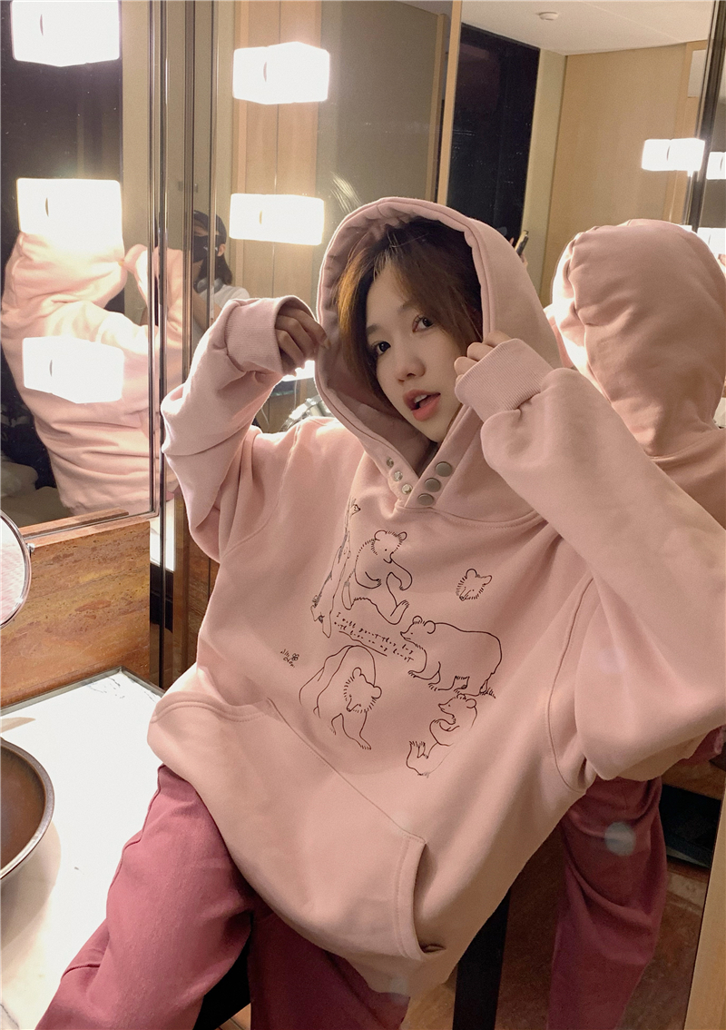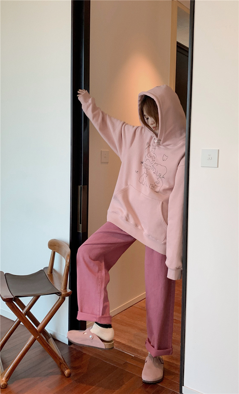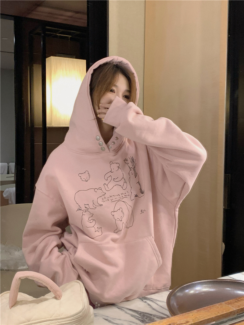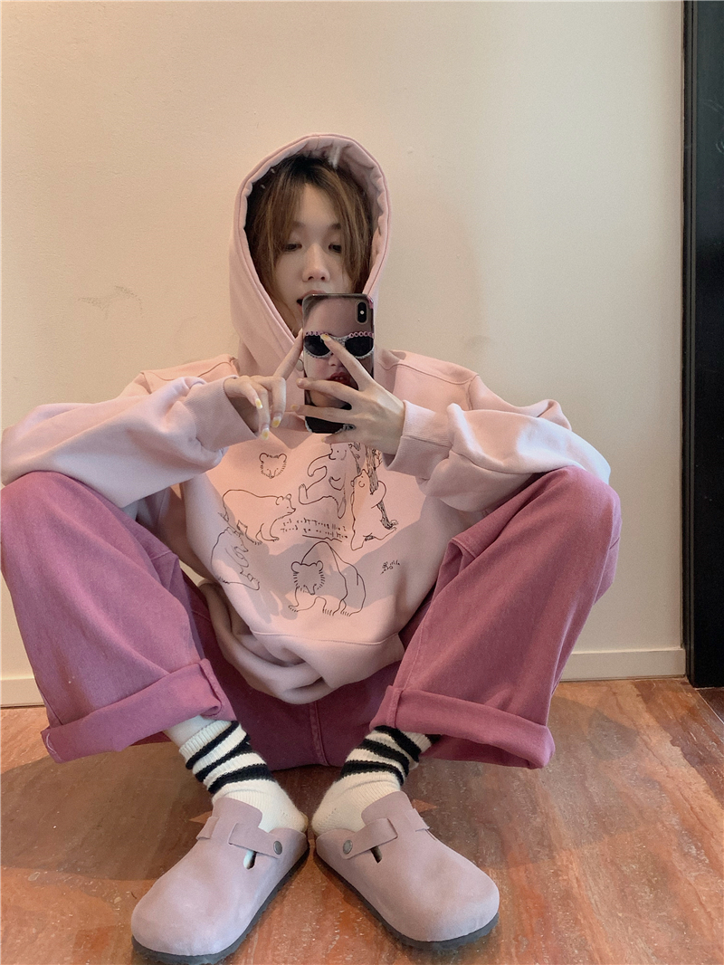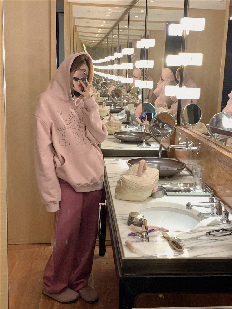 慵懶風連帽加絨衛衣外套女秋冬美式復古設計感oversize粉色上衣