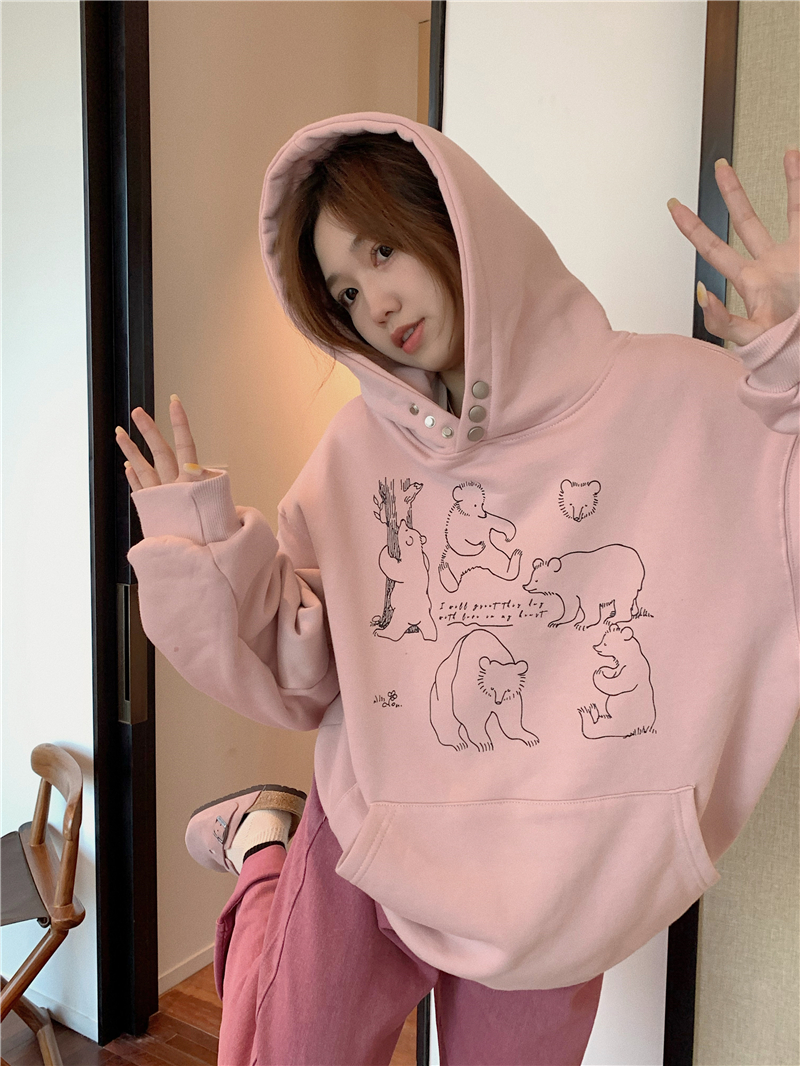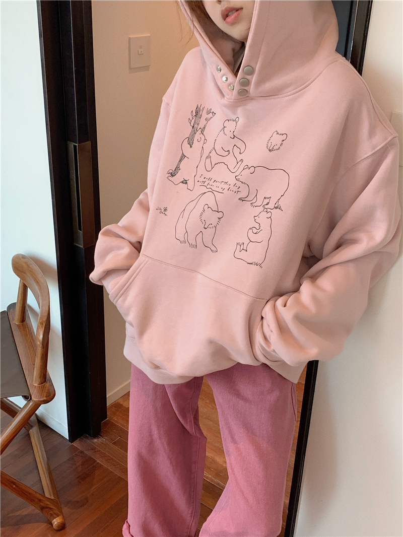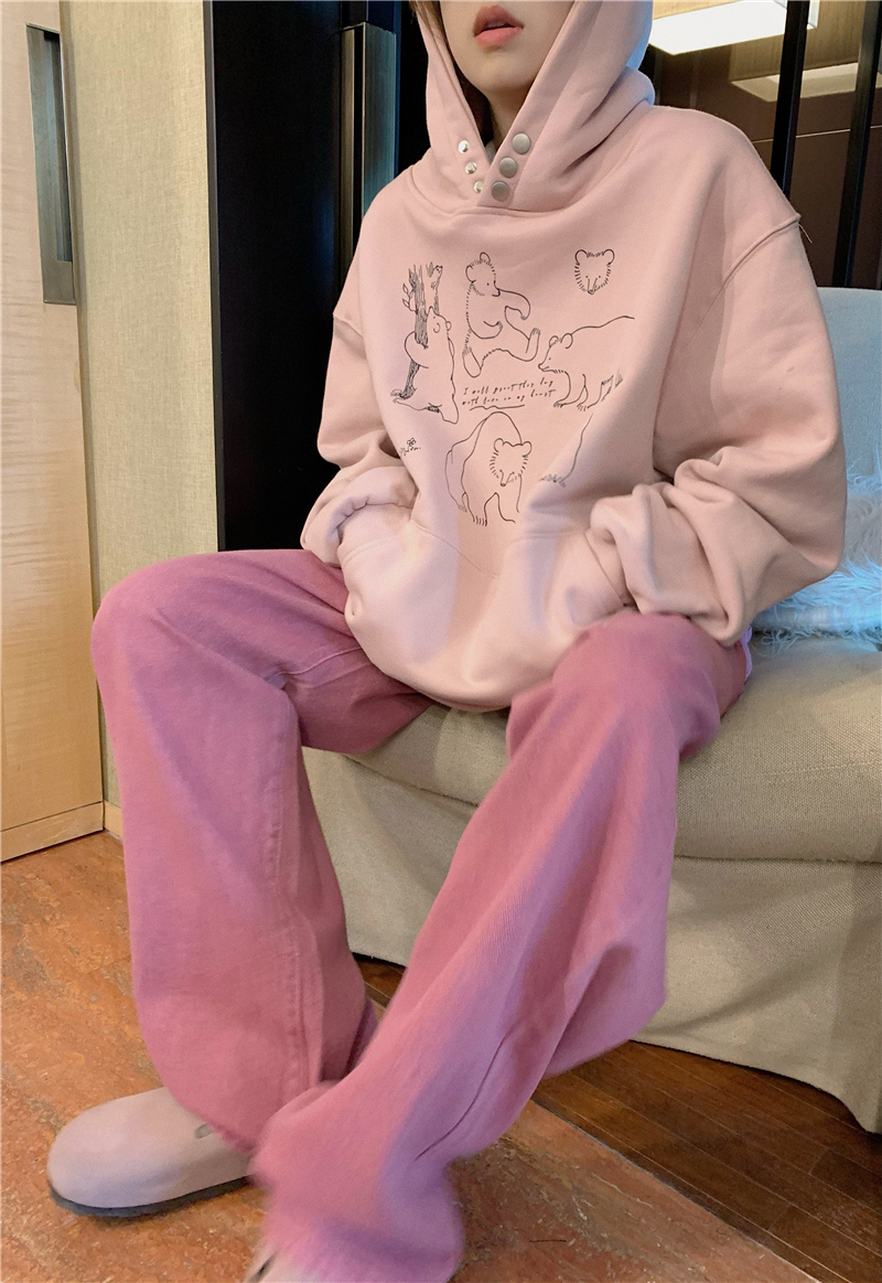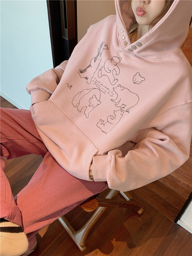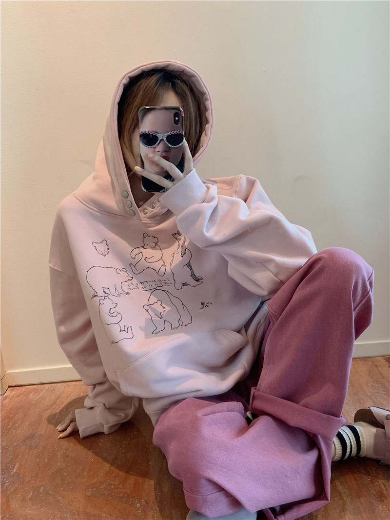 慵懶風連帽加絨衛衣外套女秋冬美式復古設計感oversize粉色上衣