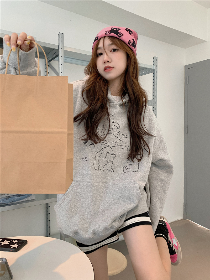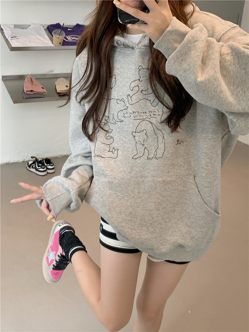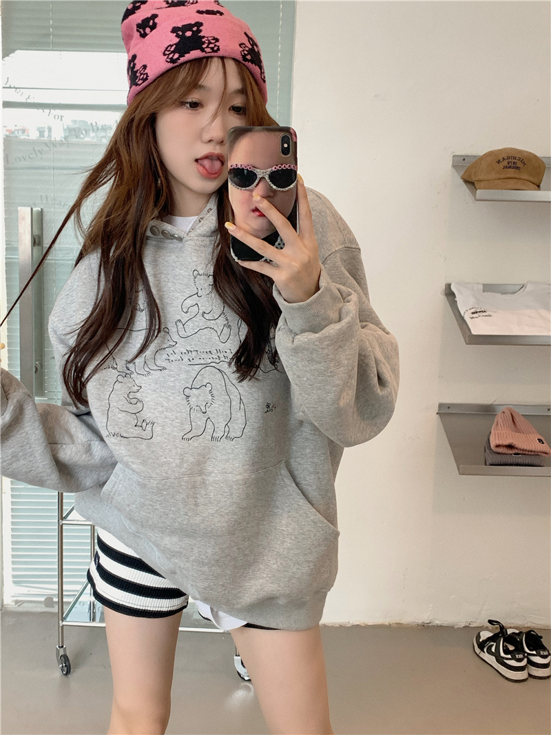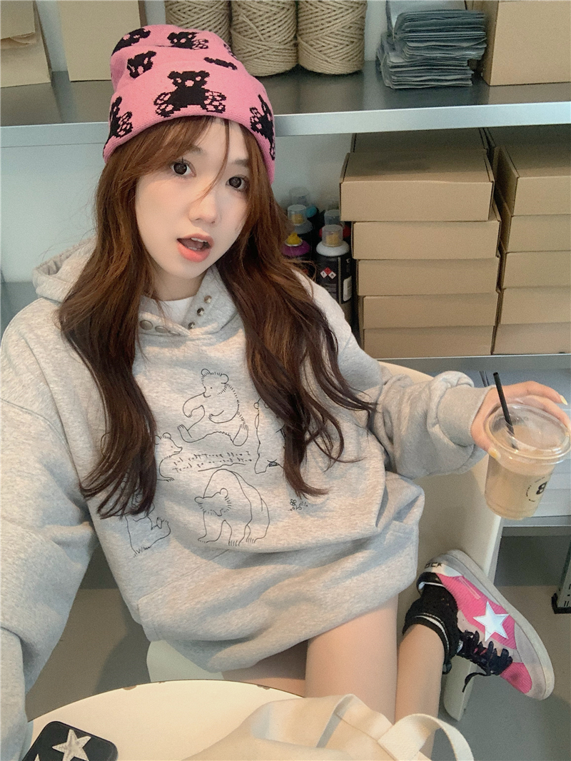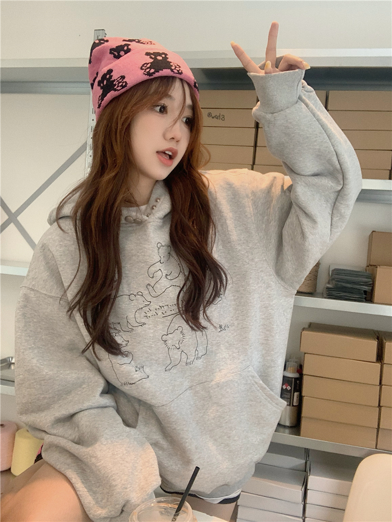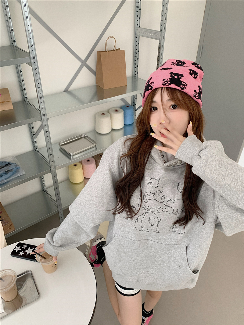 慵懶風連帽加絨衛衣外套女秋冬美式復古設計感oversize粉色上衣