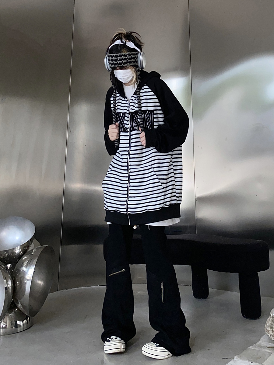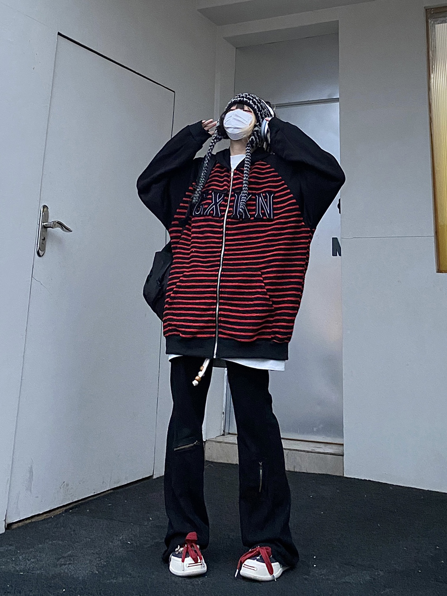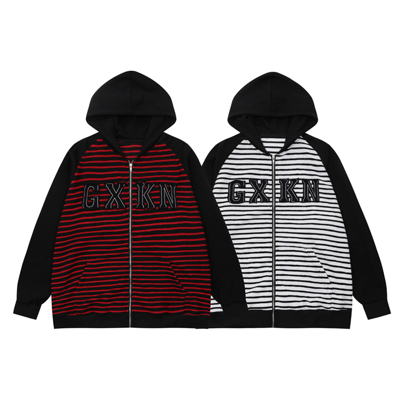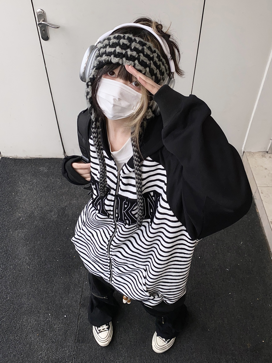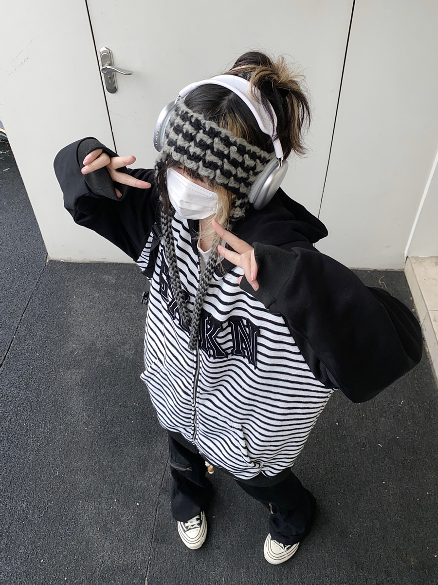 Take off咖哩人冬新款條紋拼接刺繡連帽運動衫加絨外套寬鬆男女復古