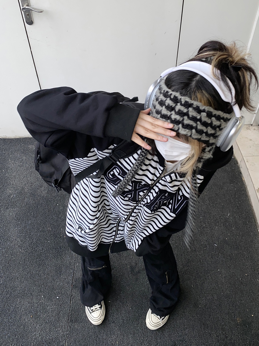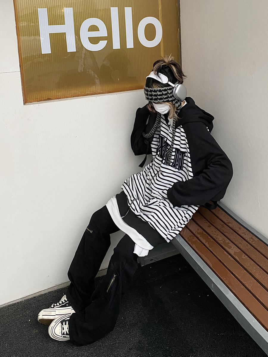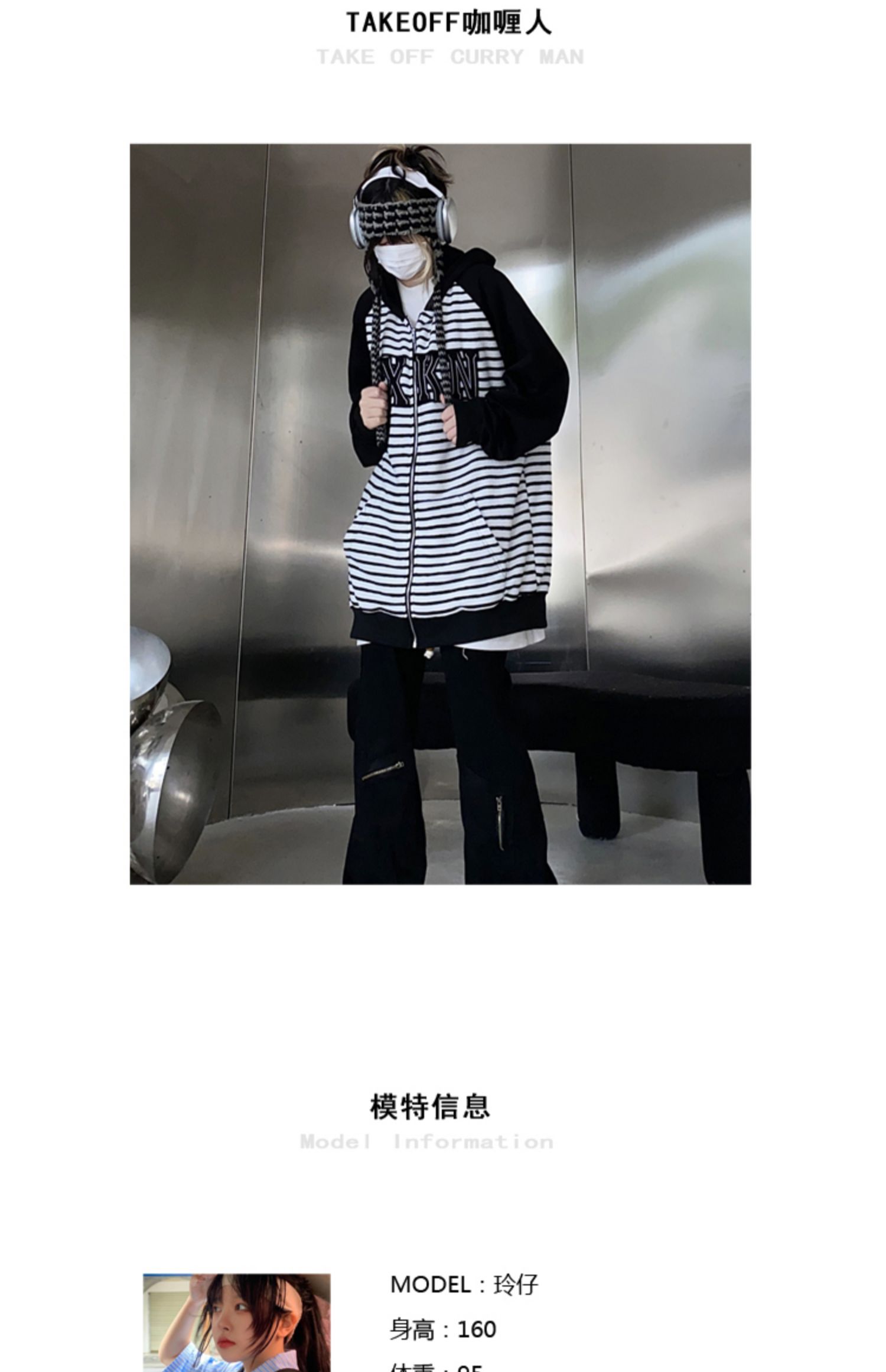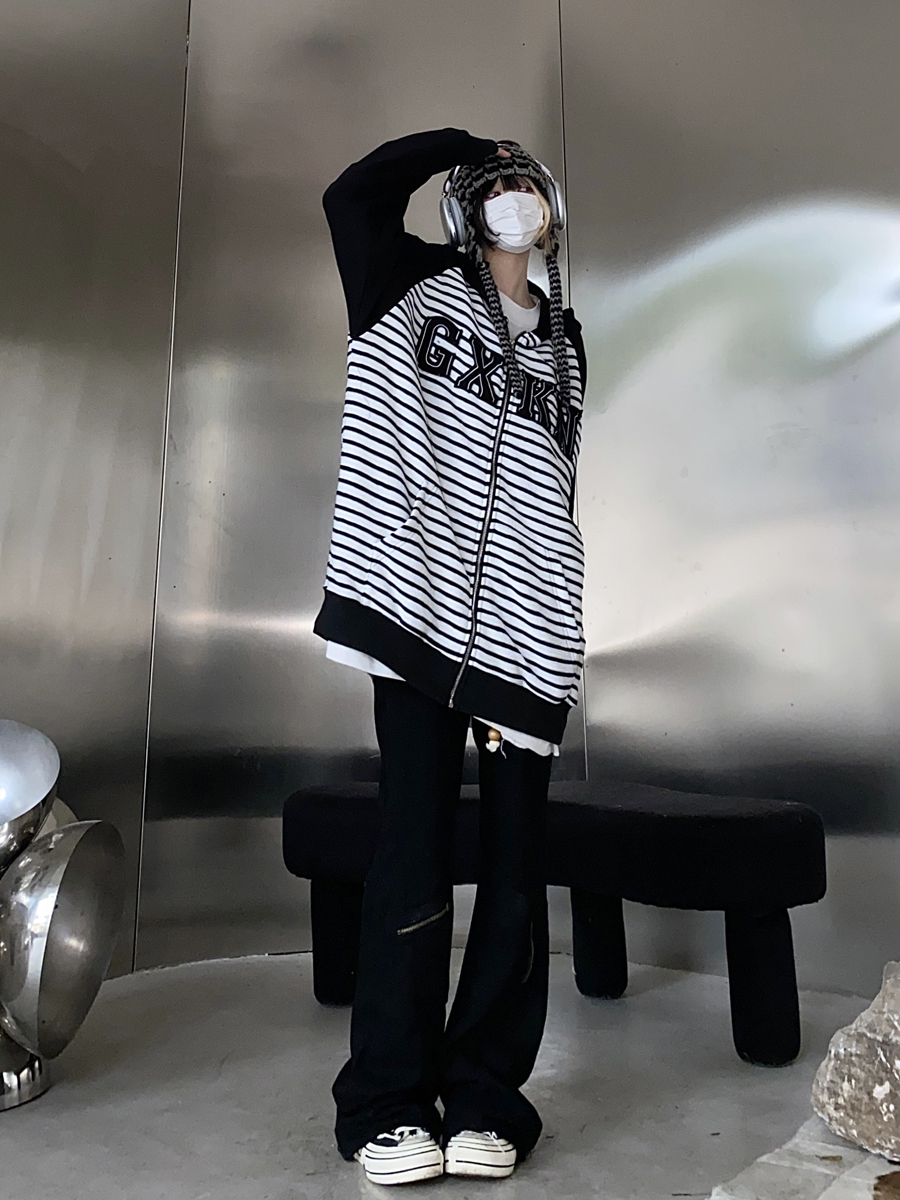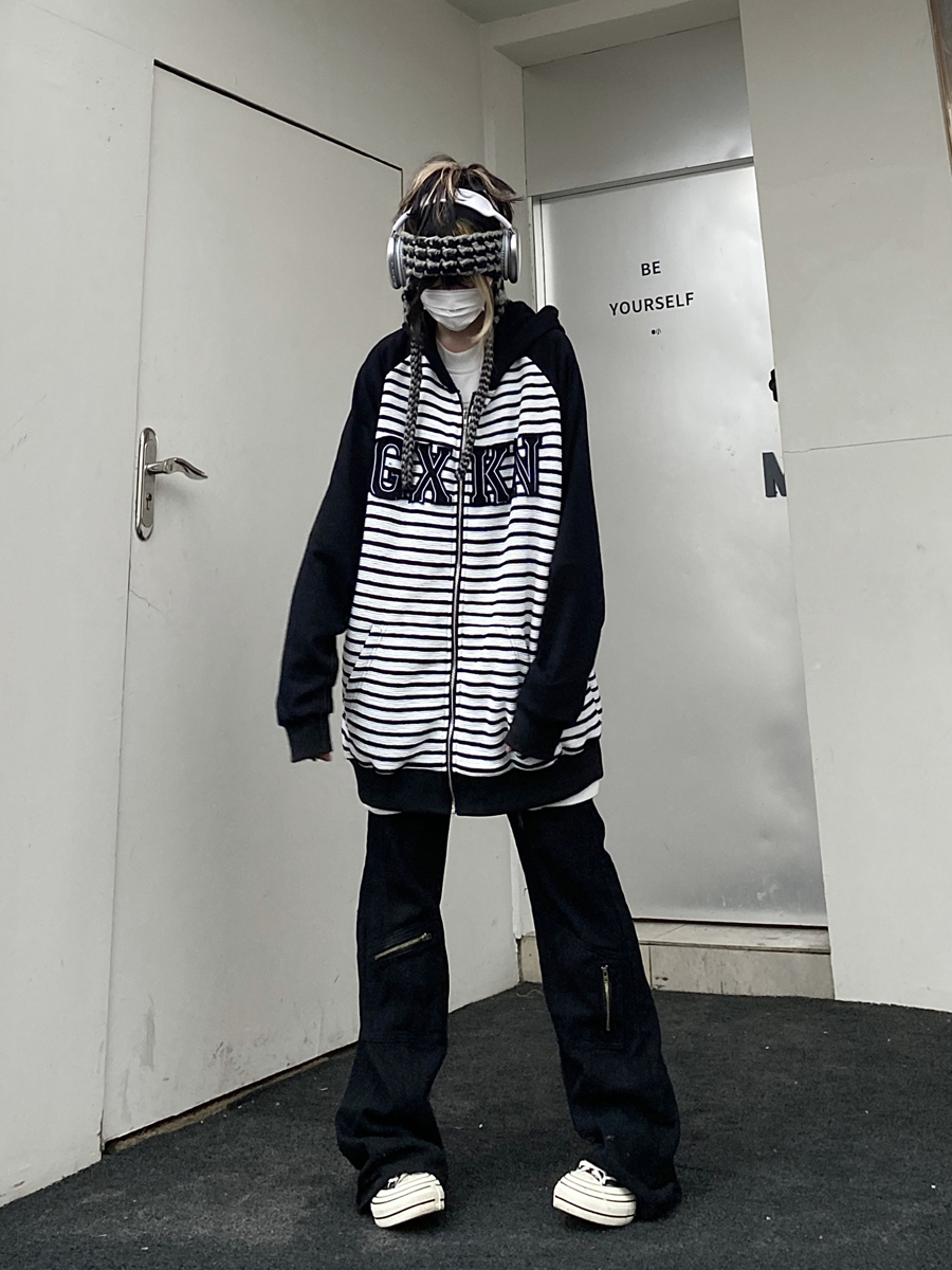 Take off咖哩人冬新款條紋拼接刺繡連帽運動衫加絨外套寬鬆男女復古