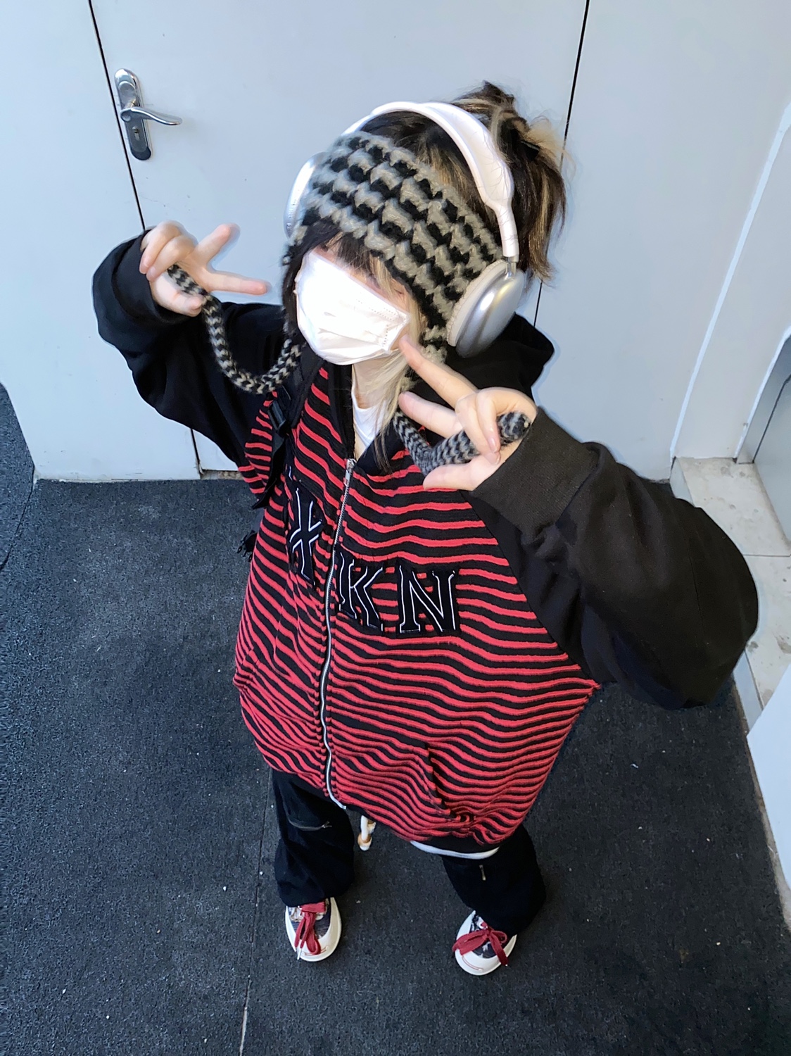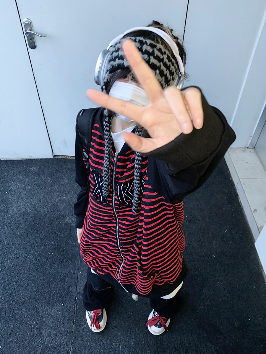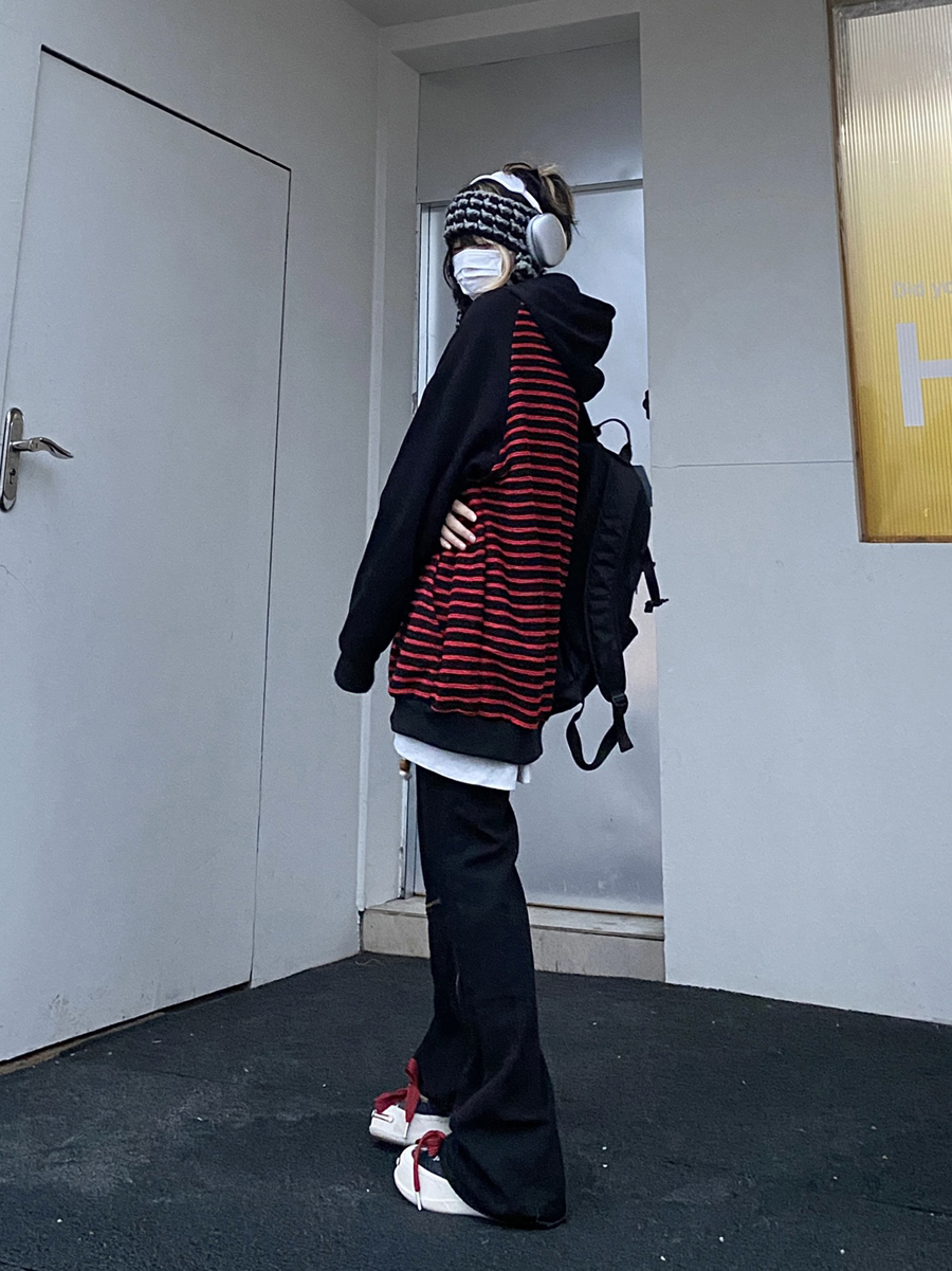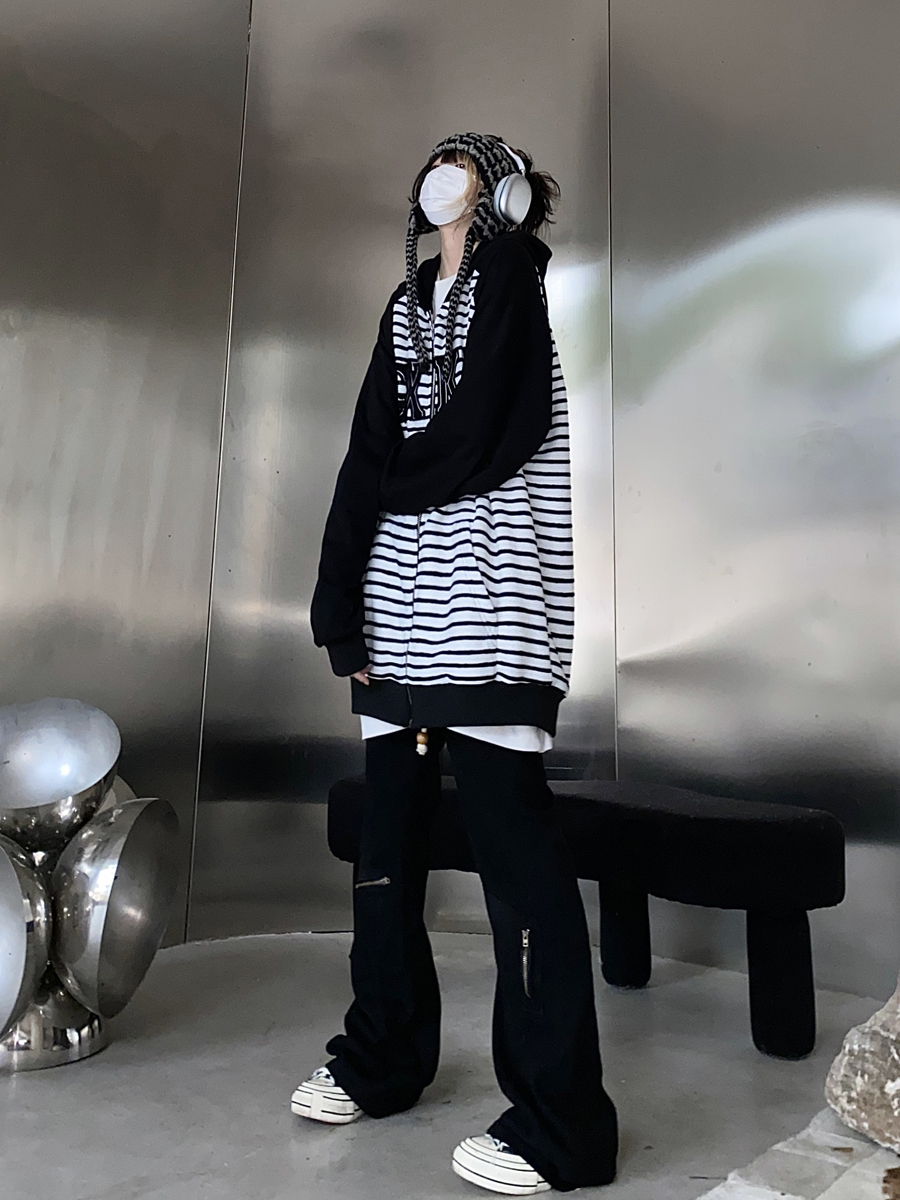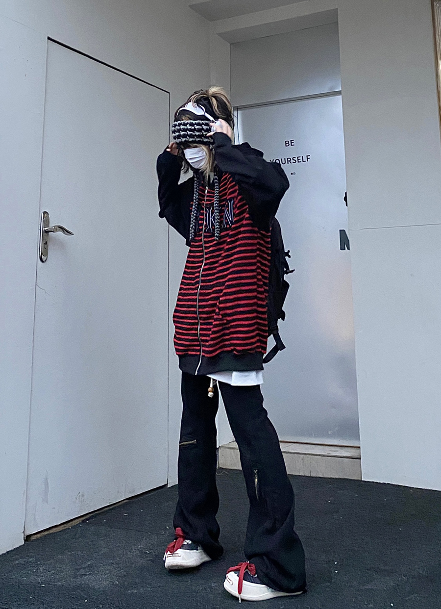 Take off咖哩人冬新款條紋拼接刺繡連帽運動衫加絨外套寬鬆男女復古