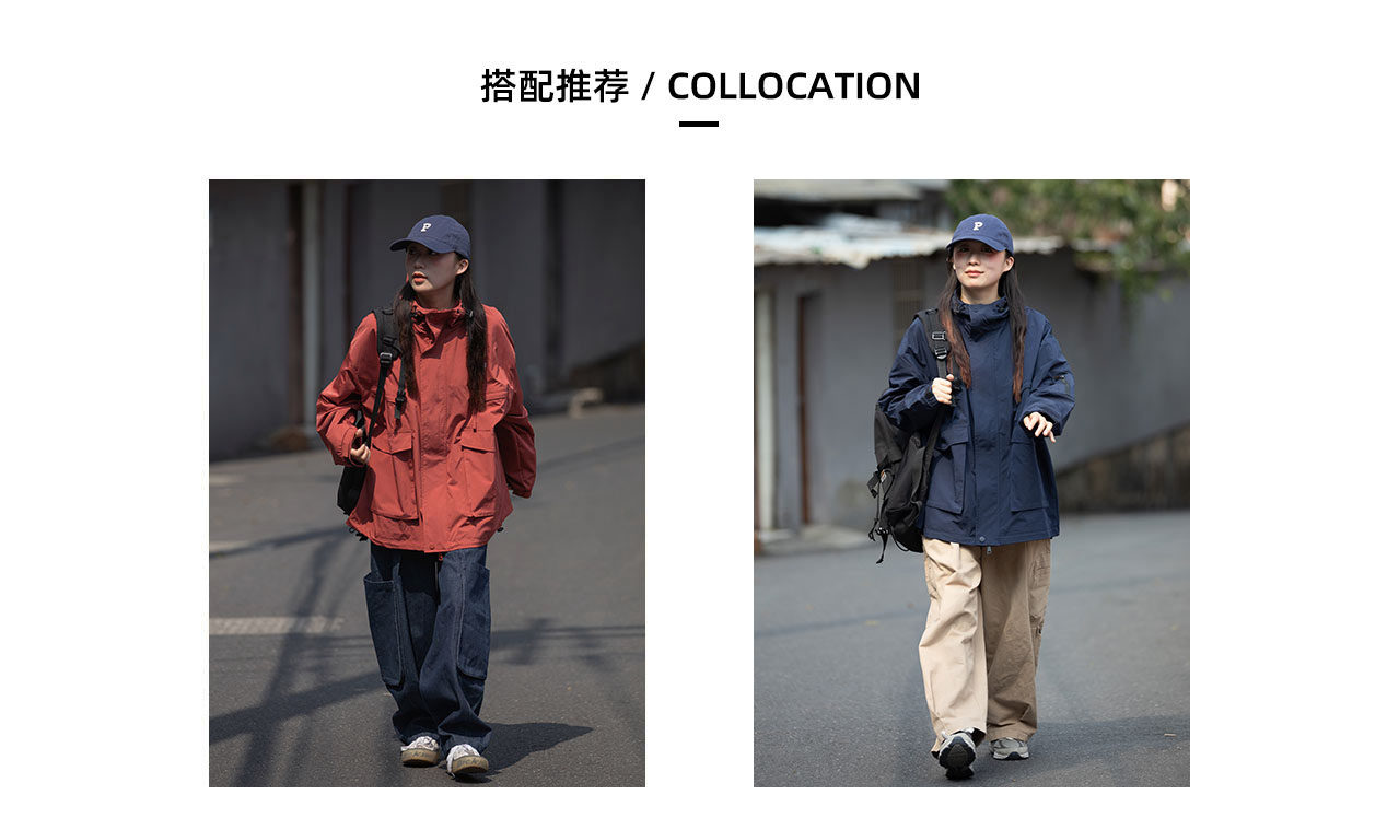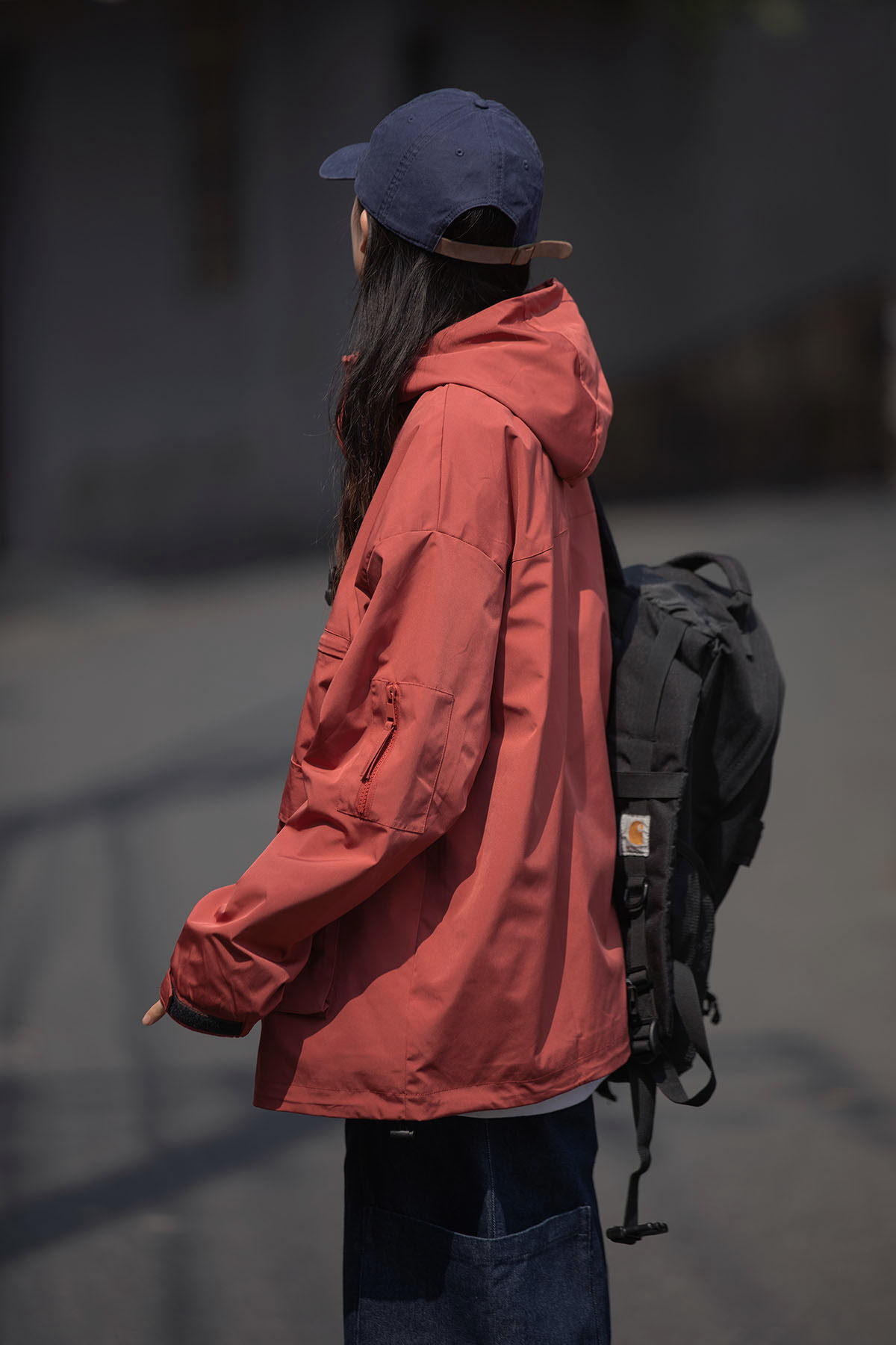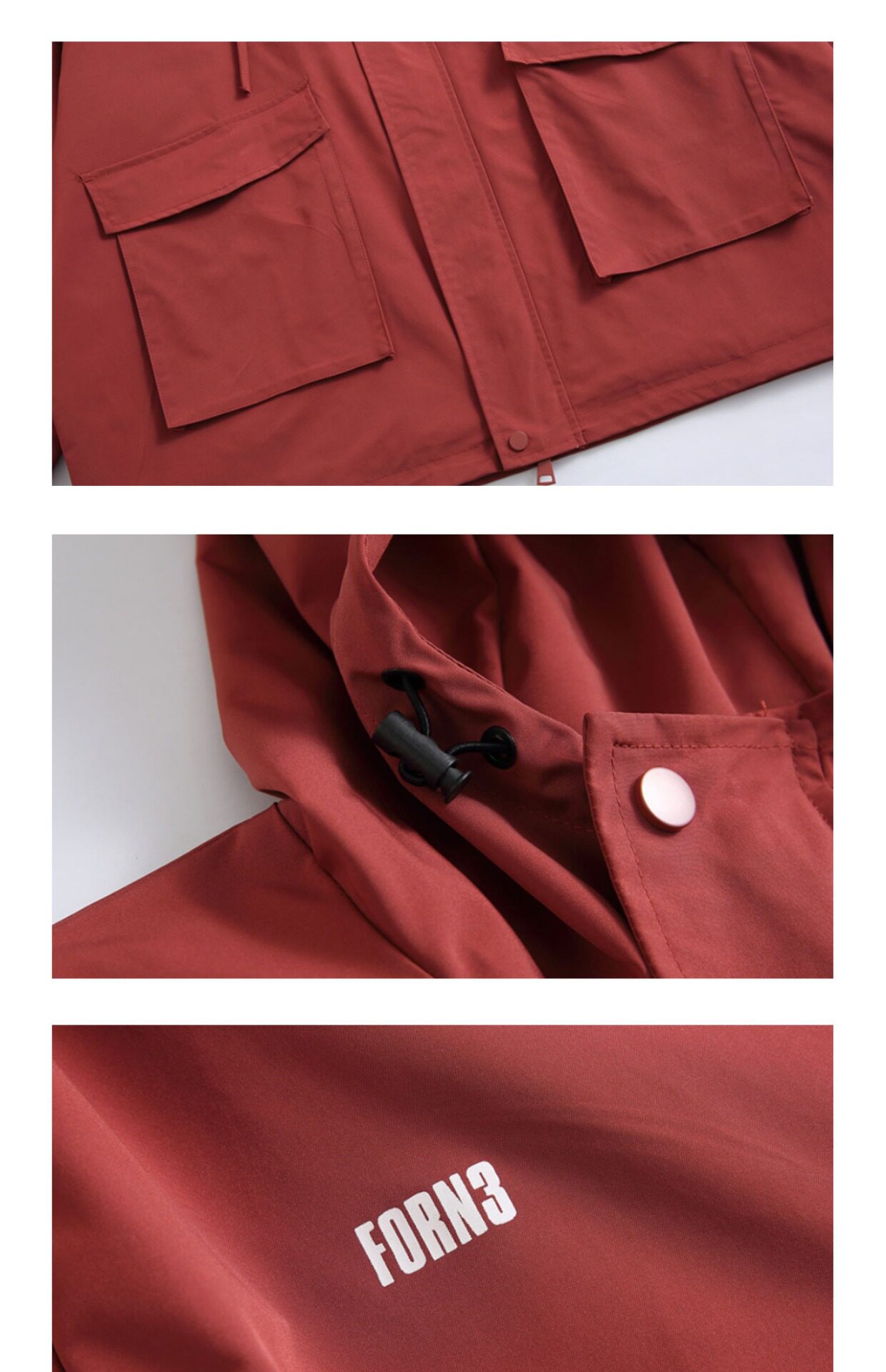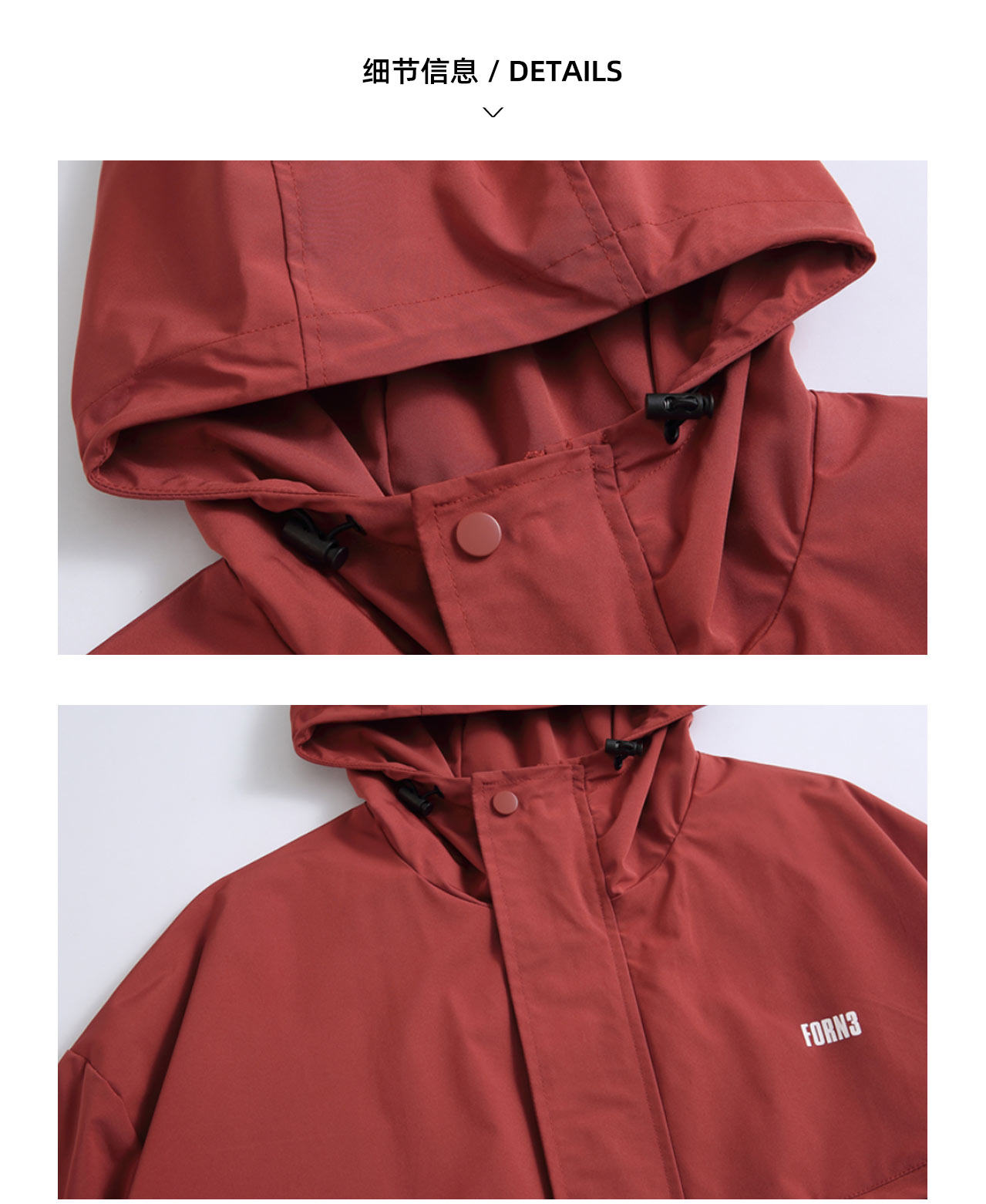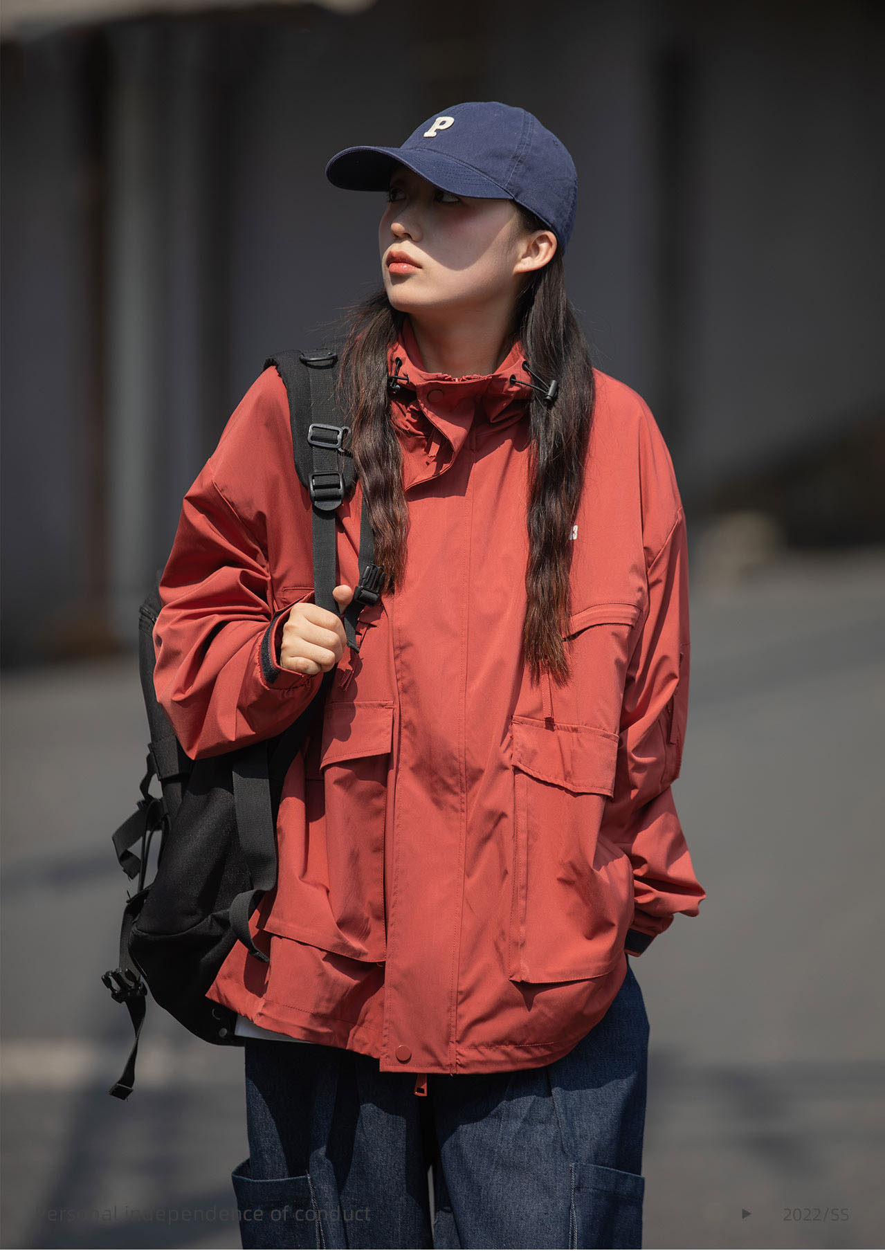 FOXIEODX戶外衝鋒衣女酒紅色工裝連帽外套登山多口袋寬鬆夾克棉服