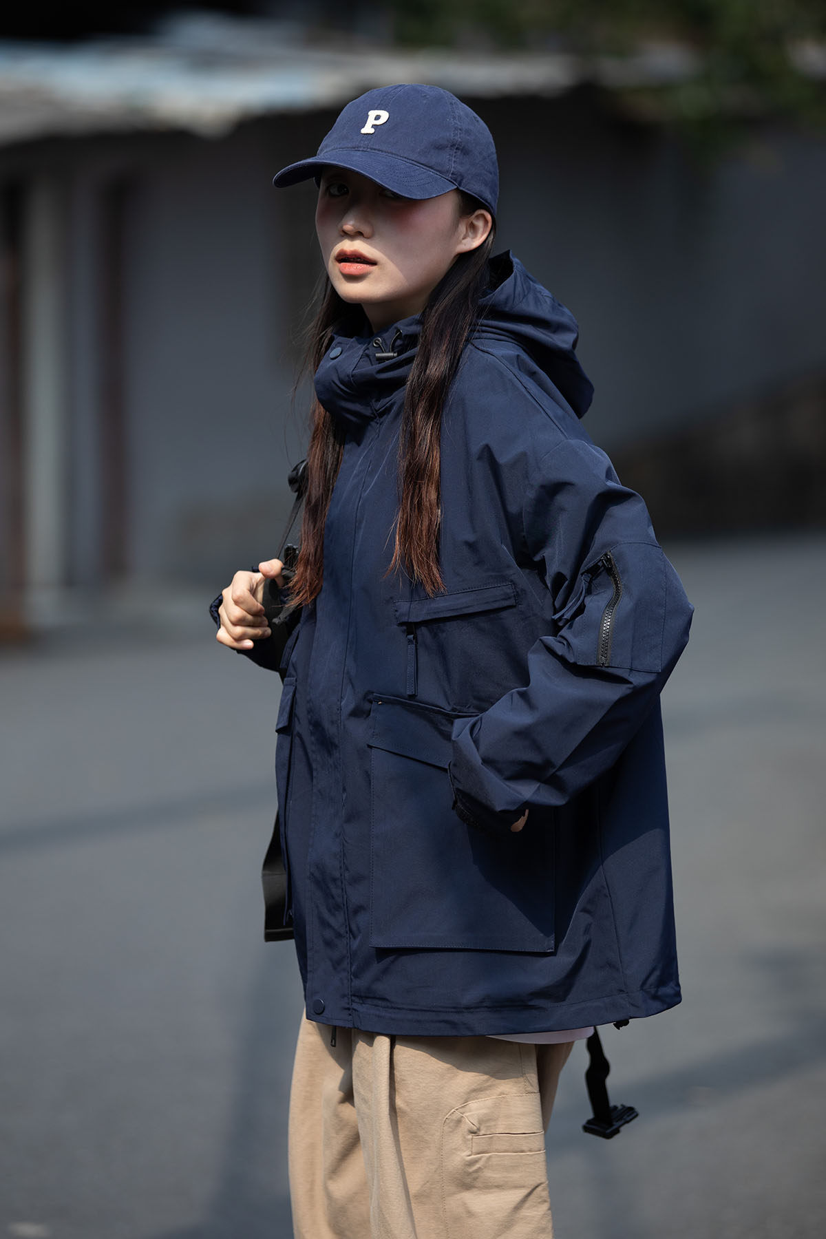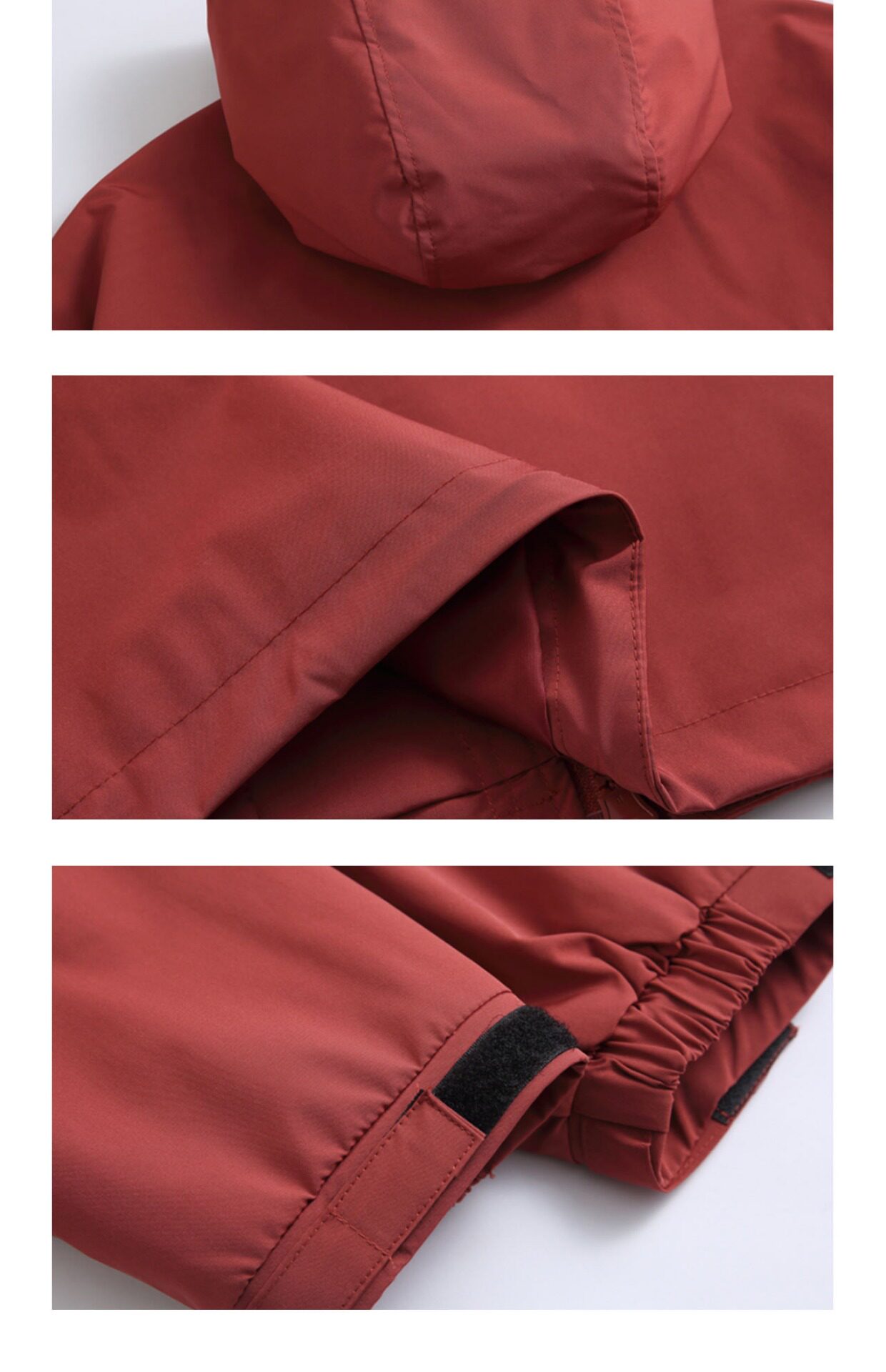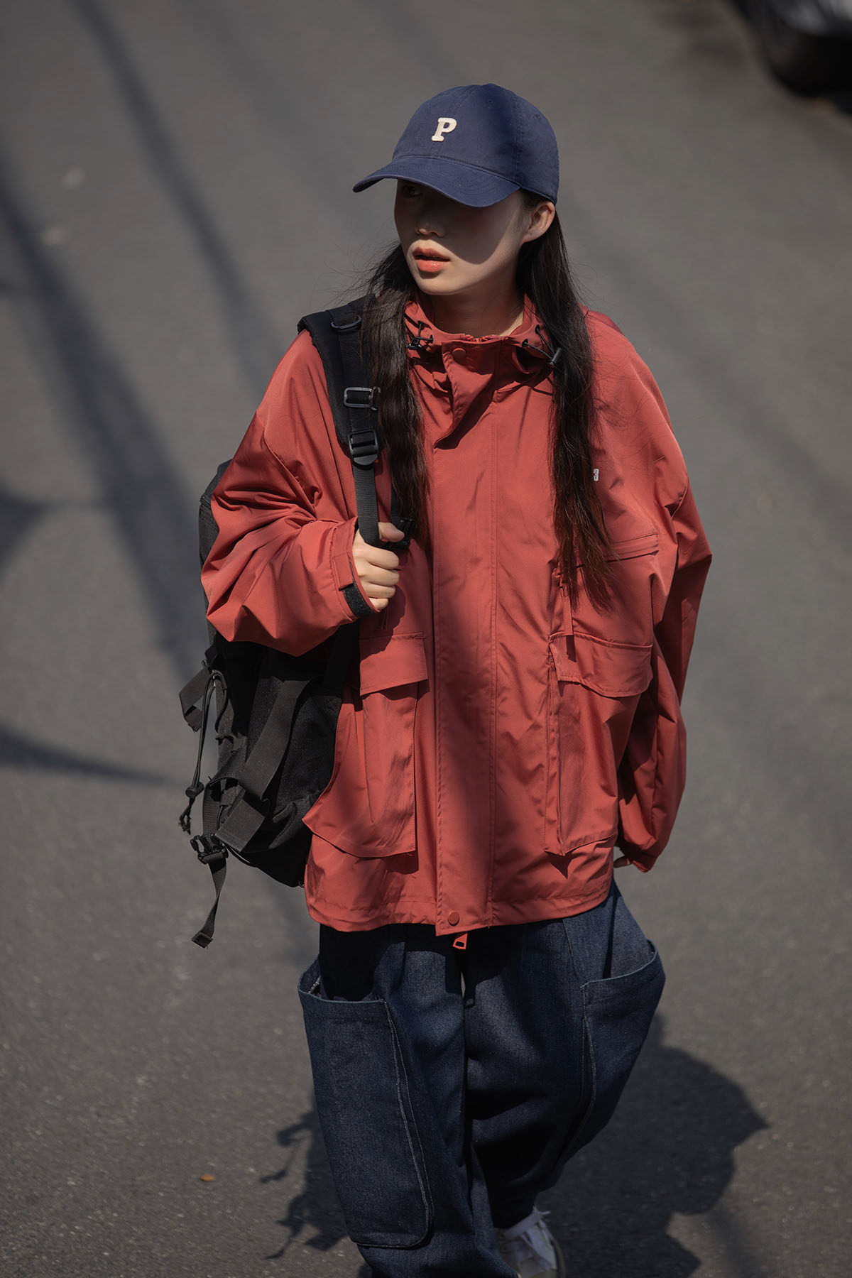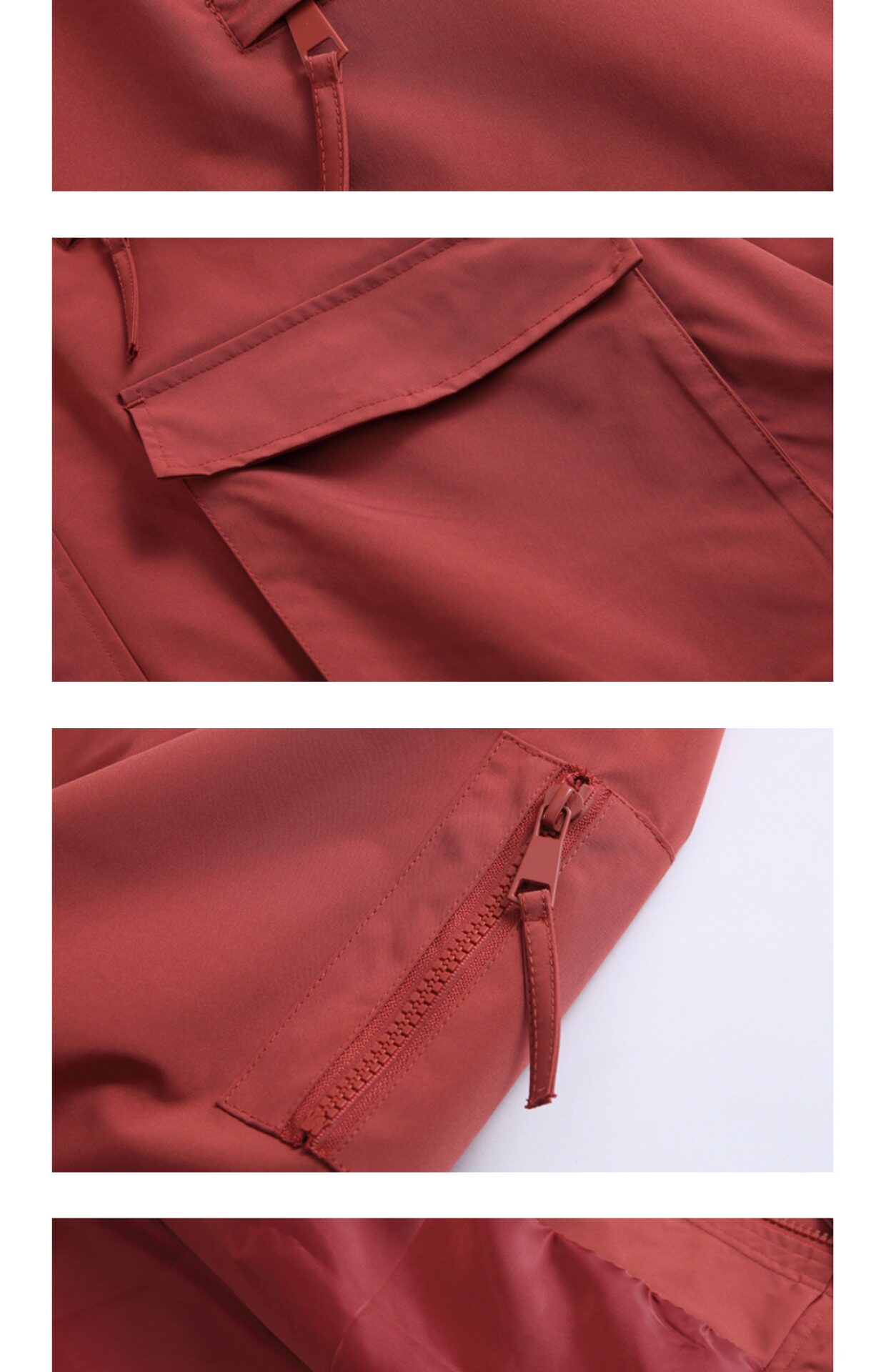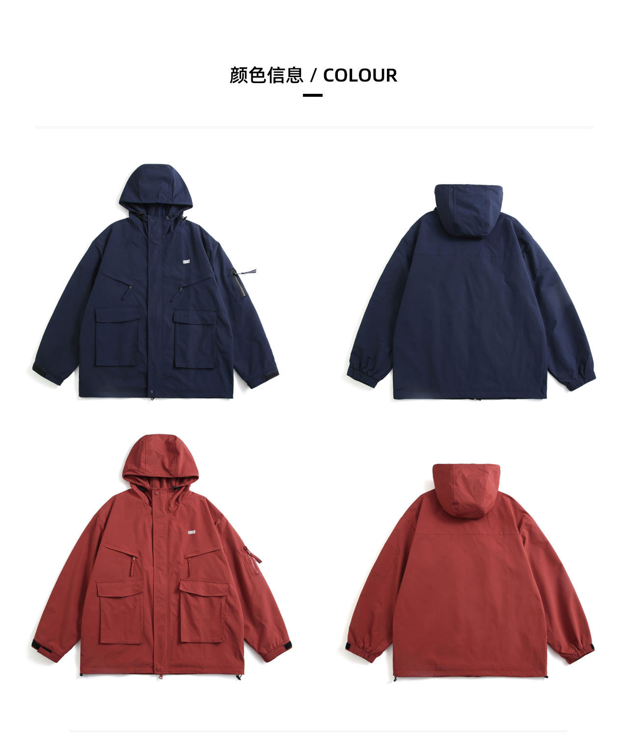 FOXIEODX戶外衝鋒衣女酒紅色工裝連帽外套登山多口袋寬鬆夾克棉服