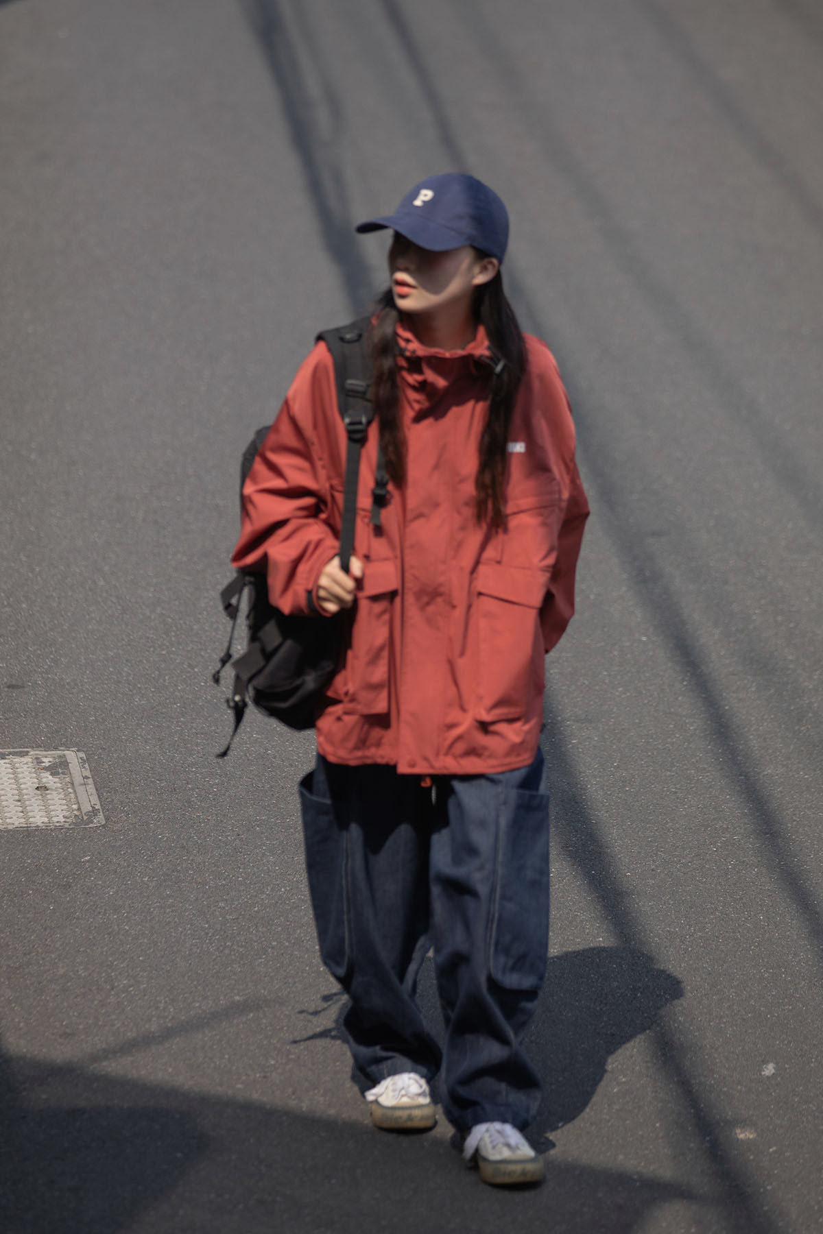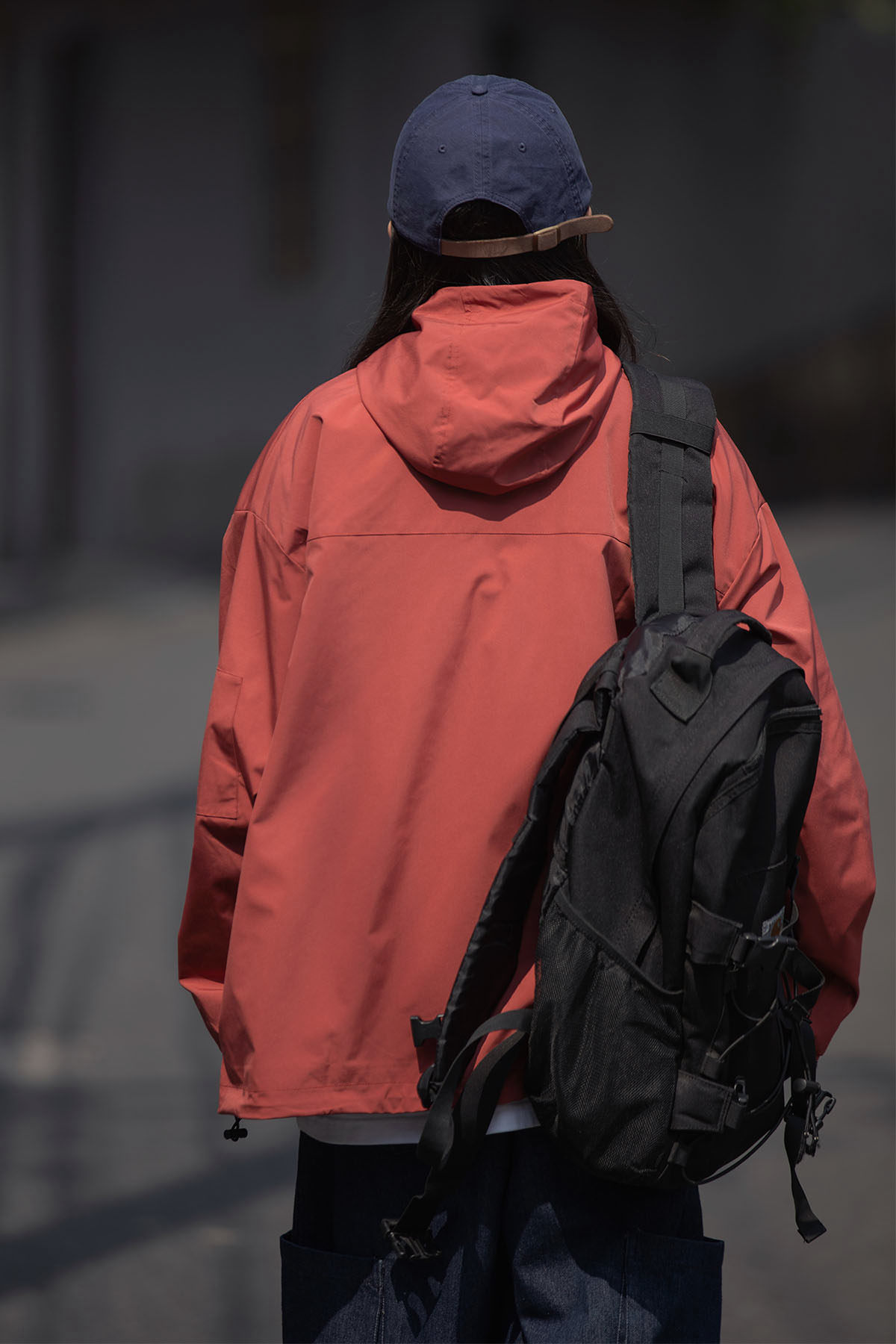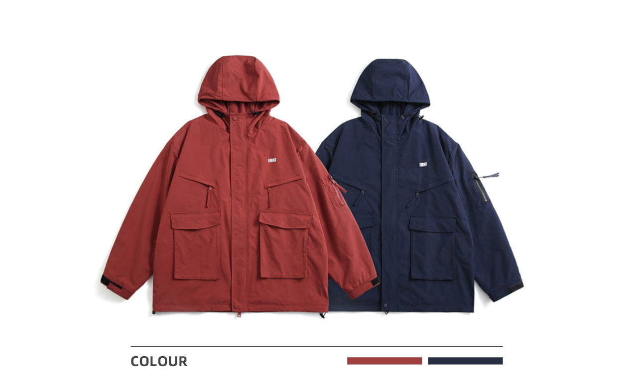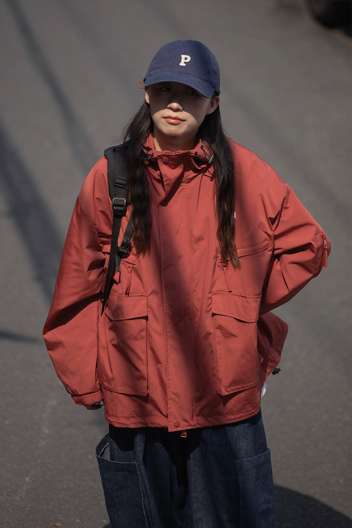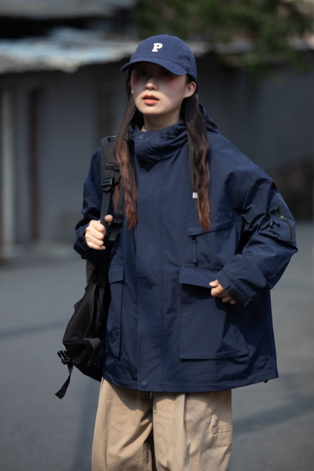 FOXIEODX戶外衝鋒衣女酒紅色工裝連帽外套登山多口袋寬鬆夾克棉服