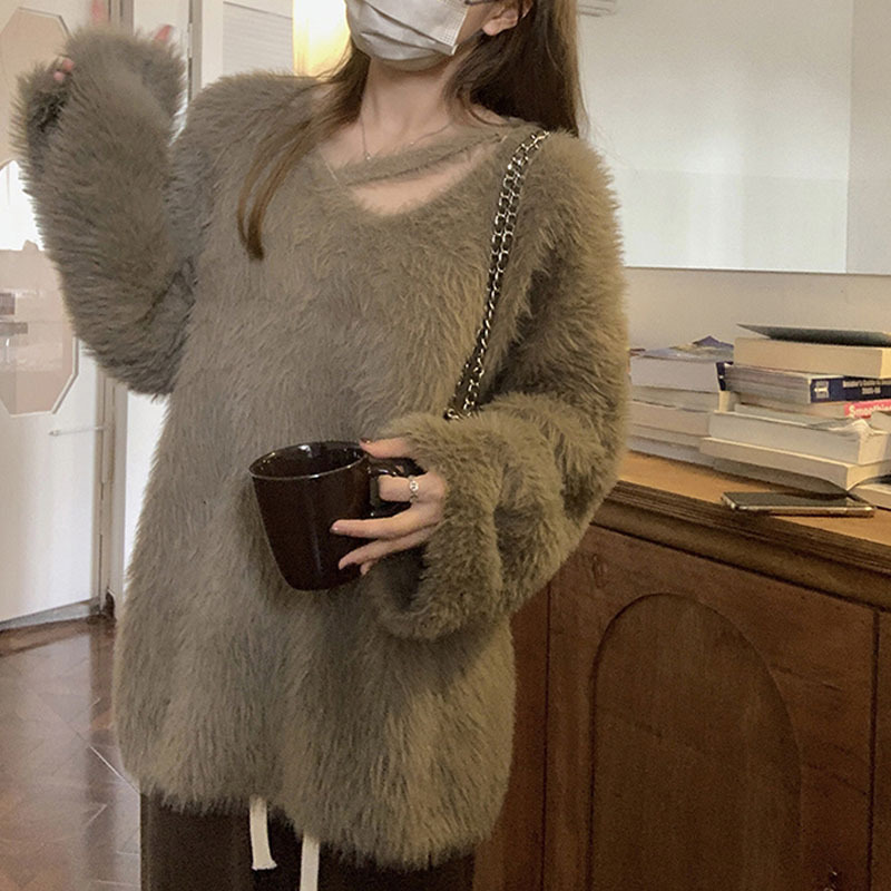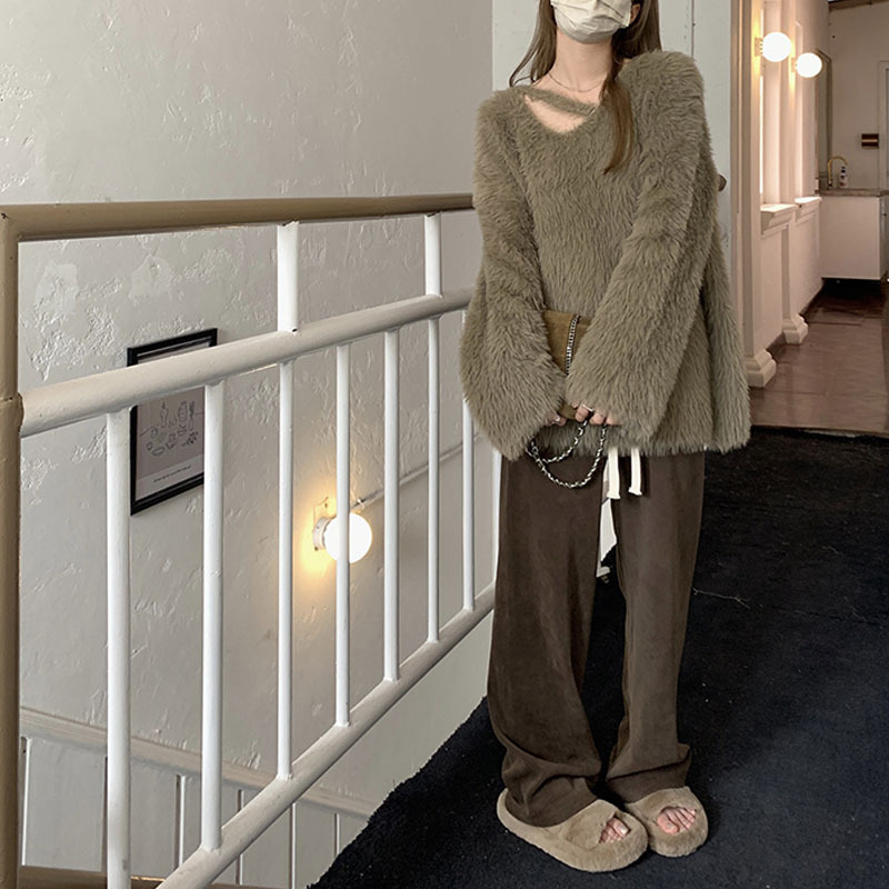 仿水貂绒软糯设计感针织衫上衣女秋冬新款外穿宽松奶呼呼V领毛衣