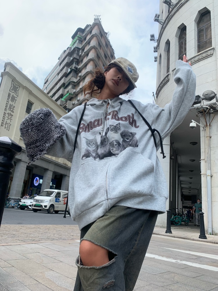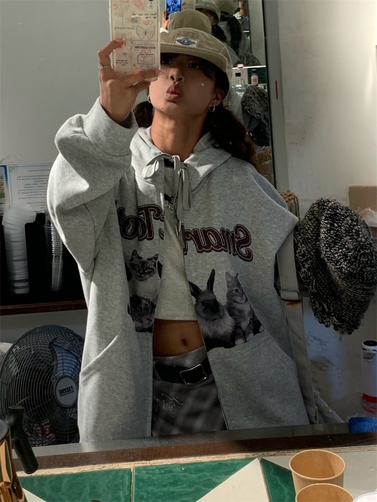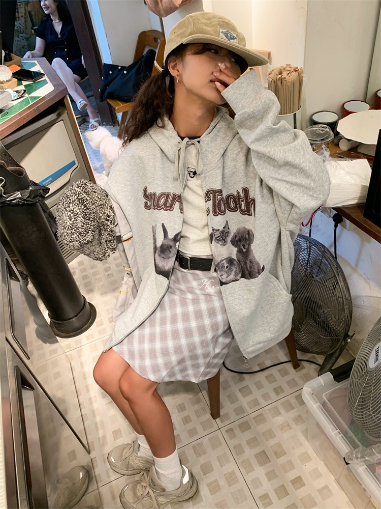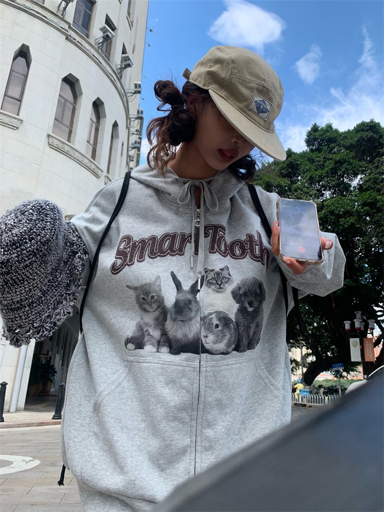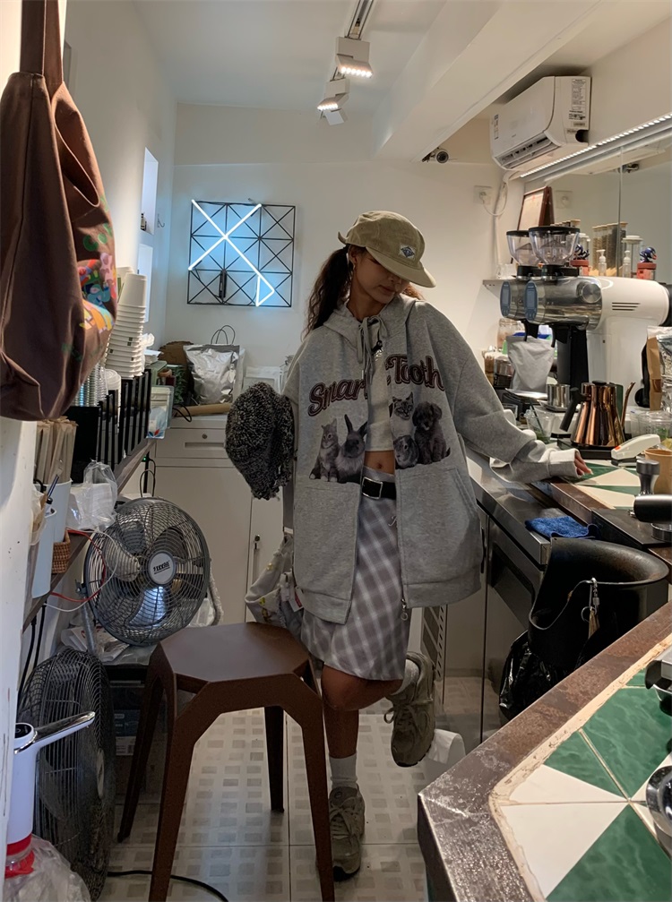 0918很秀自制 沈月同款原創狗狗印花拉鍊外套女秋冬美式連帽運動衫T