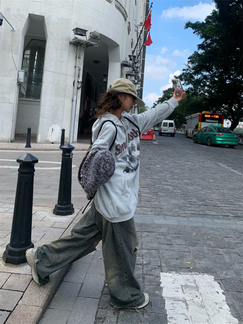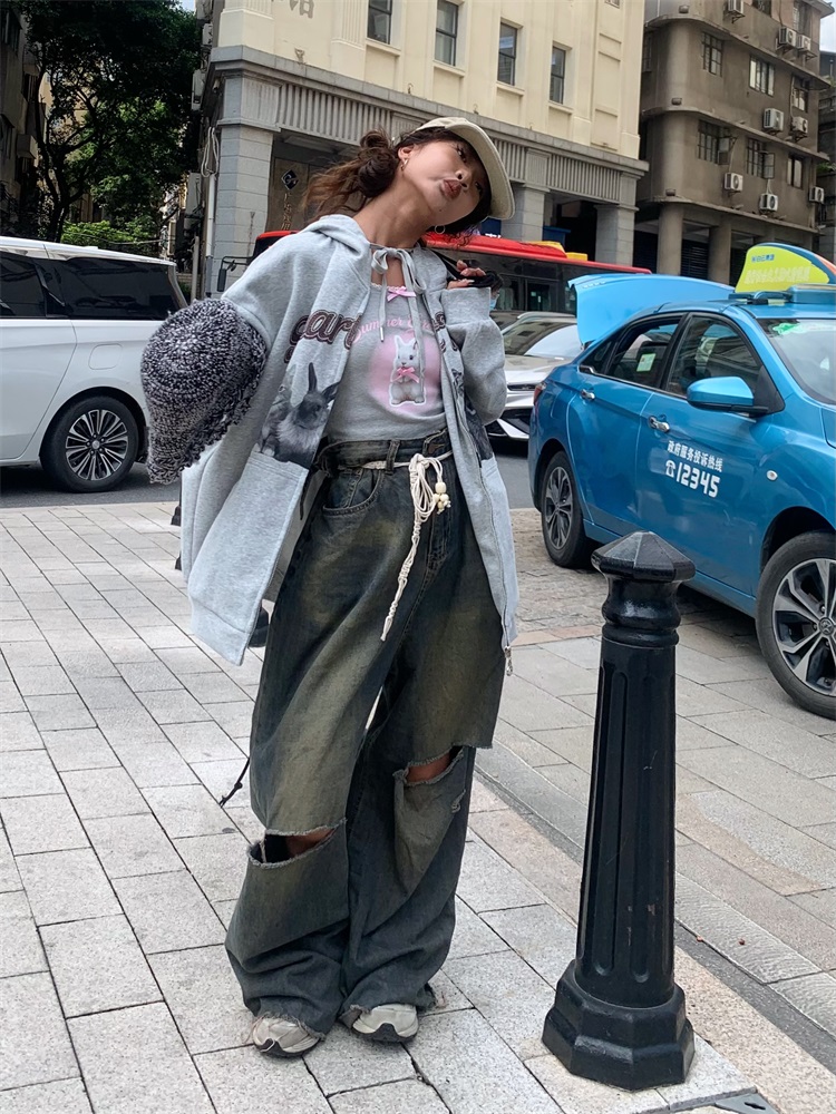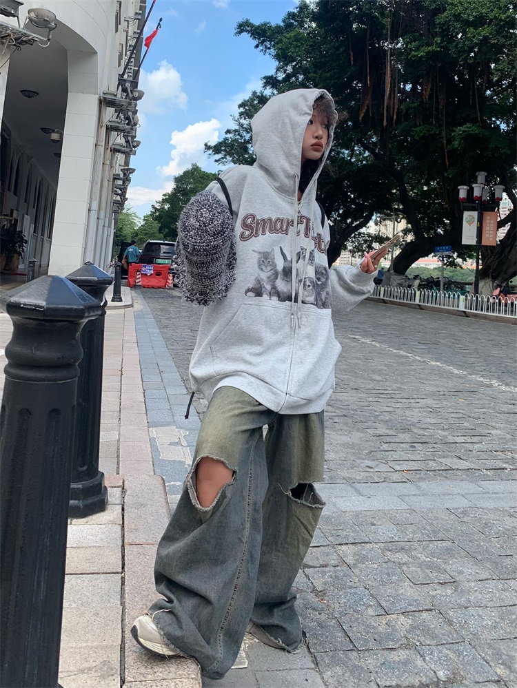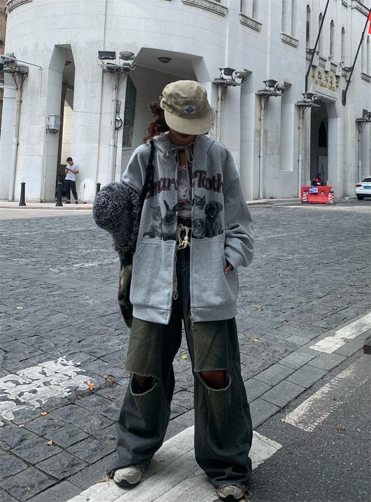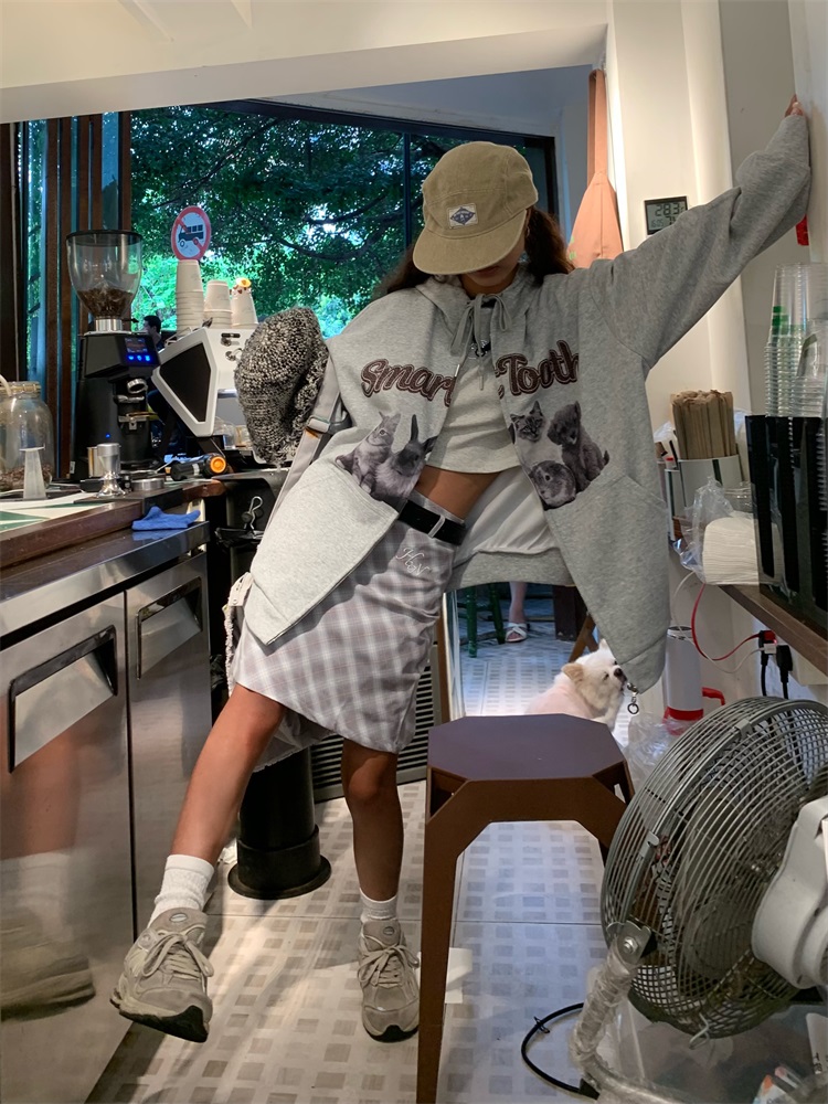 0918很秀自制 沈月同款原創狗狗印花拉鍊外套女秋冬美式連帽運動衫T