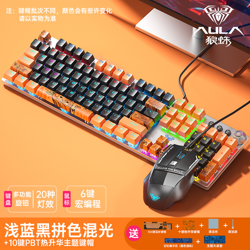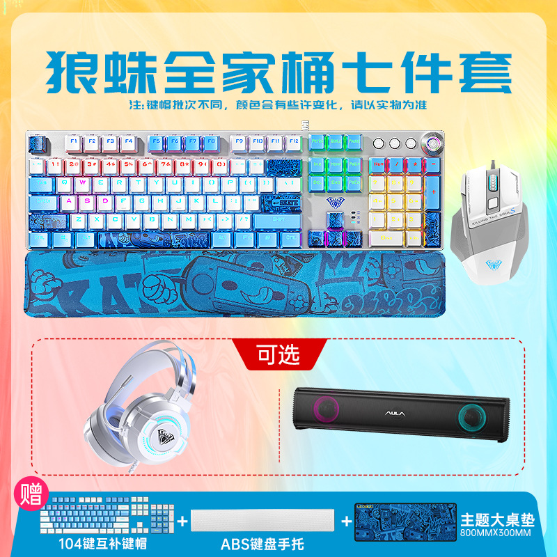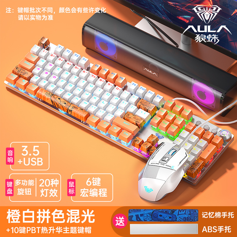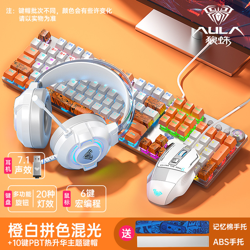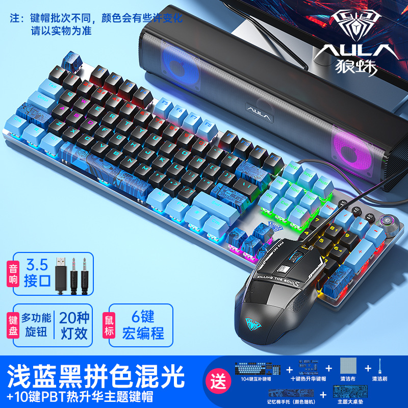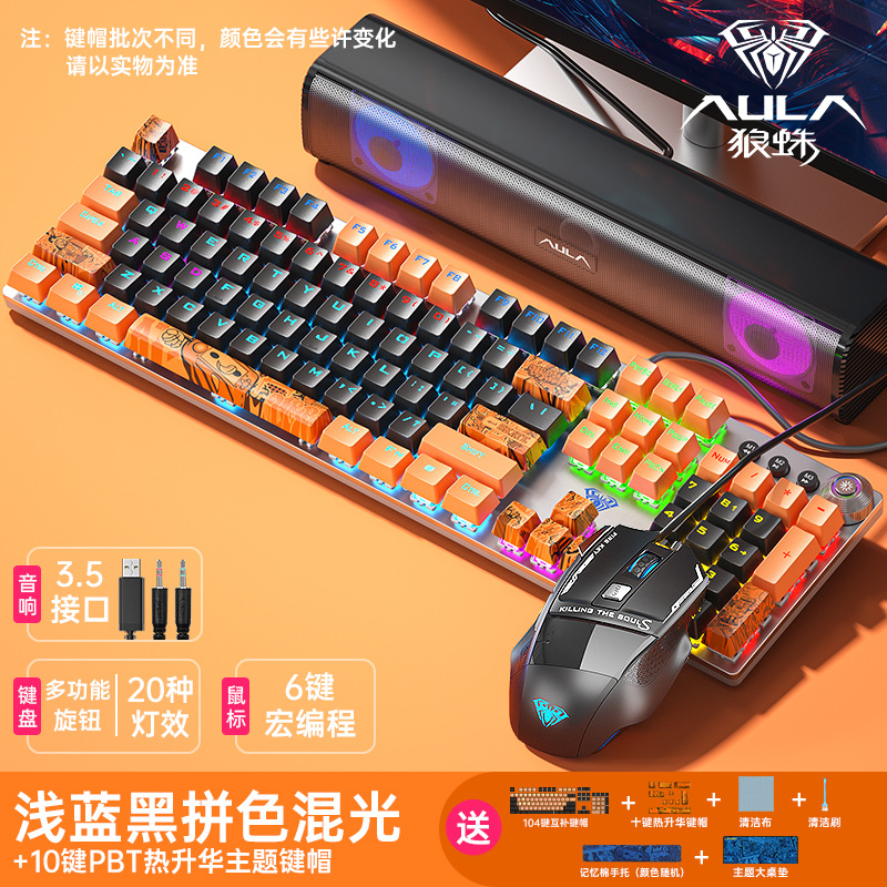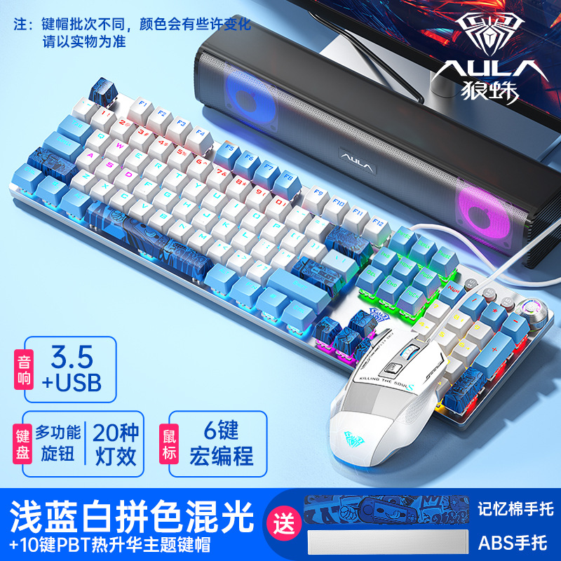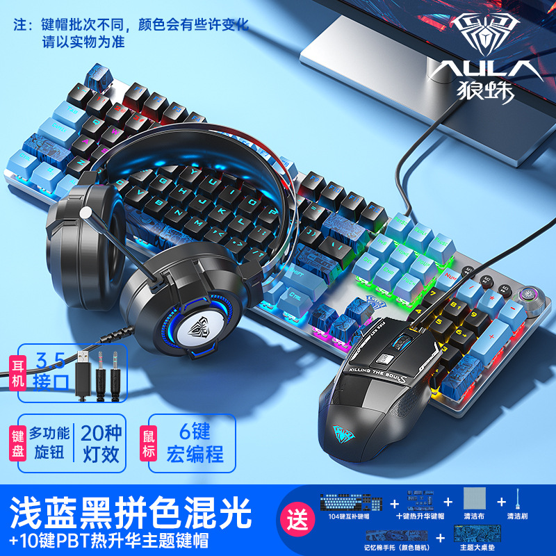 AULA/狼蛛机械键盘鼠标耳机三件套有线游戏键鼠音箱套装带手托