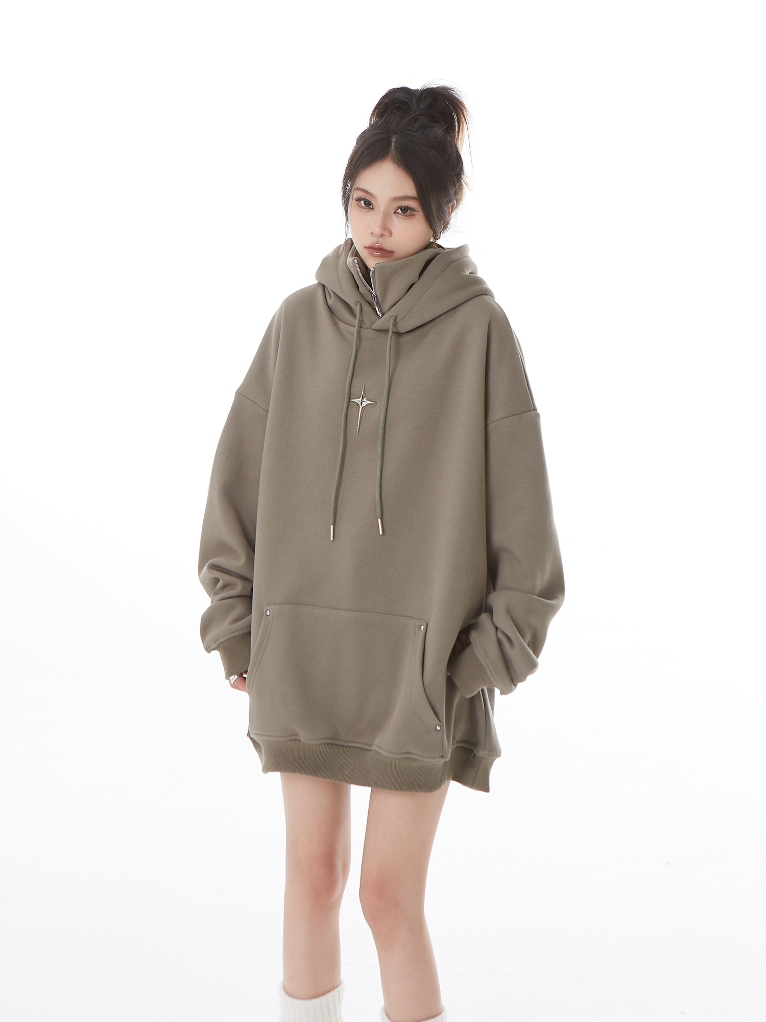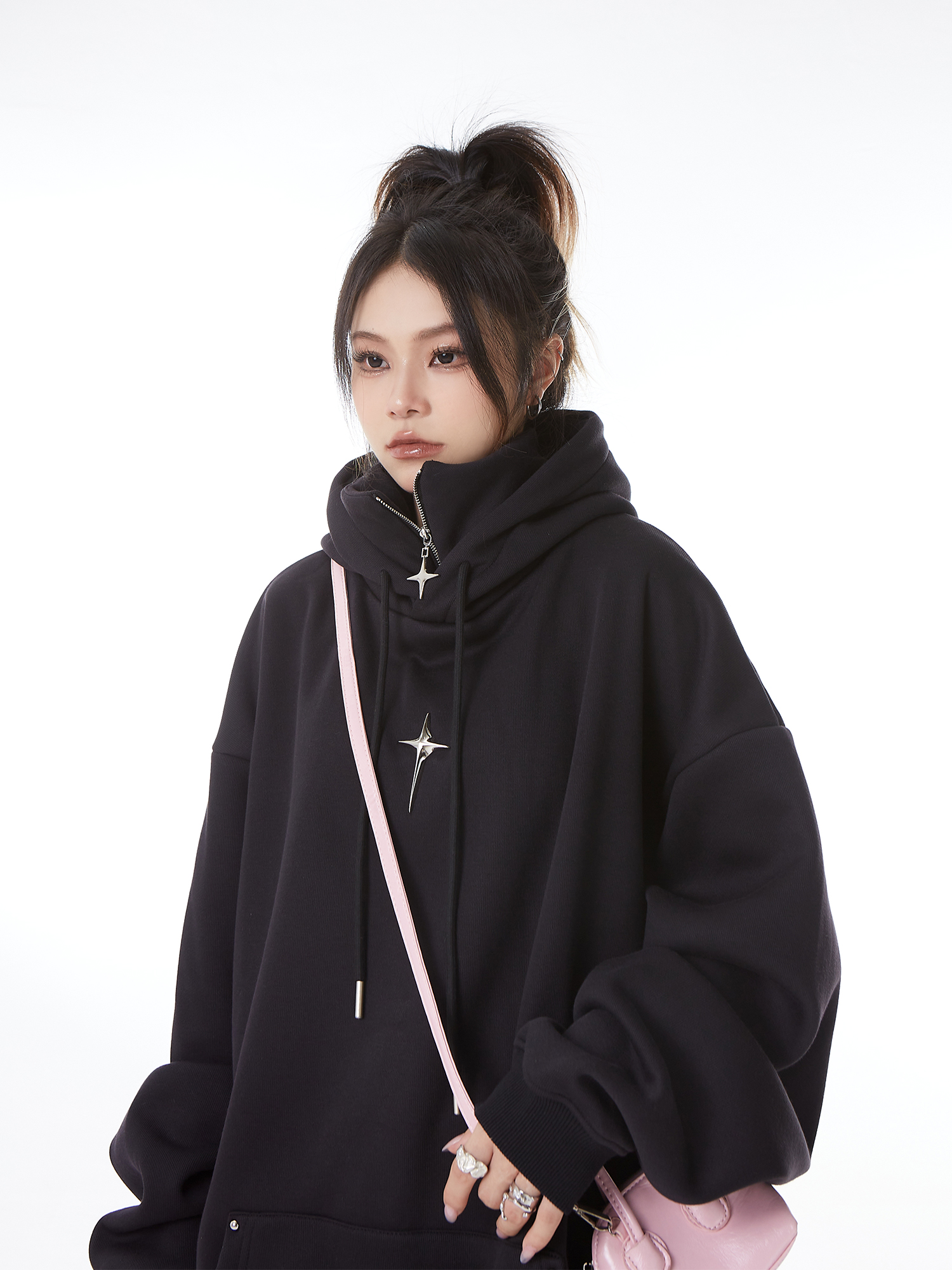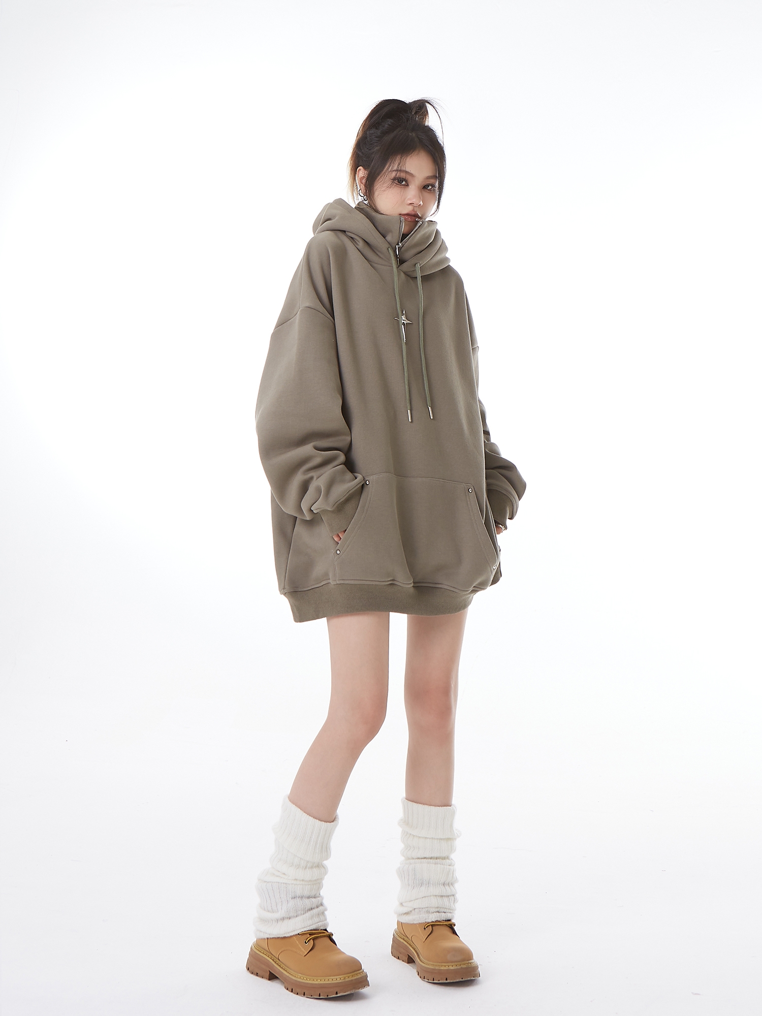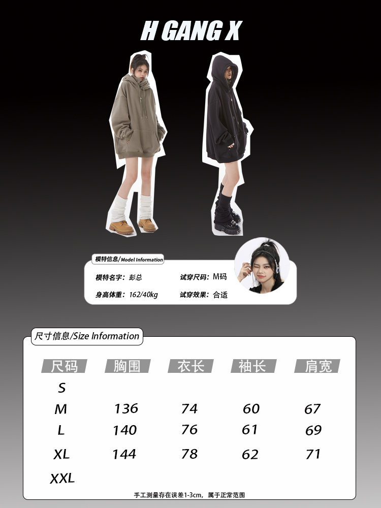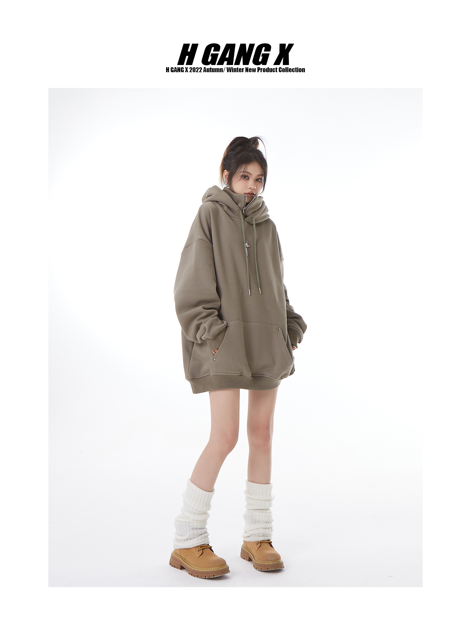 H GANG X設計感高領連帽運動衫女高級感秋冬加絨寬鬆情侶半拉鍊帽衫
