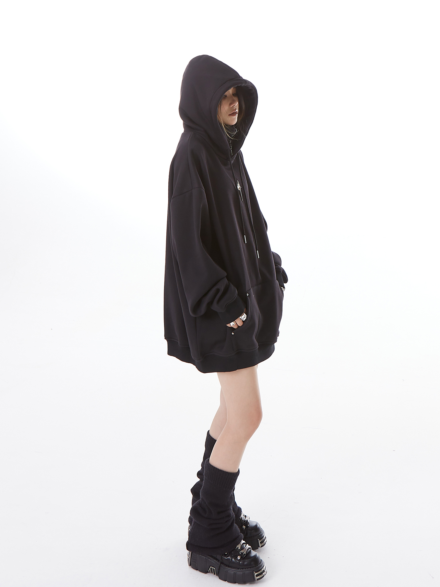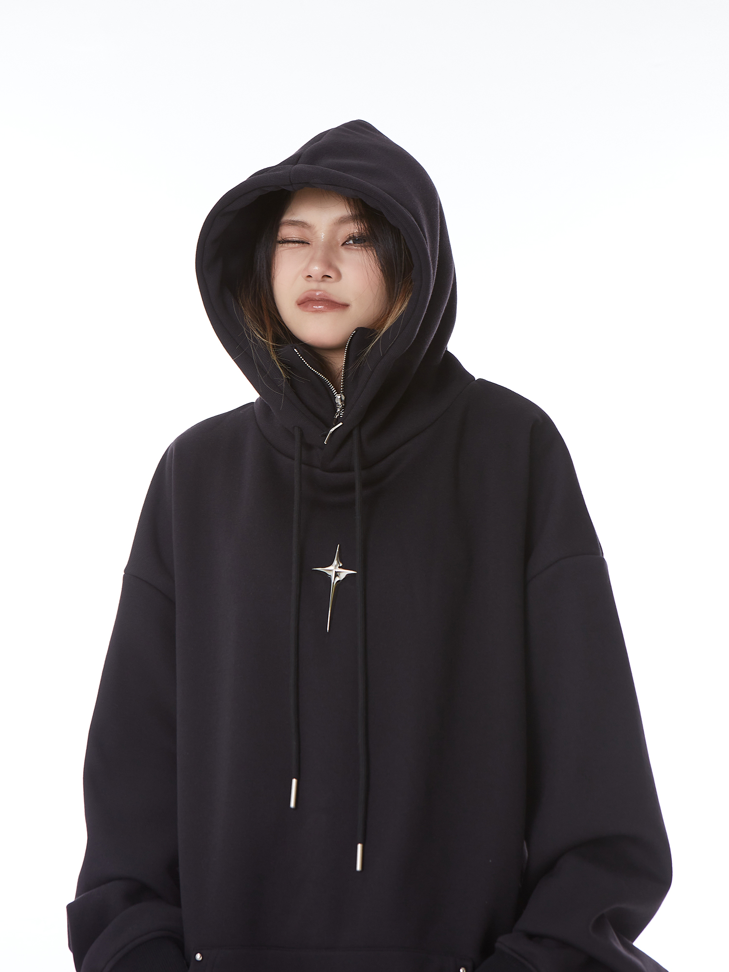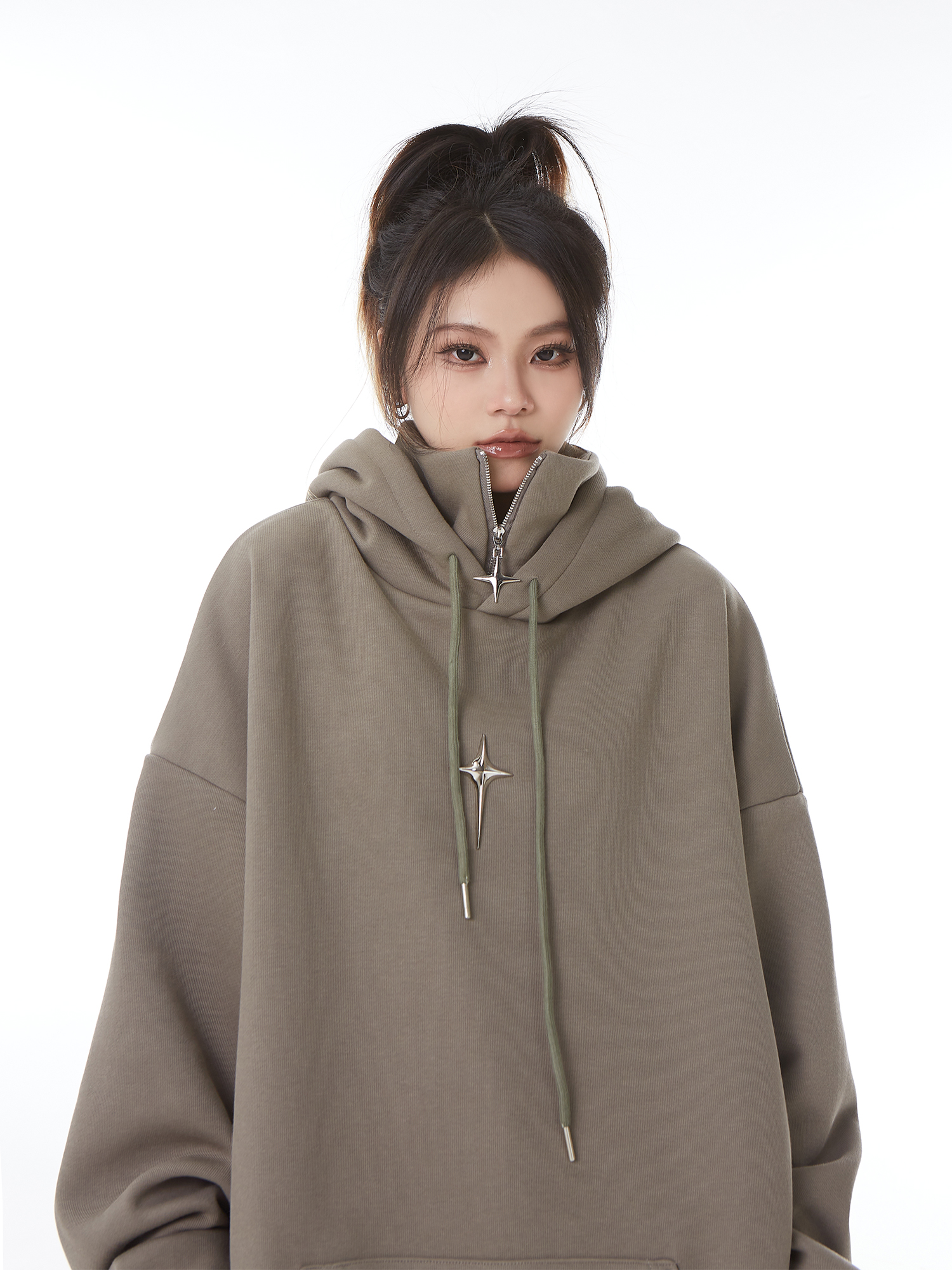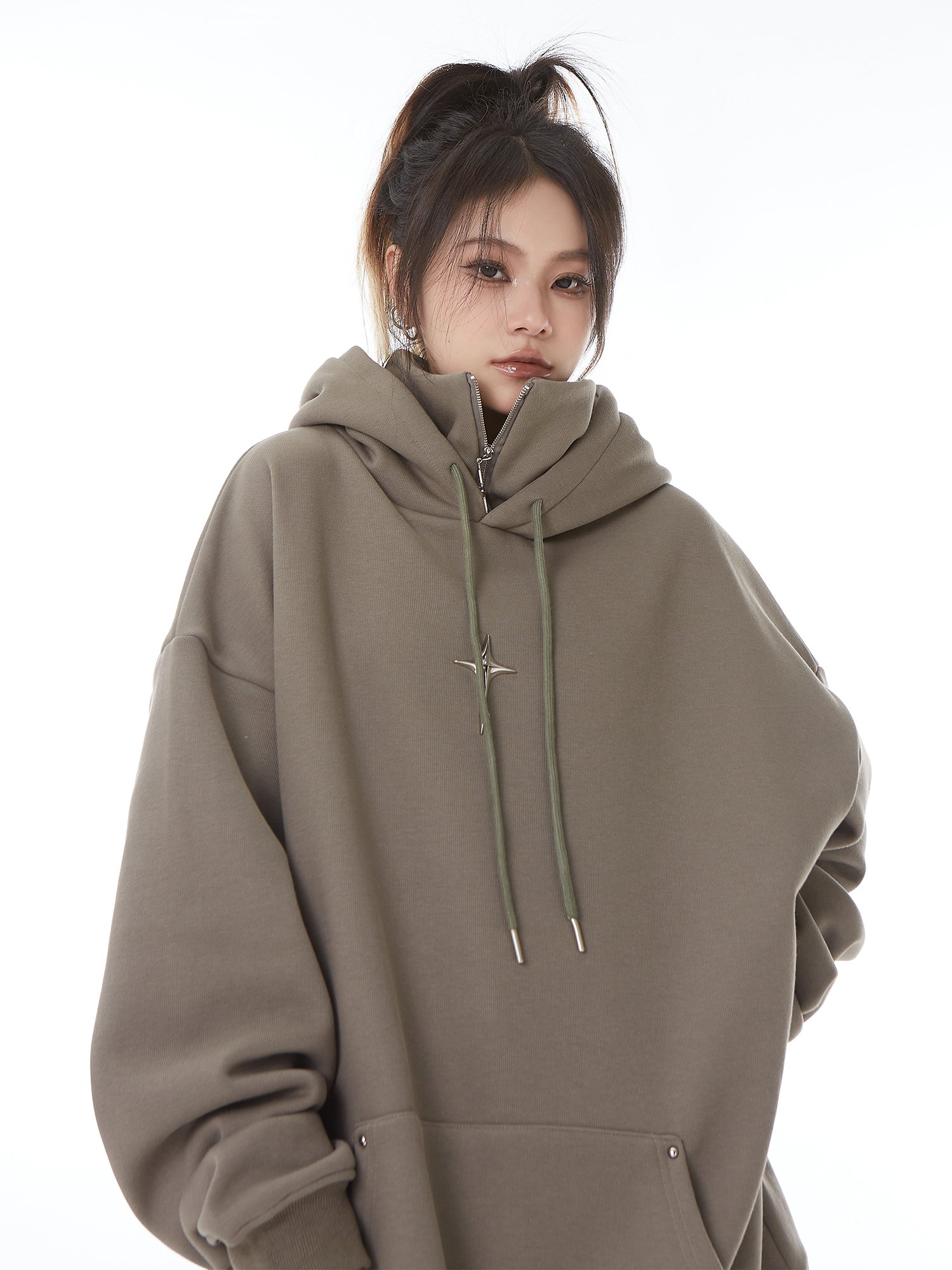 H GANG X設計感高領連帽運動衫女高級感秋冬加絨寬鬆情侶半拉鍊帽衫