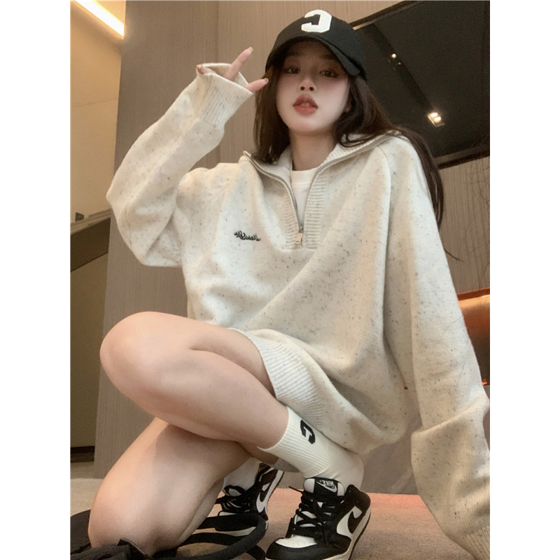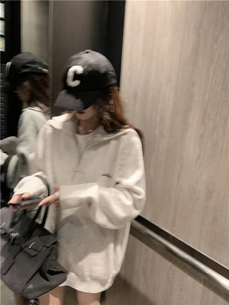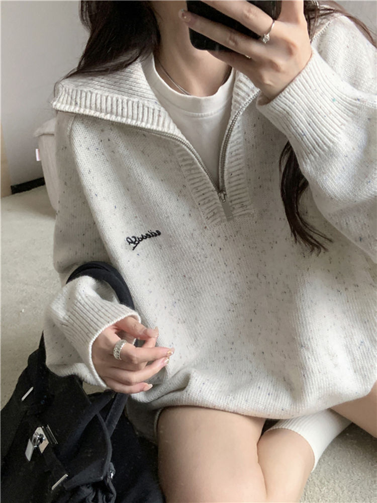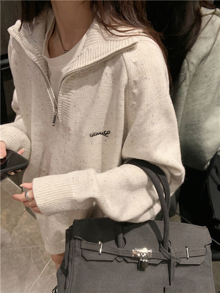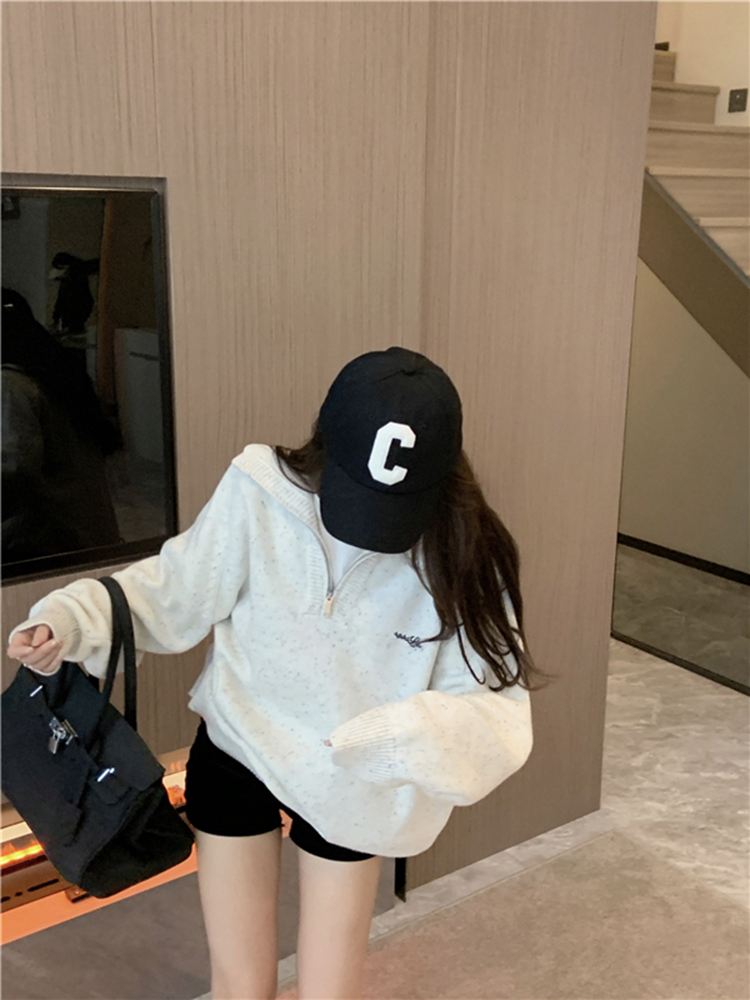 半拉鍊高級感套頭毛衣秋冬2023新款白色設計感慵懶風外套上衣女裝