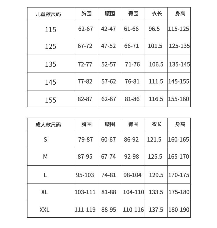 尺码 S,M,L,XL,XXL,115,125,135,145,155