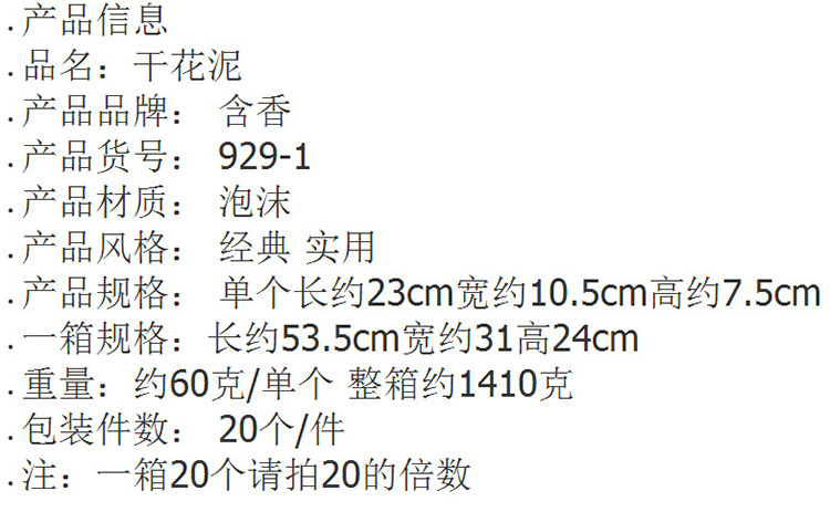 本厂主要生产鲜花泥,干花泥。花泥一箱20块装。