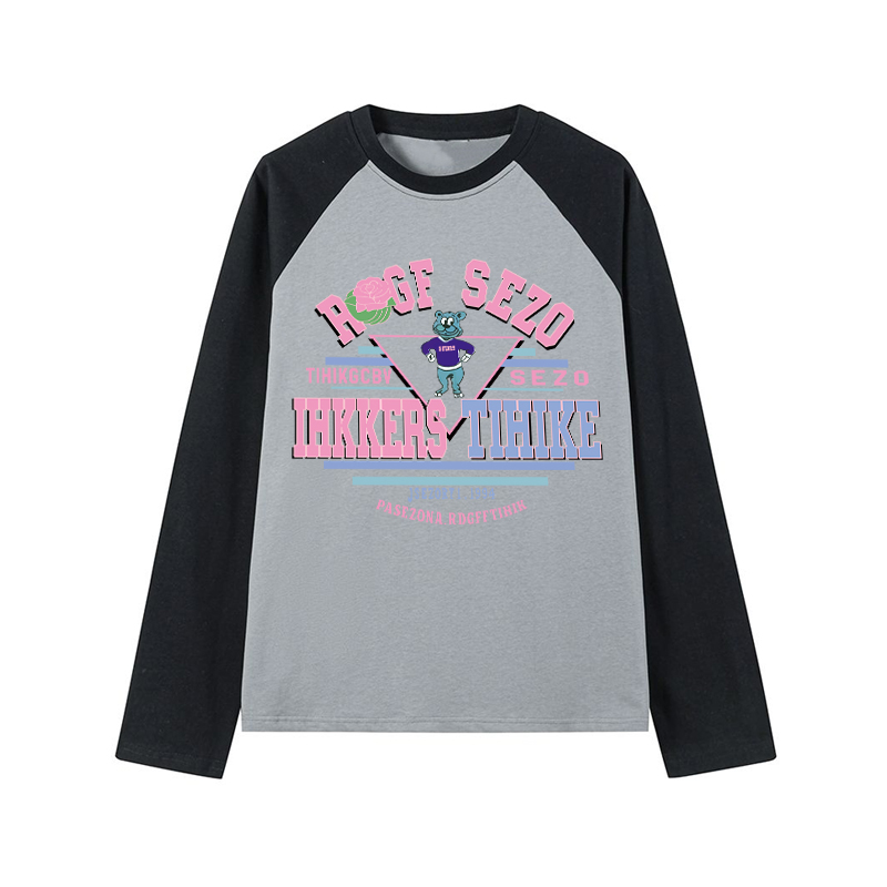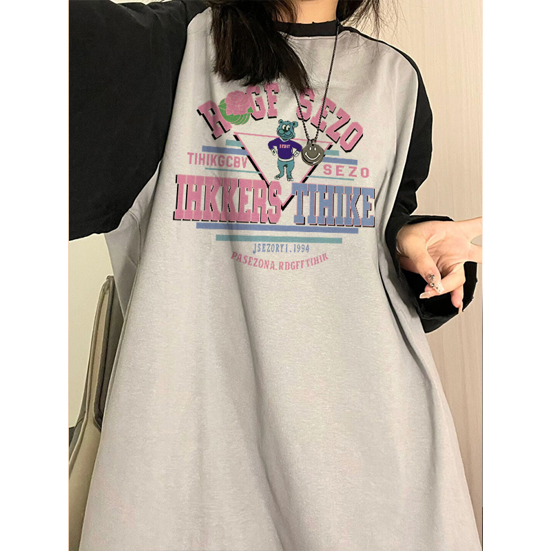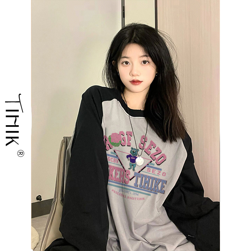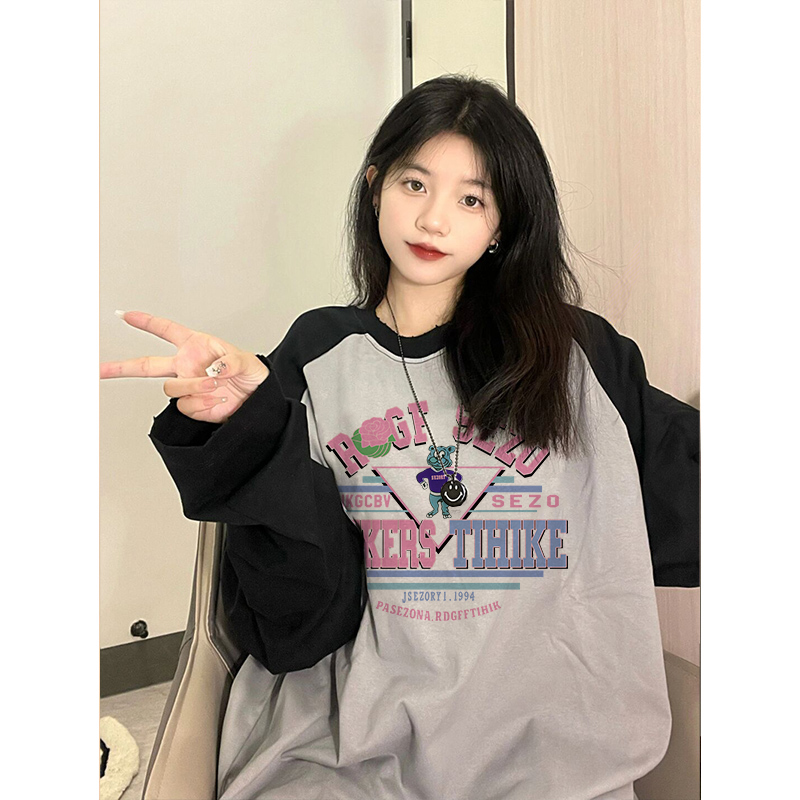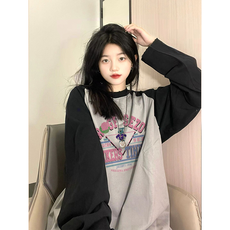 正肩美式復古港味chic插肩衛衣撞色假兩件長袖T恤女春日雜風上衣